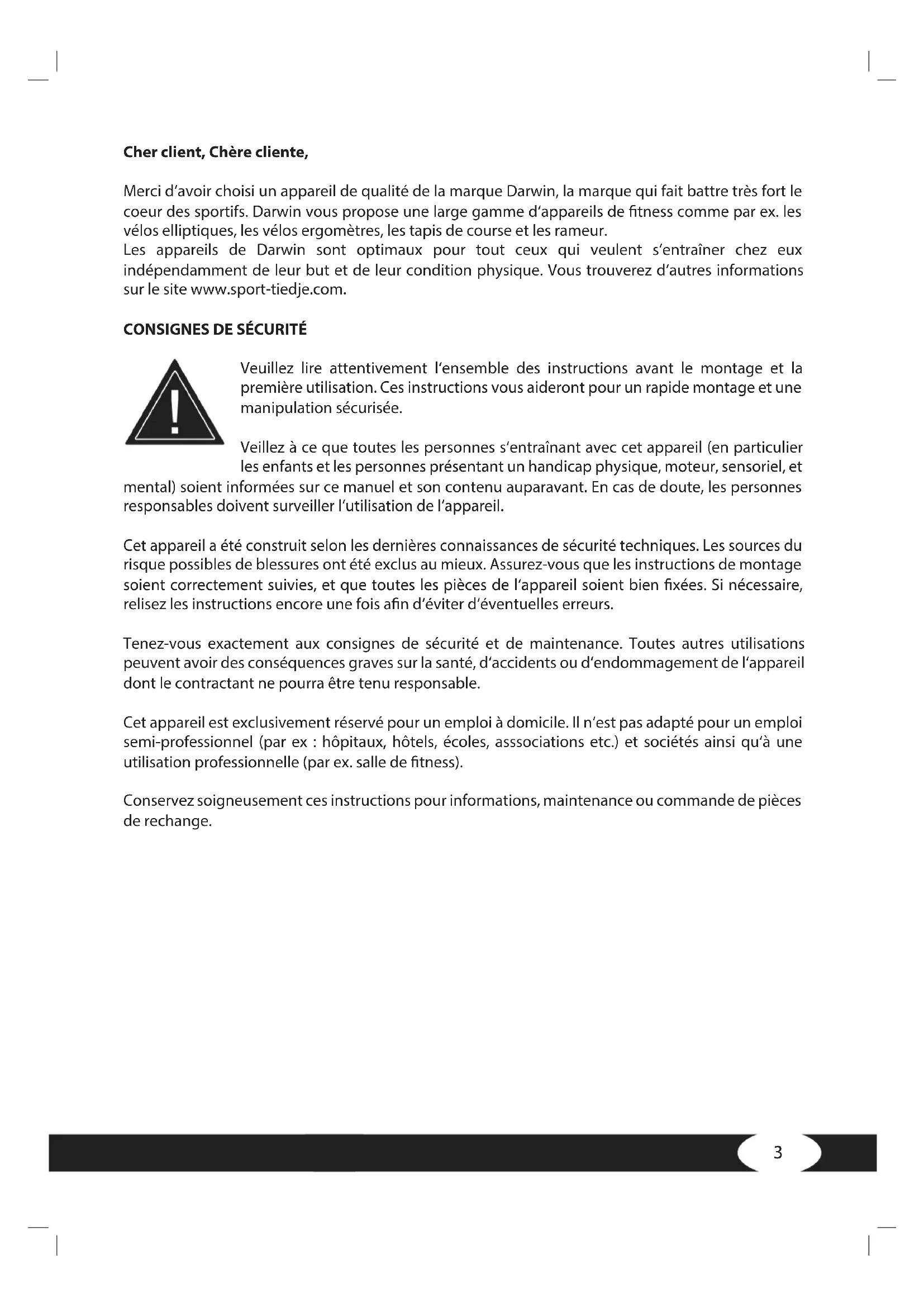 DFRM50.01.032 RM 503 RM 50 Cher client, Chère cliente, Merci d‘avoir choisi un appareil de qualité de la marque Darwin, la marque qui fait battre très fort le coeur des sportifs. Darwin vous propose une large gamme d‘appareils de tness comme par ex. les vélos elliptiques, les vélos ergomètres, les tapis de course et les rameur. Les appareils de Darwin sont optimaux pour tout ceux qui veulent s‘entraîner chez eux indépendamment de leur but et de leur condition physique. Vous trouverez d‘autres informations sur le site www.sport-tiedje.com.
