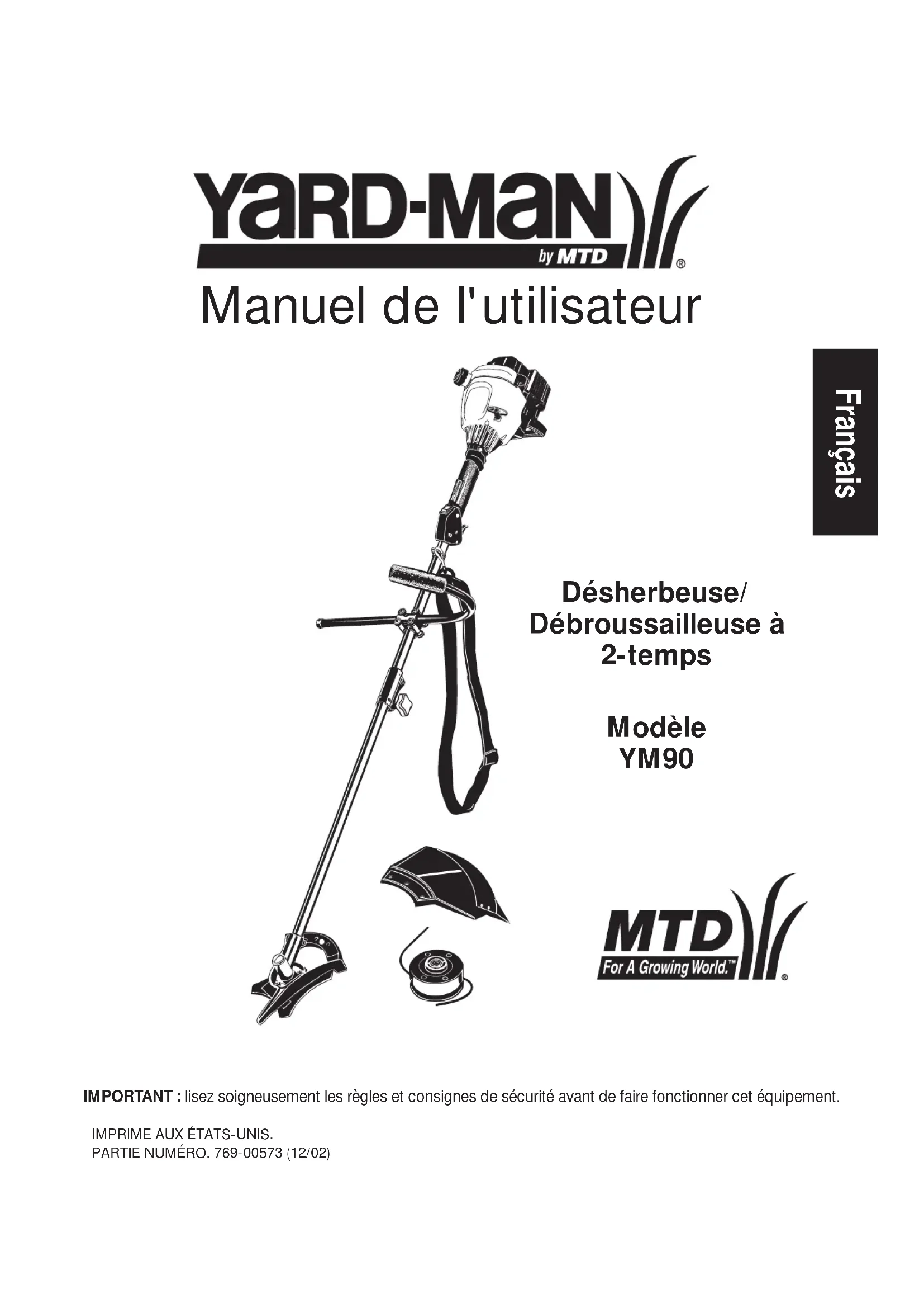 - Les composants suivants sont inclus dans la garantie relative au système antipollution du moteur : filtre à air, carburateur, poire d'amorçage, conduites de carburant, alimentation d'arrivée, filtre à carburant, module d'allumage, bougie et silencieux.GARANTIE LIMITÉE DU FABRICANT POUR: Aucune garantie implicite, y compris toute garantie de valeur marchande ou d’adaptation à une fin particulière, ne s’applique après la période applicable de garantie expresse écrite ci-dessus concernant les pièces qui sont identifiées. Aucune autre garantie ou caution expresse, écrite ou orale, à l’exception de celle mentionnée ci- dessus, accordée par toute personne ou entité, y compris tout distributeur ou détaillant, concernant tout produit n’engagera la responsabilité de MTD. Pendant la période destates garantie, le remède exclusif est la réparation ou le remplacement du produit dans les conditions énoncées ci- dessus. (Certains états ne permettent pas la limitation de la garantie implicite, il est donc possible que la limitation ci- dessus ne s’applique pas à vous.) Les clauses énoncées dans la présente Garantie constituent le recours unique et exclusif inhérent aux ventes. MTD ne sera en aucun cas tenue pour responsable de tout dommage indirect ou consécutif ou de dommages comprenant, entre autres mais pas seulement, les dépenses encourues du fait du recours à des services de remplacement ou de substitution pour l’entretien des pelouses, le transport ou des frais connexes, ou les frais entraînés par une location destinée à remplacer provisoirement un produit sous garantie. (Certains états ne permettent pas la limitation de la garantie implicite, il est donc possible que la limitation ci- dessus ne s’applique pas à vous.) Aucun recouvrement, quel qu’il soit, ne sera d’un montant supérieur au prix du produit vendu. Toute modification des dispositifs de sécurité du produit annulera la présente Garantie. Vous assumez tout risque et toute responsabilité résultant de la perte, de l’endommagement ou du préjudice que vous et votre propriété et/ou d’autres et leur propriété pourront encourir du fait de l’utilisation normale, de la mauvaise utilisation ou de l’empêchement d’utiliser le produit. La présente garantie limitée n’est accordée qu’à l’acheteur initial, au preneur initial ou à la personne à laquelle le produit a été offert. Le Droit des États vis à vis de la présente garantie : la présente garantie vous confère certains droits juridiques, et vous pouvez bénéficier d’autres droits, lesquels varient d’une juridiction à l’autre. Pour obtenir l’adresse du distributeur agréé le plus proche, composer le : 1-800-345-8746 aux États-Unis ou le 1-800-668-1238 au Canada. MTD LLC P.O. Box 361131 Cleveland, OH 44136-0019 La garantie limitée énoncée ci-après est accordée par MTD LLC (« MTD ») et concerne les marchandises neuves achetées et utilisées aux États-Unis, ainsi que dans leurs possessions et territoires. MTD garantit ce produit contre tout vice de matière ou de façon pendant une période de deux (2) ans à compter de la date d’achat initiale et elle se réserve le choix de réparer ou de remplacer, à titre gratuit, toute pièce présentant un vice de matière ou de façon. Cette garantie limitée nes’ appliquera que dans la mesure où le produit aura été utilisé et entretenu conformément au Guide de l’utilisateur fourni avec le produit et n’aura pas fait l’objet d’un usage inadéquat, abusif, commercial ou négligent, d’un accident, d’un entretien inadéquat, d’une modification, de vandalisme, d’un vol, d’un incendie, de dégâts d’eau ou d’un endommagement résultant d’un autre péril ou d’un désastre naturel. Les dommages résultats de l’installation ou de l’utilisation de tout accessoire ou équipement non approuvé par MTD pour une utilisation avec le(s) produit(s) couvert(s) par le présent guide annuleront la garantie et ce qui concerne les dommages qui en résulteraient éventuellement.La présente garantie est limitée à quatre-vingt-dix (90) jours à compter de la date d’achat au détail initiale pour tout produit MTD utilisé à des fins locatives ou commerciales, ou toute utilisation produisant des revenus. POUR L’ENTRETIEN-DÉPANNAGE : l’Entretien-dépannage au titre de la garantie est disponible, SUR PRÉSENTATION DE PREUVE D’ACHAT, AUPRÈS DU DISTRIBUTEUR AGRÉÉ LOCAL. Pour obtenir le nom du distributeur agréé local, consulter les Pages Jaunes ou se mettre en rapport avec le Service après-vente de MTD LLC. en appelant le 1-800-345- 8746 ou en écrivant au P.O. Box 361131, Cleveland OH 44136-0019 ou en appelant le 1-800-668-1238 au Canada. Aucun produit retourné à l’usine sans permission écrite préalable du service après-vente de MTD LLC ne sera accepté. La garantie limitée n’offre aucune couverture dans les cas suivants : A. Mises au point – Bougies, réglages de carburateur, filtres. B. Articles d’usure – Bouton de butée, bobines extérieures, fil de coupe, bobines intérieures, poulie de démarrage, cordes de démarrage, courroies d’entraînement. C. MTD n’accorde aucune garantie pour les produits vendus ou exportés des États-Unis, de leurs possessions et territoires, exception faite en ce qui concerne les produits vendus par l’intermédiaire de ses canaux agréés de distribution à l’exportation. MTD se réserve la droit de modifier ou d’améliorer la conception de tout produit MTD sans assumer l’obligation de modifier tout produit d’une fabrication plus ancienne.Manuel del Dueño/Operador Español IMPORTANTE: Lea las instrucciones y normas de seguridad detenidamente antes de usar el equipo. Recortador/ Cortamalezas de 2-Tiempos Modelo YM90