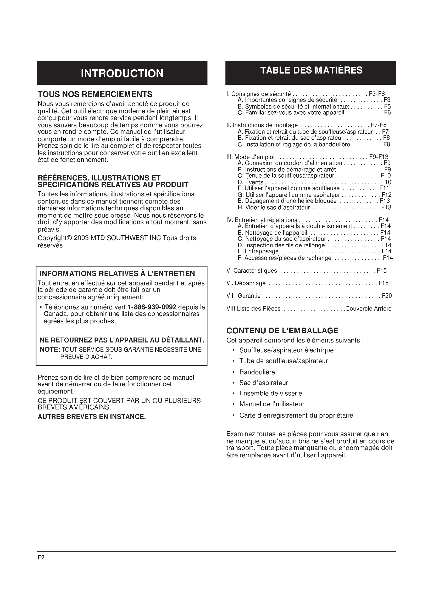 I. Consignes de sécurité . . . . . . . . . . . . . . . . . . . . . . . F3-F6A. Importantes consignes de sécurité . . . . . . . . . . . . . F3B. Symboles de sécurité et internationaux . . . . . . . . . . F5C. Familiarisez-vous avec votre appareil . . . . . . . . . . . F6II. Instructions de montage . . . . . . . . . . . . . . . . . . . . . F7-F8A. Fixation et retrait du tube de souffleuse/aspirateur . . F7B. Fixation et retrait du sac d'aspirateur . . . . . . . . . . . F8C. Installation et réglage de la bandoulière . . . . . . . . . F8III. Mode d'emploi . . . . . . . . . . . . . . . . . . . . . . . . . . . . F9-F13A. Connexion du cordon d'alimentation . . . . . . . . . . . . F9B. Instructions de démarrage et arrét . . . . . . . . . . . . . . F9C. Tenue de la souffleuse/aspirateur . . . . . . . . . . . . . F10D. Évents . . . . . . . . . . . . . . . . . . . . . . . . . . . . . . . . . . . F10F. Utiliser l'appareil comme souffleuse . . . . . . . . . . . F11G. Utiliser l'appareil comme aspirateur . . . . . . . . . . . . F12B. Dégagement d'une hélice bloquée . . . . . . . . . . . . F13H. Vider le sac d’aspirateur . . . . . . . . . . . . . . . . . . . . . F13IV. Entretien et réparations . . . . . . . . . . . . . . . . . . . . . . . . F14A. Entretien d’appareils à double isolement . . . . . . . . F14B. Nettoyage de l’appareil . . . . . . . . . . . . . . . . . . . . . F14C. Nettoyage du sac d’aspirateur . . . . . . . . . . . . . . . . F14D. Inspection des fils de rallonge . . . . . . . . . . . . . . . . F14E. Entreposage . . . . . . . . . . . . . . . . . . . . . . . . . . . . . F14F. Accessoires/pièces de rechange . . . . . . . . . . . . . . .F14V. Caractéristiques . . . . . . . . . . . . . . . . . . . . . . . . . . . . . F15VI. Dépannage . . . . . . . . . . . . . . . . . . . . . . . . . . . . . . . . . F15VII. Garantie . . . . . . . . . . . . . . . . . . . . . . . . . . . . . . . . . . . . F20VIII.Liste des Pièces . . . . . . . . . . . . . . . . . . .Couvercle Arriére