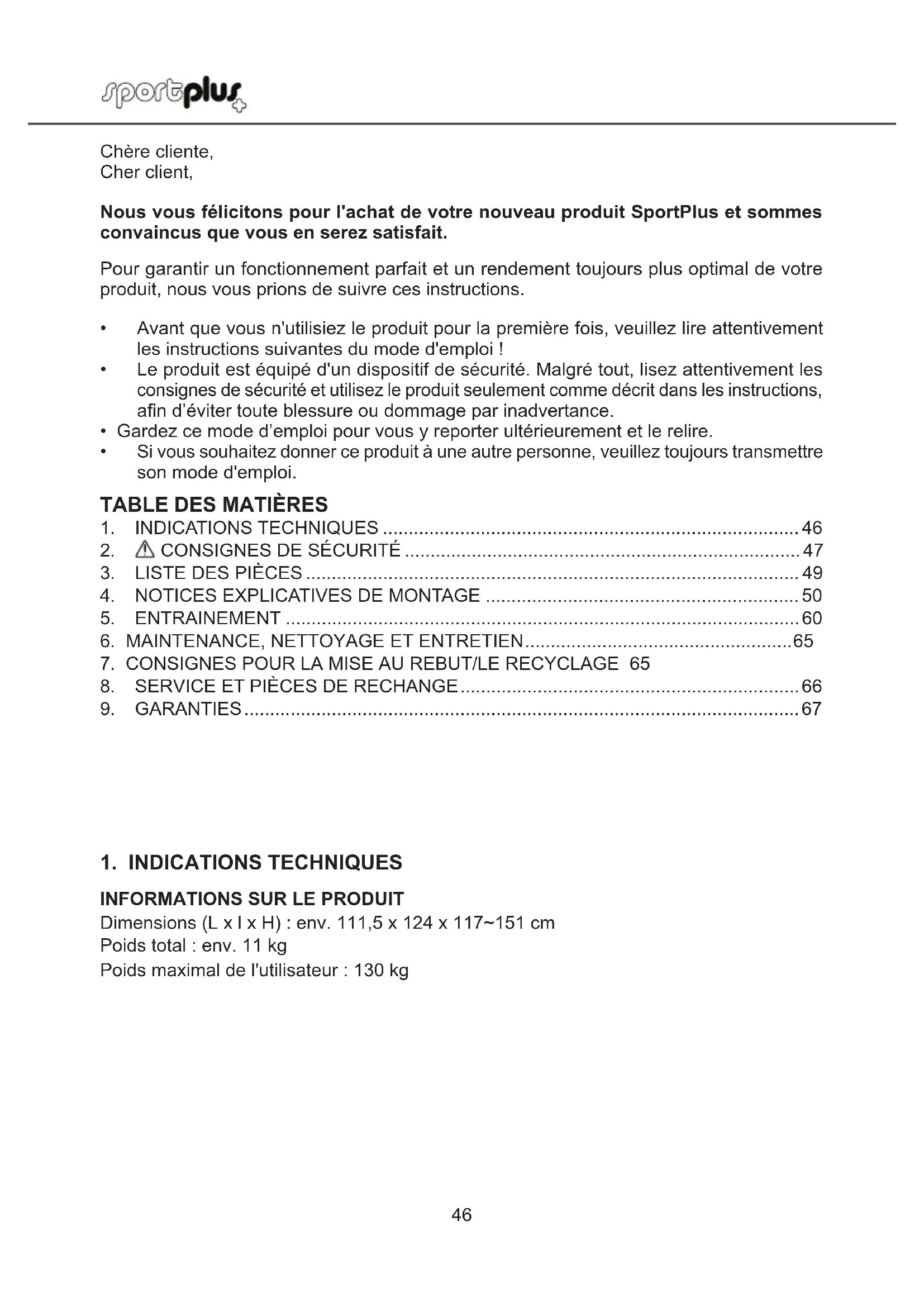 - Also excluded are wear parts and consumable materials. This product is intended for private use only. There is no warranty for commercial use. SP-T-110-IM-V06-INT.indb 45 2/14/17 3:59 PM46 Chère cliente, Cher client, Nous vous félicitons pour l'achat de votre nouveau produit SportPlus et sommes convaincus que vous en serez satisfait. Pour garantir un fonctionnement parfait et un rendement toujours plus optimal de votre produit, nous vous prions de suivre ces instructions.
