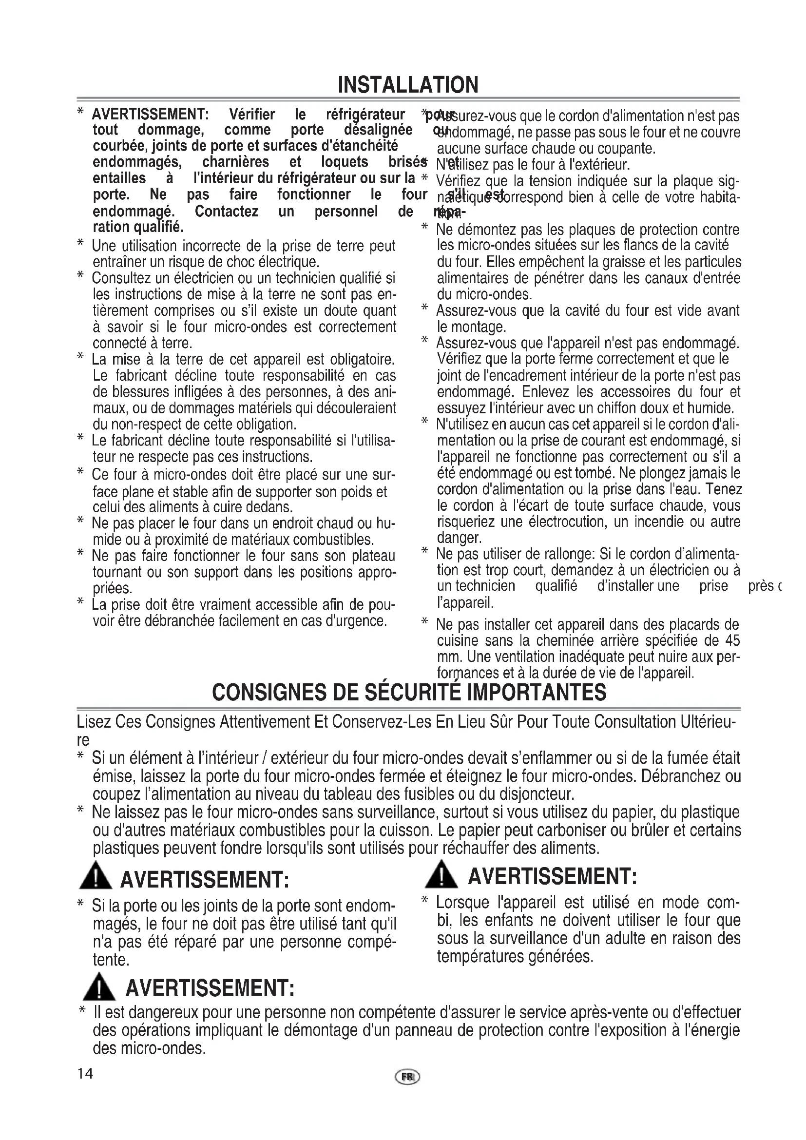 - Consultez un électricien ou un technicien qualifié si les instructions de mise à la terre ne sont pas en- tièrement comprises ou s’il existe un doute quant à savoir si le four micro-ondes est correctement connecté à terre.