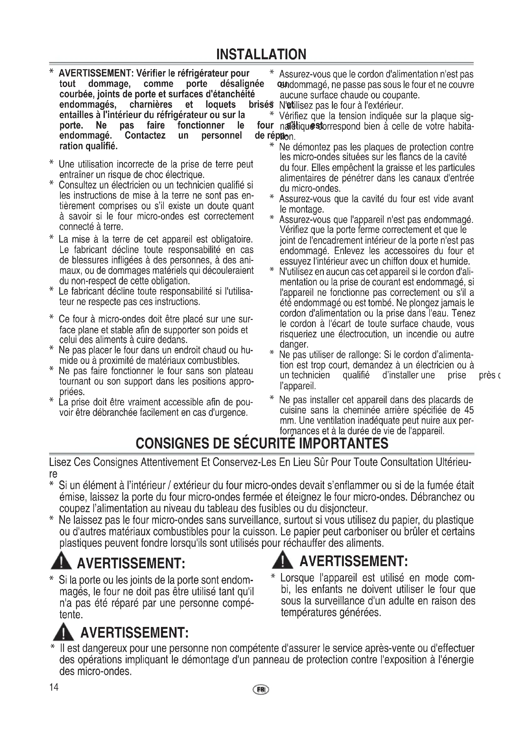 - Consultez un électricien ou un technicien qualifié si les instructions de mise à la terre ne sont pas en- tièrement comprises ou s’il existe un doute quant à savoir si le four micro-ondes est correctement connecté à terre.