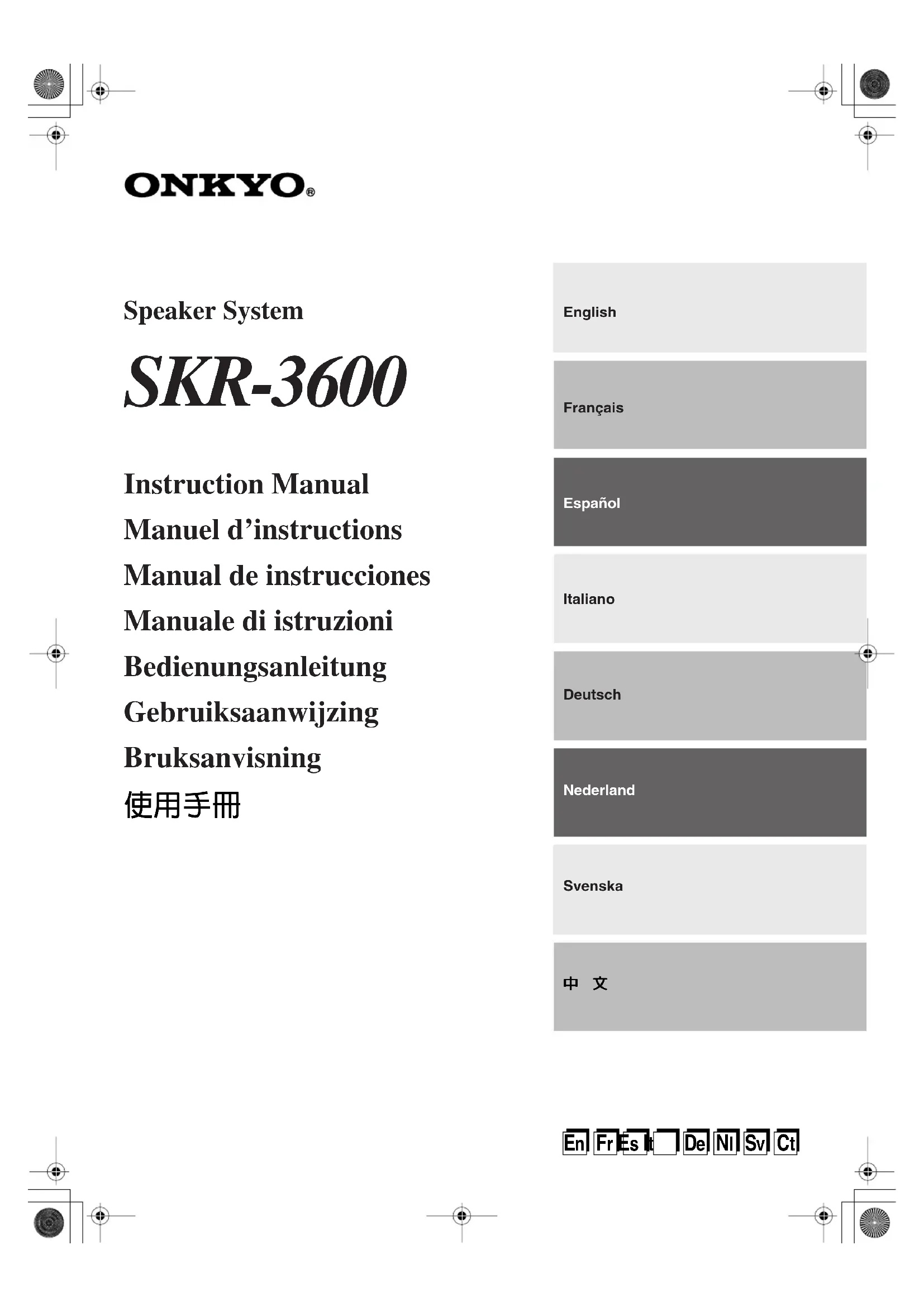 are gripping the core wires, not the insulation. SKR-3600Surround back speaker Precaution on use Specifications En- 2Merci d’avoir choisi ce système d’enceintes Onkyo. Veuillez lire ce manuel attentivement avant d’utiliser cet appareil. Respectez les instructions du présent manuel afin de pouvoir profiter pleinement des performances de vos nouvelles enceintes et de découvrir un plaisir d’écoute incomparable. Veuillez conserver ce manuel pour un usage ultérieur. SKR-3600 (enceinte surround arrière)