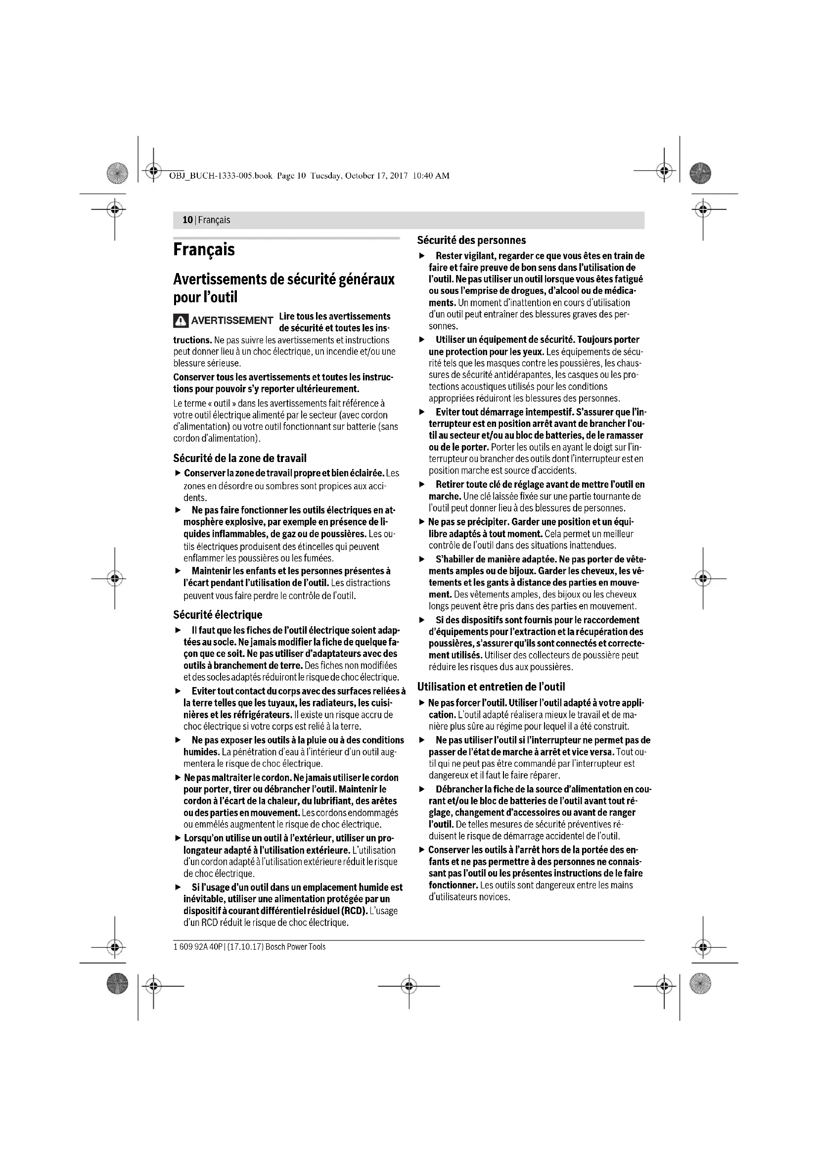 Floor Jalan RA Kartini II-S Kaveling 6 Pondok Pinang, Kebayoran Lama Jakarta Selatan 12310 Tel.: (21) 3005-5800 www.bosch-pt.co.id Malaysia Robert Bosch Sdn. Bhd.(220975-V) PT/SMY No. 8A, Jalan 13/6 46200 Petaling Jaya Selangor Tel.: (03) 79663194 Toll-Free: 1800 880188 Fax: (03) 79583838 E-Mail: kiathoe.chong@my.bosch.com www.bosch-pt.com.my Pakistan Robert Bosch Middle East FZE – Pakistan Liaison Office 2nd Floor Plaza # 10, CCA Block, DHA Phase 5 Lahore, 54810 Phone: +92(303)4444311 Email: Faisal.Khan@bosch.com Philippines Robert Bosch, Inc. 28th Floor Fort Legend Towers, 3rd Avenue corner 31st Street, Fort Bonifacio, Global City, 1634 Taguig City Tel.: (632) 8703871 Fax: (632) 8703870 www.bosch-pt.com.ph Singapore Powerwell Service Centre Ptd Ltd Bosch Authorised Service Centre (Power Tools) 4012 Ang Mo Kio Ave 10, #01-02 TECHplace Singapore 569628 Tel.: 6452 1770 Fax: 6452 1760 E-Mail: ask@powerwellsc.com www.powerwellsc.com www.bosch-pt.com.sg OBJ_BUCH-1333-005.book Page 7 Tuesday, October 17, 2017 10:40 AM8 | English 1 609 92A 40P | (17.10.17) Bosch Power Tools Thailand Robert Bosch Ltd. Liberty Square Building No. 287, 11 Floor Silom Road, Bangrak Bangkok 10500 Tel.: 02 6393111 Fax: 02 2384783 Robert Bosch Ltd., P. O. Box 2054 Bangkok 10501 www.bosch.co.th Bosch Service – Training Centre La Salle Tower Ground Floor Unit No.2 10/11 La Salle Moo 16 Srinakharin Road Bangkaew, Bang Plee Samutprakarn 10540 Tel.: 02 7587555 Fax: 02 7587525 Vietnam Branch of Bosch Vietnam Co., Ltd in HCMC Floor 10, 194 Golden Building 473 Dien Bien Phu Street Ward 25, Binh Thanh District, Ho Chi Minh City Tel.: (08) 6258 3690 Fax: (08) 6258 3692 Hotline: (08) 6250 8555 www.bosch-pt.com.vn Armenia, Azerbaijan, Georgia, Kyrgyzstan, Mongolia, Tajikistan, Turkmenistan, Uzbekistan TOO “Robert Bosch” Power Tools, After Sales Service Rayimbek Ave., 169/1 050050, Almaty, Kazakhstan Service Email: service.pt.ka@bosch.com Official Website: www.bosch.com, www.bosch-pt.com Bahrain Hatem Al Juffali Technical Equipment Establishment. Kingdom of Bahrain, Setra Highway, Al Aker Area Phone: +966126971777-311 Fax: +97317704257 Email: h.berjas@eajb.com.sa Egypt Unimar 20 Markaz kadmat El tagmoa EL Aoul – New Cairo Phone: +20 2224 76091-95 Phone: +20 2224 78072-73 Fax: +20 2224 78075 Email: adelzaki@unimaregypt.com Iran Robert Bosch Iran 3rd Floor, No 3, Maadiran Building Aftab St., Khodami St., Vanak Sq. Tehran 1994834571 Phone: +9821- 86092057 Iraq Sahba Technology Group Al Muthana airport road Baghdad Phone: +9647901906953 Phone Dubai: +97143973851 Email: bosch@sahbatechnology.com Jordan Roots Arabia – Jordan Nasser Bin Jameel street, Building 37 Al Rabiah 11194 Amman Phone: +962 6 5545778 Email: bosch@rootsjordan.com Kuwait Al Qurain Automotive Trading Company Shuwaikh Industrial Area, Block 1, Plot 16, Street 3rd P.O. Box 164 – Safat 13002 Phone: 24810844 Fax: 24810879 E-mail: josephkr@aaalmutawa.com Lebanon Tehini Hana & Co. S.A.R.L. P.O. Box 90-449 Jdeideh Dora-Beirut Phone: +9611255211 Email: service-pt@tehini-hana.com Libya El Naser for Workshop Tools Swanee Road, Alfalah Area Tripoli Phone: +218 21 4811184 Oman Malatan Trading & Contracting LLC P.O. Box 131 Ruwi, 112 Sultanate of Oman Phone: +968 99886794 Email: malatanpowertools@malatan.net Qatar International Construction Solutions W L L P. O. Box 51, Doha Phone: +974 40065458 Fax: +974 4453 8585 Email: csd@icsdoha.com Saudi Arabia Juffali Technical Equipment Co. (JTECO) Kilo 14, Madinah Road, Al Bawadi District Jeddah 21431 Phone: +966 2 6672222 Ext. 1528 Fax: +966 2 6676308 Email: roland@eajb.com.sa OBJ_BUCH-1333-005.book Page 8 Tuesday, October 17, 2017 10:40 AMEnglish | 9 Bosch Power Tools 1 609 92A 40P | (17.10.17) Syria Dallal Establishment for Power Tools P.O. Box 1030 Aleppo Phone: +963212116083 Email: rita.dallal@hotmail.com United Arab Emirates Central Motors & Equipment LLC, P.O. Box 1984 Al-Wahda Street – Old Sana Building Sharjah Phone: +971 6 593 2777 Fax: +971 6 533 2269 Email: powertools@centralmotors.ae Yemen Abualrejal Trading Corporation Sana’a Zubiery St. Front to new Parliament Building Phone: +967-1-202010 Fax: +967-1-279029 Email: tech-tools@abualrejal.com Ethiopia Forever plc Kebele 2,754, BP 4806, Addis Ababa Phone: +251 111 560 600 Email: foreverplc@ethionet.et Ghana C.WOERMANN LTD. Nsawam Road/Avenor Junction, P.O. Box 1779 Accra Phone: +233 302 225 141 Kenya Robert Bosch East Africa Ltd Mpaka Road P.O. Box 856 00606 Nairobi Nigeria Robert Bosch Nigeria Ltd. 52–54 Isaac John Street P.O. Box GRA Ikeja – Lagos Republic of South Africa Customer service Hotline: (011) 6519600 Gauteng – BSC Service Centre 35 Roper Street, New Centre Johannesburg Tel.: (011) 4939375 Fax: (011) 4930126 E-Mail: bsctools@icon.co.za KZN – BSC Service Centre Unit E, Almar Centre 143 Crompton Street Pinetown Tel.: (031) 7012120 Fax: (031) 7012446 E-Mail: bsc.dur@za.bosch.com Western Cape – BSC Service Centre Democracy Way, Prosperity Park Milnerton Tel.: (021) 5512577 Fax: (021) 5513223 E-Mail: bsc@zsd.co.za Bosch Headquarters Midrand, Gauteng Tel.: (011) 6519600 Fax: (011) 6519880 E-Mail: rbsa-hq.pts@za.bosch.com Tanzania Diesel & Autoelectric Service Ltd. 117 Nyerere Rd., P.O. Box 70839 Vingunguti 12109, Dar Es Salaam Phone: +255 222 861 793/794 Australia, New Zealand and Pacific Islands Robert Bosch Australia Pty. Ltd. Power Tools Locked Bag 66 Clayton South VIC 3169 Customer Contact Center Inside Australia: Phone: (01300) 307044 Fax: (01300) 307045 Inside New Zealand: Phone: (0800) 543353 Fax: (0800) 428570 Outside AU and NZ: Phone: +61 3 95415555 www.bosch-pt.com.au www.bosch-pt.co.nz Disposal The machine, accessories and packaging should be sorted for environmental-friendly recycling. Do not dispose of power tools into household waste! Subject to change without notice. OBJ_BUCH-1333-005.book Page 9 Tuesday, October 17, 2017 10:40 AM10 | Français 1 609 92A 40P | (17.10.17) Bosch Power Tools Français Avertissements de sécurité 