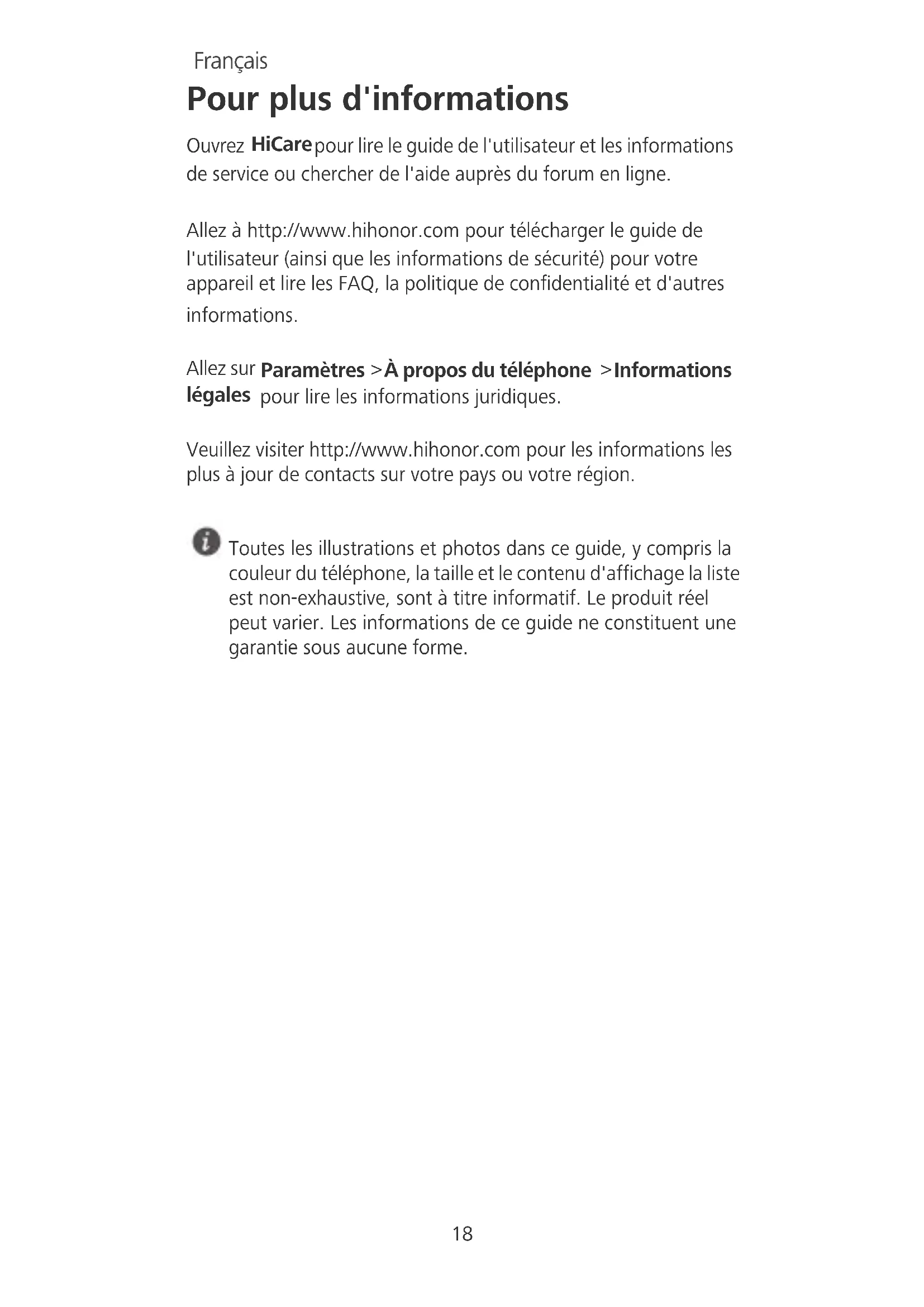 Informations légales pour lire les informations juridiques. Veuillez visiter http://www.hihonor.com pour les informations les plus à jour de contacts sur votre pays ou votre région. Toutes les illustrations et photos dans ce guide, y compris la couleur du téléphone, la taille et le contenu d'affichage la liste est non-exhaustive, sont à titre informatif. Le produit réel peut varier. Les informations de ce guide ne constituent une garantie sous aucune forme. Français19 Votre téléphone en un clin d’œil Commençons par une vue générale de votre téléphone. Veuillez maintenir le bouton d’alimentation appuyé pour allumer ou éteindre votre téléphone. Pour un rallumage forcé, maintenez le bouton d'alimentation appuyé jusqu'à la vibration de votre téléphone. Microphone réducteur de bruitPrise casque Caméra Flash Témoin lumineux de statut Écouteur Port micro USB Microphone Haut-parleur Appareil photo avant Bouton de volume Bouton d'alimentation Empreinte digitale scanneur Capteur de luminositémicroSD Nano-SIM Nano-SIM Nano-SIM