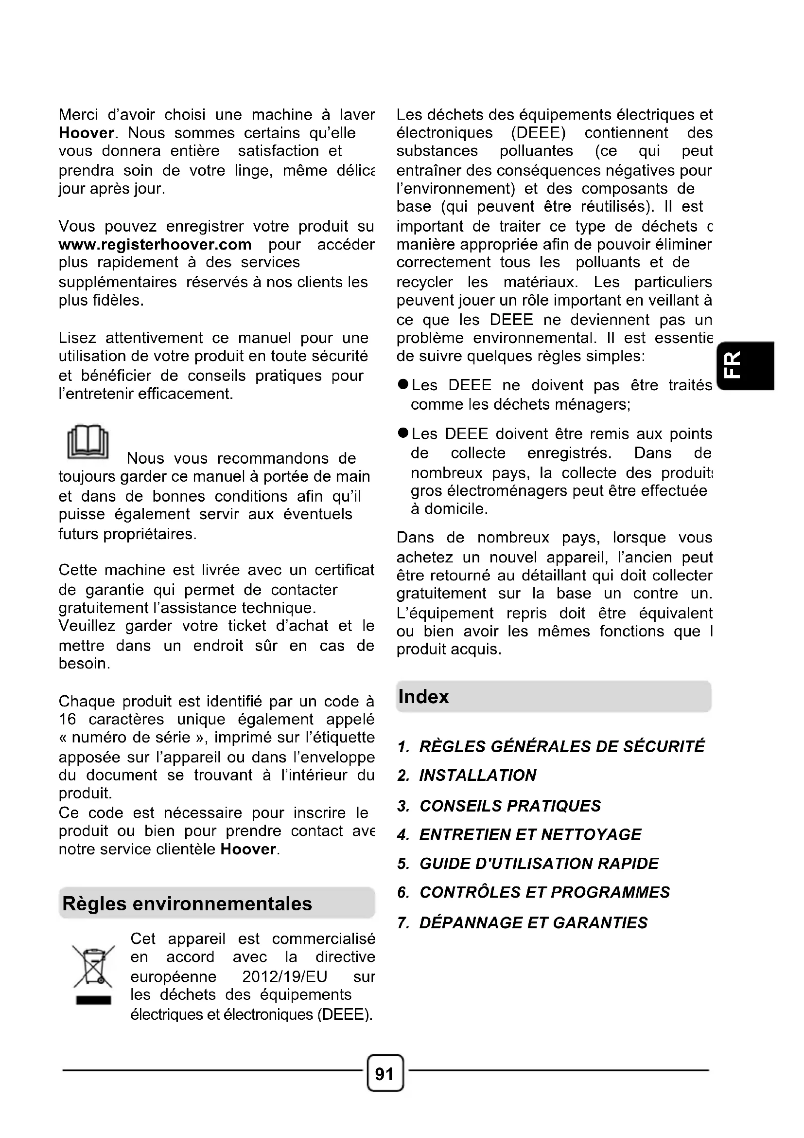 Merci d’avoir choisi une machine à laver Hoover. Nous sommes certains qu’elle vous donnera entière satisfaction et prendra soin de votre linge, même délicat, jour après jour. Vous pouvez enregistrer votre produit sur www.registerhoover.com pour accéder plus rapidement à des services supplémentaires réservés à nos clients les plus fidèles. Lisez attentivement ce manuel pour une utilisation de votre produit en toute sécurité et bénéficier de conseils pratiques pour l’entretenir efficacement. Nous vous recommandons de toujours garder ce manuel à portée de main et dans de bonnes conditions afin qu’il puisse également servir aux éventuels futurs propriétaires. Cette machine est livrée avec un certificat de garantie qui permet de contacter gratuitement l’assistance technique. Veuillez garder votre ticket d’achat et le mettre dans un endroit sûr en cas de besoin. Chaque produit est identifié par un code à 16 caractères unique également appelé « numéro de série », imprimé sur l’étiquette apposée sur l’appareil ou dans l’enveloppe du document se trouvant à l’intérieur du produit. Ce code est nécessaire pour inscrire le produit ou bien pour prendre contact avec notre service clientèle Hoover.