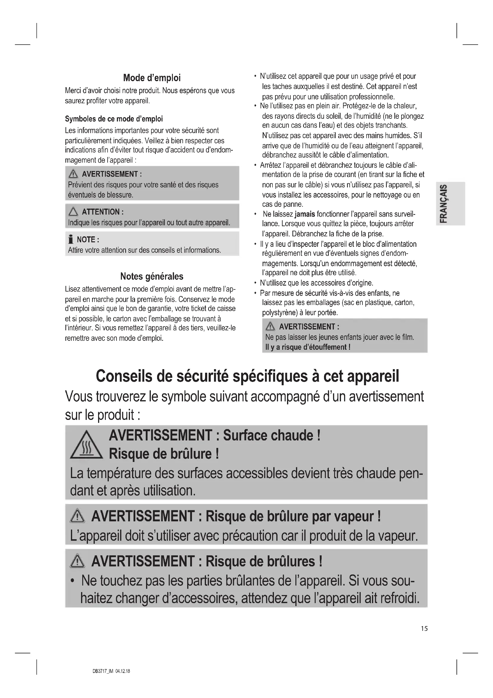 L’appareil doit s’utiliser avec précaution car il produit de la vapeur.