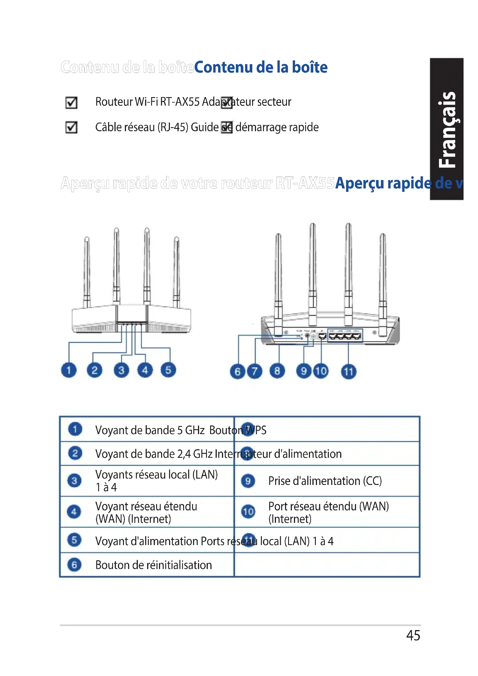 - Võrgus loetava kasutujuhendi saate saidilt https://www.asus.com/support ASUS Router ASUS Router45 Français Aperçu rapide de votre routeur RT-AX55Aperçu rapide de votre routeur RT-AX55 Contenu de la boîteContenu de la boîte Routeur Wi-Fi RT-AX55 Adaptateur secteur Câble réseau (RJ-45) Guide de démarrage rapide Voyant de bande 5 GHz Bouton WPS Voyant de bande 2,4 GHz Interrupteur d'alimentation Voyants réseau local (LAN) 1 à 4 Prise d'alimentation (CC) Voyant réseau étendu (WAN) (Internet) Port réseau étendu (WAN) (Internet) Voyant d'alimentation Ports réseau local (LAN) 1 à 4 Bouton de réinitialisation46 Français Placer le routeur Wi-FiPlacer le routeur Wi-Fi Pour optimiser la transmission du signal Wi-Fi entre votre routeur et les périphériques réseau y étant connectés, veuillez vous assurer des points suivants :