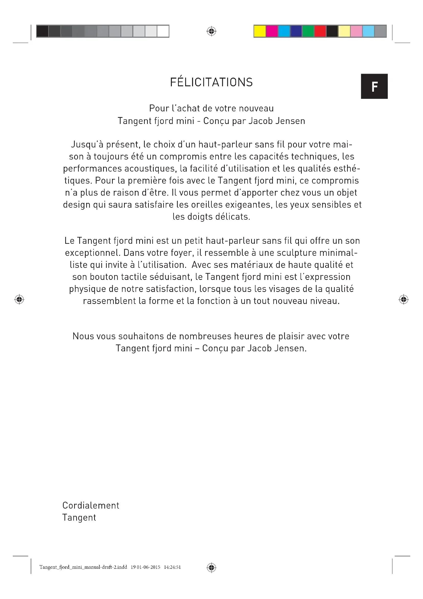 with the battery, please carry the unit to the service center for help Tangent_fjord_mini_manual-draft-2.indd 18 01-06-2015 14:24:51F FÉLICITATIONS Pour l’achat de votre nouveau Tangent fjord mini - Conçu par Jacob Jensen Jusqu’à présent, le choix d’un haut-parleur sans fil pour votre mai- son à toujours été un compromis entre les capacités techniques, les performances acoustiques, la facilité d’utilisation et les qualités esthé- tiques. Pour la première fois avec le Tangent fjord mini, ce compromis n’a plus de raison d’être. Il vous permet d’apporter chez vous un objet design qui saura satisfaire les oreilles exigeantes, les yeux sensibles et les doigts délicats. Le Tangent fjord mini est un petit haut-parleur sans fil qui offre un son exceptionnel. Dans votre foyer, il ressemble à une sculpture minimal- liste qui invite à l’utilisation. Avec ses matériaux de haute qualité et son bouton tactile séduisant, le Tangent fjord mini est l’expression physique de notre satisfaction, lorsque tous les visages de la qualité rassemblent la forme et la fonction à un tout nouveau niveau. Nous vous souhaitons de nombreuses heures de plaisir avec votre Tangent fjord mini – Conçu par Jacob Jensen. Cordialement Tangent Tangent_fjord_mini_manual-draft-2.indd 19 01-06-2015 14:24:51Guide de prise en main : Déballer votre Tangent fjord Appuyez au bas du bouton ON/OFF pour enclencher ON afin d’actionner le capteur tactile sur le dessus de l’appareil. Mettez l’appareil en marche (ON) en appuyant brièvement sur le capteur tactile L’appareil sera à présent en mode de pairage et vous serez en mesure de le trouver sur votre ordiphone (“si votre ordiphone est pourvu de la fonction NFC et que cette fonction est activée, vous pouvez l’utiliser pour le pairage” NFC est situé sur le dessus de l’appareil.) Vous êtes à présent connecté à l’appareil et vous pouvez jouer de la musique. Pour mettre le fjord mini à l’arrêt (OFF), vous devez effectuer un appui long sur le capteur tactile. Rechargez votre Tangent fjord lorsque c’est nécessaire. Fonctions de la touche tactile : Allumer Appui court Éteindre Appui long (en mode de fonctionnement et en mode de pairage) Augmentation du volume Appui lent (appuyer x 1) lors de la lecture de la musique Diminution de volume Appui rapide (pressions multiples) lors de la lecture de la musique Annuler la liste de pairage Appui double en mode de pairage Répondre à un appel Appui court lors d’un appel entrant Rejeter un appel Appui long lors d’un appel entrant Terminer un appel Appui court pendant un appel Accepter un appel en attente Appui double pendant un appel en attente LED : Blanche Sous tension Blanche clignotante Pairage BT Rouge Indication de recharge (éteinte lorsque la recharge est terminée) Rouge clignotante Batterie faible Tangent_fjord_mini_manual-draft-2.indd 20 01-06-2015 14:24:51F
