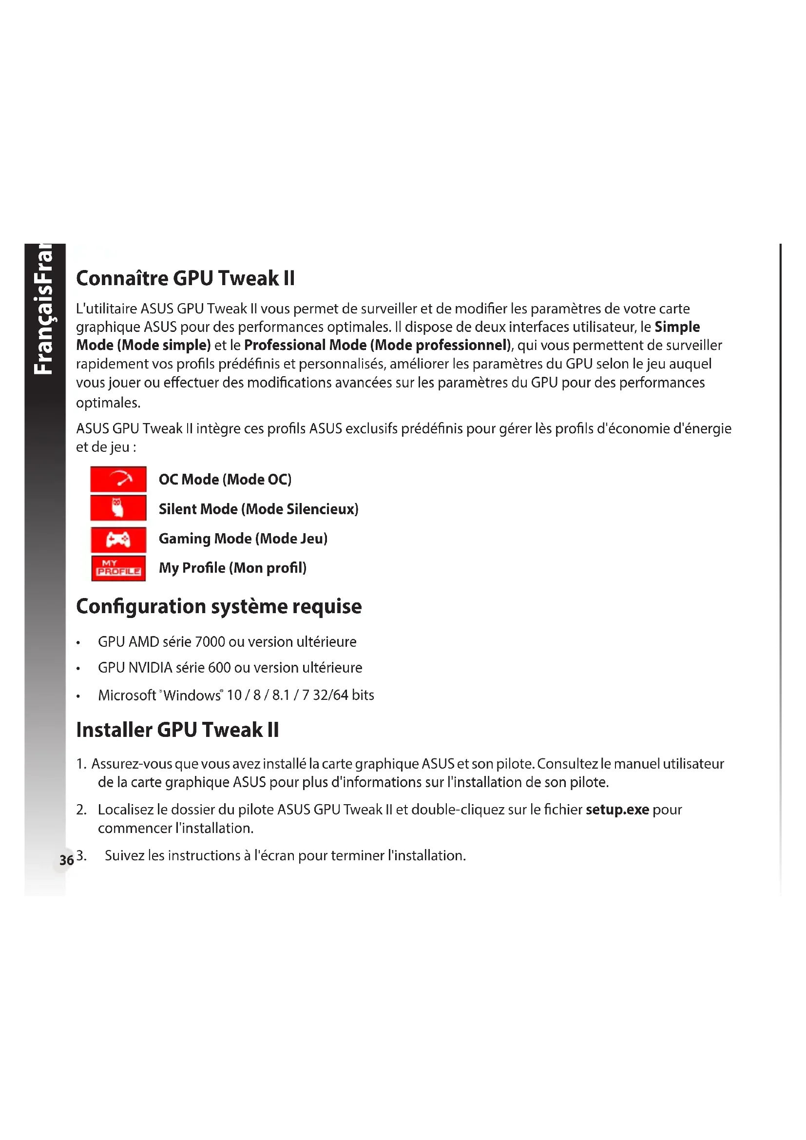 開啟 / 關閉鍵盤快捷鍵以快速顯示主菜單或應用快速調整。 鍵盤快捷鍵設置36 FrançaisFrançais Connaître GPU Tweak II L'utilitaire ASUS GPU Tweak II vous permet de surveiller et de modier les paramètres de votre carte graphique ASUS pour des performances optimales. Il dispose de deux interfaces utilisateur, le Simple Mode (Mode simple) et le Professional Mode (Mode professionnel), qui vous permettent de surveiller rapidement vos prols prédénis et personnalisés, améliorer les paramètres du GPU selon le jeu auquel vous jouer ou eectuer des modications avancées sur les paramètres du GPU pour des performances optimales. ASUS GPU Tweak II intègre ces prols ASUS exclusifs prédénis pour gérer lès prols d'économie d'énergie et de jeu : OC Mode (Mode OC) Silent Mode (Mode Silencieux) Gaming Mode (Mode Jeu) My Prole (Mon prol) Conguration système requise