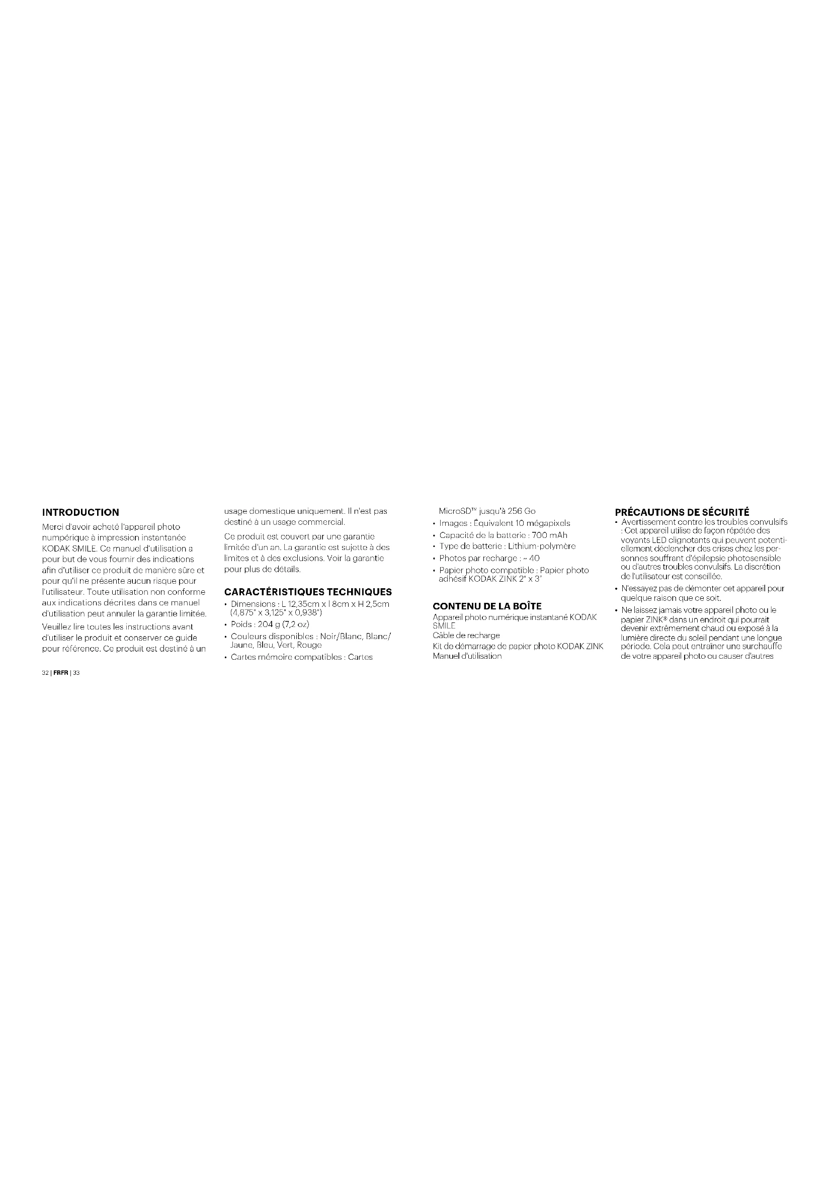 INFORMATION Should you experience any problems with your product, please contact us before returning the item to the place of purchase. WE’RE HERE TO HELP! U.S. Support: kodak@camarketing.com 844-516-1539 International Support: kodakintl@camarketing.com 844-516-1540 kodakphotoplus.com The Kodak trademark, logo, and trade dress are used under license from Eastman Kodak Company. Android is a trademark of Google Inc. IOS is a trademark of Cisco in the U.S. and other countries and is used under license. All other products, brand names, company names, and logos are trademarks of their respective owners, used merely to identify their respective products, and are not meant to connote any sponsorship, endorsement or approval. Distributed by: C&A Marketing, Inc., 114 Tived Lane East, Edison, NJ 08837, USA C&A Marketing UK LTD, 167 Hermitage Road, Crusader Industrial Estate, London N4 1LZ, UK ©2019. All Rights Reserved. Made in Vietnam.32 | FR FR | 33 INTRODUCTION Merci d'avoir acheté l'appareil photo numpérique à impression instantanée KODAK SMILE. Ce manuel d'utilisation a pour but de vous fournir des indications ain d'utiliser ce produit de manière sûre et pour qu'il ne présente aucun risque pour l'utilisateur. Toute utilisation non conforme aux indications décrites dans ce manuel d'utilisation peut annuler la garantie limitée. Veuillez lire toutes les instructions avant d'utiliser le produit et conserver ce guide pour référence. Ce produit est destiné à un usage domestique uniquement. Il n'est pas destiné à un usage commercial. Ce produit est couvert par une garantie limitée d'un an. La garantie est sujette à des limites et à des exclusions. Voir la garantie pour plus de détails.
