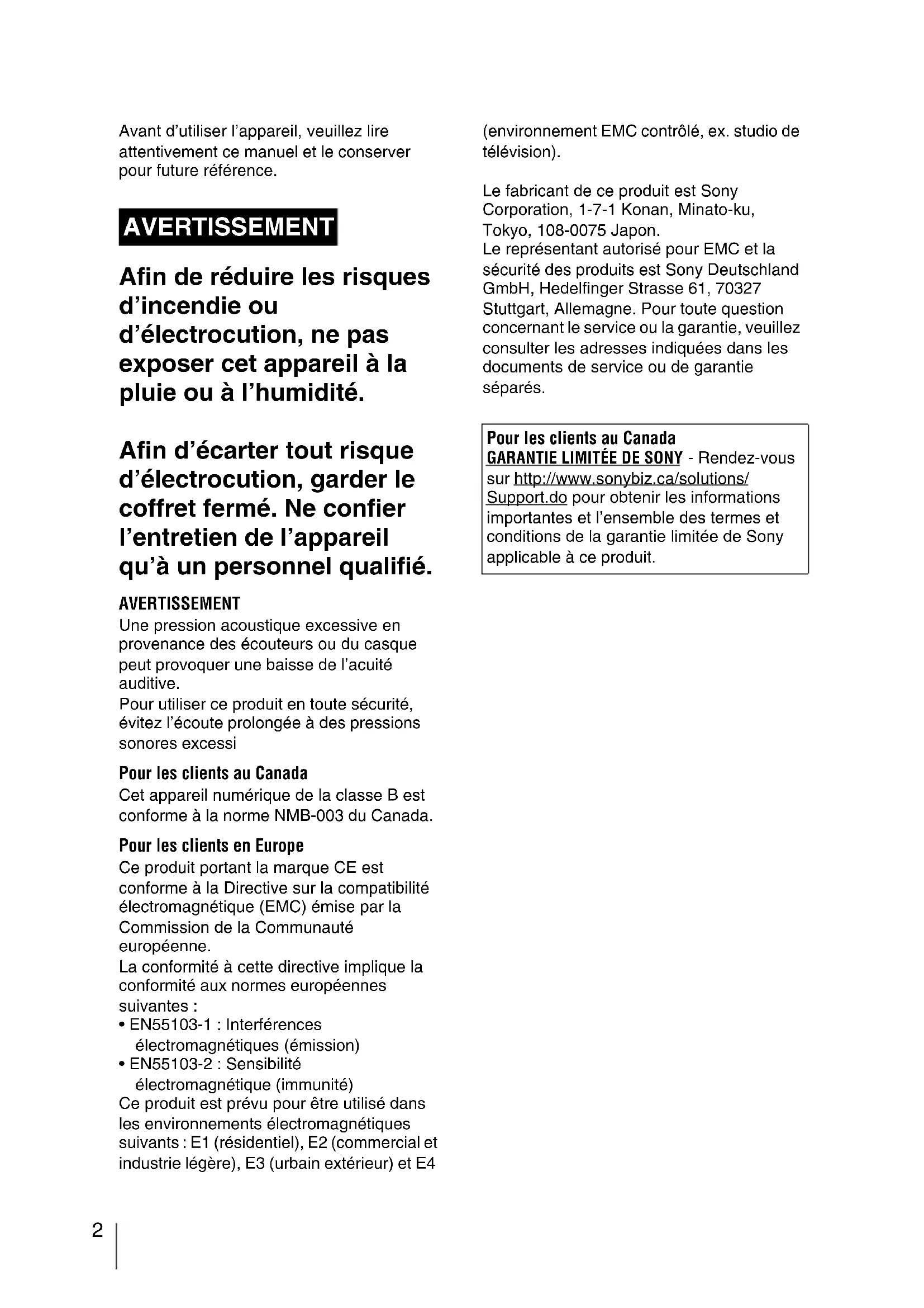 - EN55103-2 : Sensibilité électromagnétique (immunité) Ce produit est prévu pour être utilisé dans les environnements électromagnétiques suivants : E1 (résidentiel), E2 (commercial et industrie légère), E3 (urbain extérieur) et E4 (environnement EMC contrôlé, ex. studio de télévision). Le fabricant de ce produit est Sony Corporation, 1-7-1 Konan, Minato-ku, Tokyo, 108-0075 Japon. Le représentant autorisé pour EMC et la sécurité des produits est Sony Deutschland GmbH, Hedelfinger Strasse 61, 70327 Stuttgart, Allemagne. Pour toute question concernant le service ou la garantie, veuillez consulter les adresses indiquées dans les documents de service ou de garantie séparés. AVERTISSEMENT Pour les clients au Canada GARANTIE LIMITÉE DE SONY - Rendez-vous sur http://www.sonybiz.ca/solutions/ Support.do pour obtenir les informations importantes et l’ensemble des termes et conditions de la garantie limitée de Sony applicable à ce produit.Table des matières