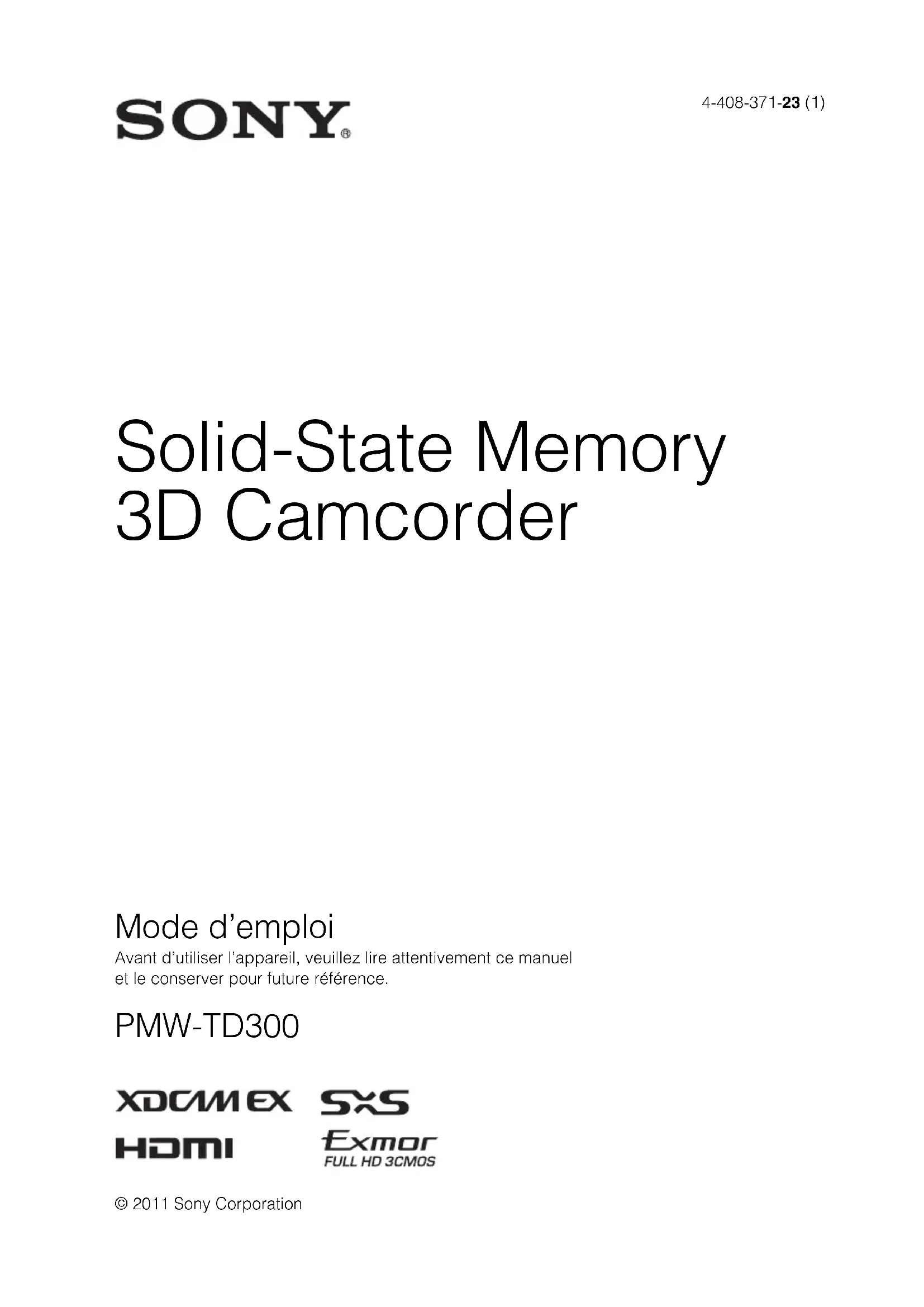 4-408-371-23 (1) © 2011 Sony Corporation Solid-State Memory 3D Camcorder Mode d’emploi Avant d’utiliser l’appareil, veuillez lire attentivement ce manuel et le conserver pour future référence. PMW-TD3002 Afin de réduire les risques d’incendie ou d’électrocution, ne pas exposer cet appareil à la pluie ou à l’humidité. Afin d’écarter tout risque d’électrocution, garder le coffret fermé. Ne confier l’entretien de l’appareil qu’à un personnel qualifié. ATTENTION Il y a danger d’explosion s’il y a remplacement incorrect de la batterie. Remplacer uniquement avec une batterie du même type ou d’un type équivalent recommandé par le constructeur. Lorsque vous mettez la batterie au rebut, vous devez respecter la législation en vigueur dans le pays ou la région où vous vous trouvez. Eviter d’exposer l’appareil à un égouttement ou à des éclaboussures. Ne placer aucun objet rempli de liquide, comme un vase, sur l’appareil. AVERTISSEMENT Une pression acoustique excessive en provenance des écouteurs ou du casque peut provoquer une baisse de l’acuité auditive. Pour utiliser ce produit en toute sécurité, évitez l’écoute prolongée à des pressions sonores excessives. N’exposez pas les batteries à une chaleur excessive, au soleil ou près d’un feu par exemple. Pour les clients au Canada Cet appareil numérique de la classe A est conforme à la norme NMB-003 du Canada. Pour les clients en Europe Ce produit portant la marque CE est conforme à la Directive sur la compatibilité électromagnétique (EMC) émise par la Commission de la Communauté européenne. La conformité à cette directive implique la conformité aux normes européennes suivantes :