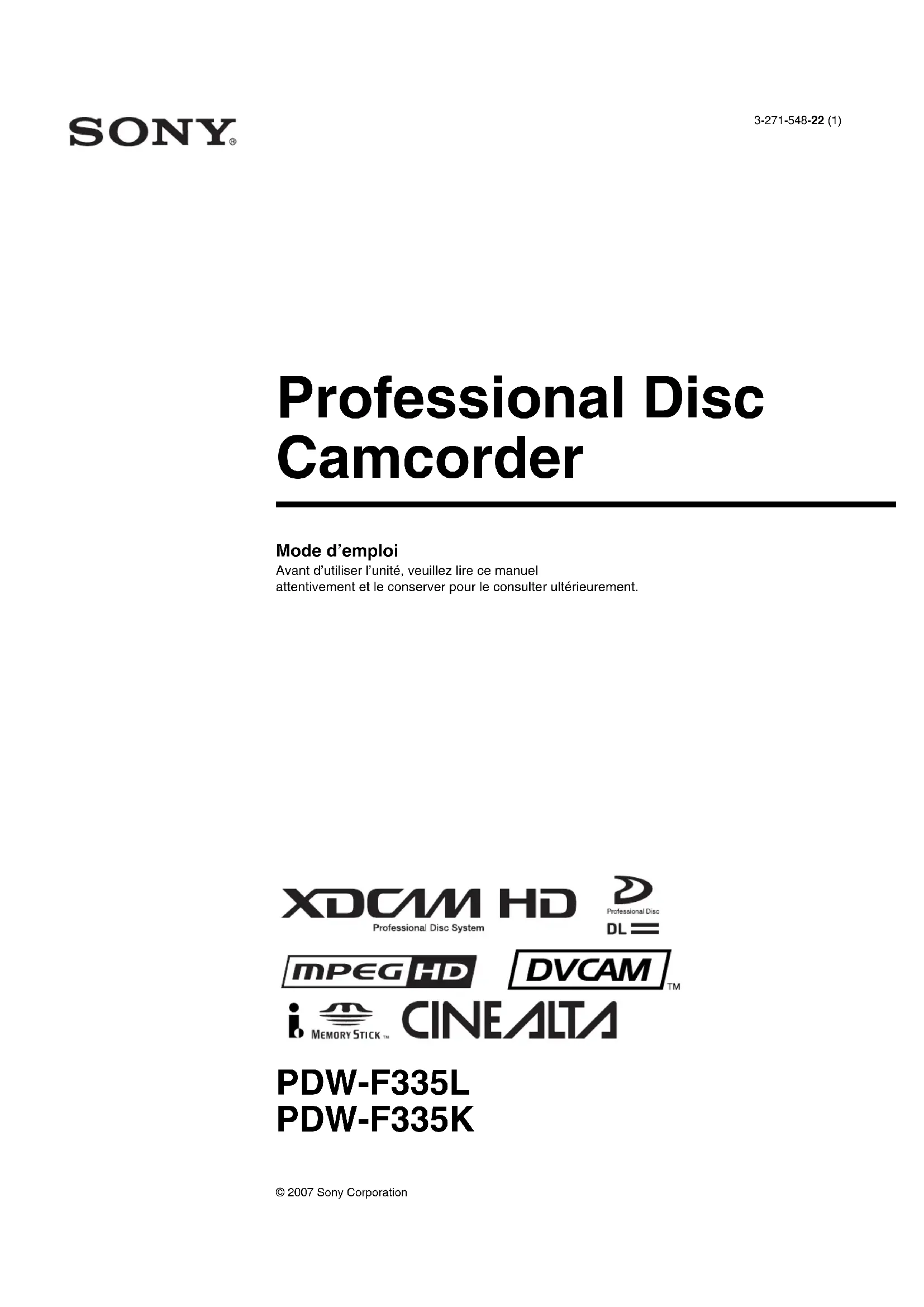 3-271-548-22 (1) Professional Disc Camcorder Mode d’emploi Avant d’utiliser l’unité, veuillez lire ce manuel attentivement et le conserver pour le consulter ultérieurement. PDW-F335L PDW-F335K © 2007 Sony Corporation2 Afin de réduire les risques d’incendie ou d’électrocution, ne pas exposer cet appareil à la pluie ou à l’humidité. Afin d’écarter tout risque d’électrocution, garder le coffret fermé. Ne confier l’entretien de l’appareil qu’à un personnel qualifié. Cet camescope de disques pour professionnels est classé PRODUIT LASER DE CLASSE 1. Propriétés de la diode laser Longueur d’onde: 400 à 410 nm Durée d’émission: Continue Puissance de sortie laser: 135 mW (maxi de crête d’impulsion), 65 mW (maxi d’ondes entretenues) Norme: IEC60825-1 (2001) ATTENTION L’emploi d’instruments optiques avec ce produit augmentera les risques pour les yeux. L’emploi de commandes ou ajustements ou l’exécution de procédures autres que celles spécifiées ici peut provoquer une exposition dangereuse au rayonnement. Pour les utilisateurs aux Etats-Unis et au Canada.