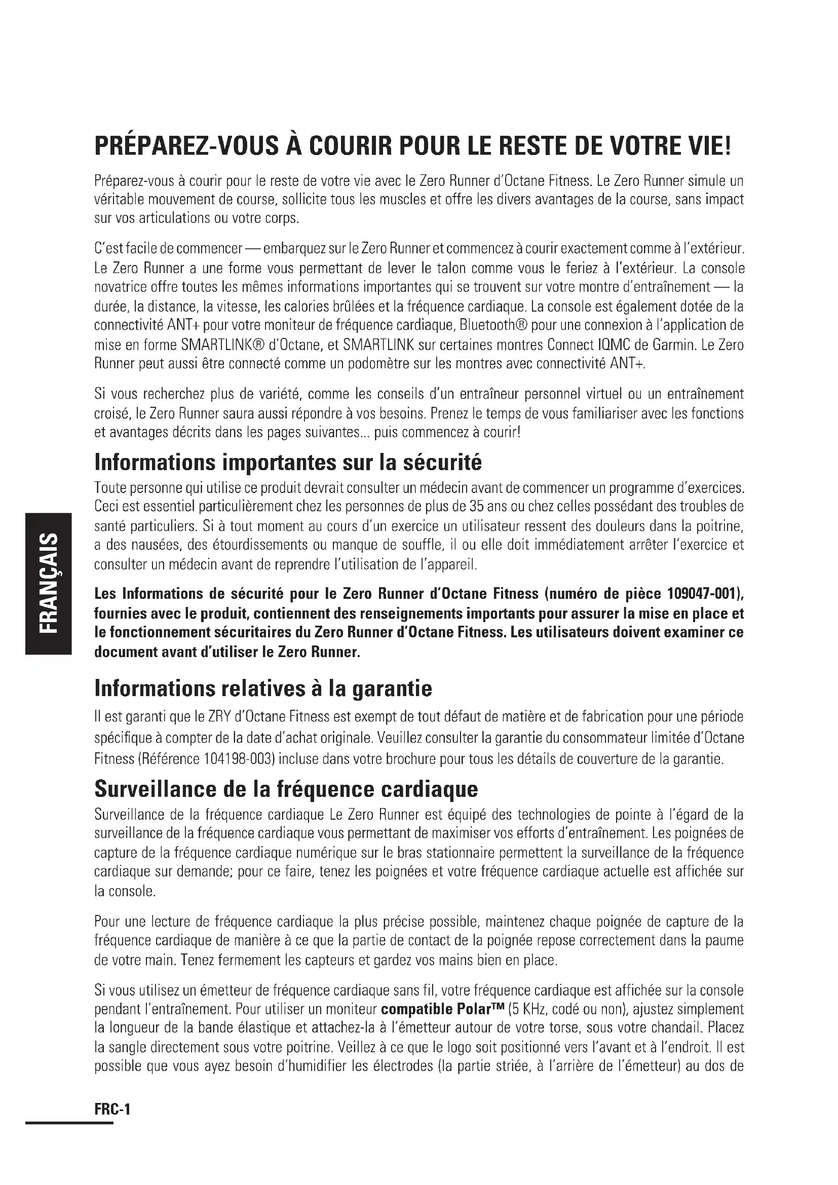 - Accessoire de support Powerblock™ ........................................................................ 10 TRUCS ET CONSEILS ................................................................................................................... 11FRC-1 FRANÇAIS PRÉPAREZ-VOUS À COURIR POUR LE RESTE DE VOTRE VIE! Préparez-vous à courir pour le reste de votre vie avec le Zero Runner d’Octane Fitness. Le Zero Runner simule un véritable mouvement de course, sollicite tous les muscles et offre les divers avantages de la course, sans impact sur vos articulations ou votre corps. C’est facile de commencer — embarquez sur le Zero Runner et commencez à courir exactement comme à l’extérieur. Le Zero Runner a une forme vous permettant de lever le talon comme vous le feriez à l’extérieur. La console novatrice offre toutes les mêmes informations importantes qui se trouvent sur votre montre d’entraînement — la durée, la distance, la vitesse, les calories brûlées et la fréquence cardiaque. La console est également dotée de la connectivité ANT+ pour votre moniteur de fréquence cardiaque, Bluetooth® pour une connexion à l’application de mise en forme SMARTLINK® d’Octane, et SMARTLINK sur certaines montres Connect IQMC de Garmin. Le Zero Runner peut aussi être connecté comme un podomètre sur les montres avec connectivité ANT+. Si vous recherchez plus de variété, comme les conseils d’un entraîneur personnel virtuel ou un entraînement croisé, le Zero Runner saura aussi répondre à vos besoins. Prenez le temps de vous familiariser avec les fonctions et avantages décrits dans les pages suivantes... puis commencez à courir! Informations importantes sur la sécurité Toute personne qui utilise ce produit devrait consulter un médecin avant de commencer un programme d’exercices. Ceci est essentiel particulièrement chez les personnes de plus de 35 ans ou chez celles possédant des troubles de santé particuliers. Si à tout moment au cours d’un exercice un utilisateur ressent des douleurs dans la poitrine, a des nausées, des étourdissements ou manque de souffle, il ou elle doit immédiatement arrêter l’exercice et consulter un médecin avant de reprendre l’utilisation de l’appareil. Les Informations de sécurité pour le Zero Runner d’Octane Fitness (numéro de pièce 109047-001), fournies avec le produit, contiennent des renseignements importants pour assurer la mise en place et le fonctionnement sécuritaires du Zero Runner d’Octane Fitness. Les utilisateurs doivent examiner ce document avant d’utiliser le Zero Runner. Informations relatives à la garantie Il est garanti que le ZRY d’Octane Fitness est exempt de tout défaut de matière et de fabrication pour une période spécifique à compter de la date d’achat originale. Veuillez consulter la garantie du consommateur limitée d’Octane Fitness (Référence 104198-003) incluse dans votre brochure pour tous les détails de couverture de la garantie. Surveillance de la fréquence cardiaque Surveillance de la fréquence cardiaque Le Zero Runner est équipé des technologies de pointe à l’égard de la surveillance de la fréquence cardiaque vous permettant de maximiser vos efforts d’entraînement. Les poignées de capture de la fréquence cardiaque numérique sur le bras stationnaire permettent la surveillance de la fréquence cardiaque sur demande; pour ce faire, tenez les poignées et votre fréquence cardiaque actuelle est affichée sur la console. Pour une lecture de fréquence cardiaque la plus précise possible, maintenez chaque poignée de capture de la fréquence cardiaque de manière à ce que la partie de contact de la poignée repose correctement dans la paume de votre main. Tenez fermement les capteurs et gardez vos mains bien en place. Si vous utilisez un émetteur de fréquence cardiaque sans fil, votre fréquence cardiaque est affichée sur la console pendant l’entraînement. Pour utiliser un moniteur compatible Polar™ (5 KHz, codé ou non), ajustez simplement la longueur de la bande élastique et attachez-la à l’émetteur autour de votre torse, sous votre chandail. Placez la sangle directement sous votre poitrine. Veillez à ce que le logo soit positionné vers l’avant et à l’endroit. Il est possible que vous ayez besoin d’humidifier les électrodes (la partie striée, à l’arrière de l’émetteur) au dos deFRC-2 FRANÇAIS l’émetteur avec une petite quantité d’eau pour une meilleure adhérence à la peau. Veillez à ce que la sangle tienne bien en place sans pour autant restreindre la respiration. Pour brancher un moniteur compatible ANT+™ à votre Zero Runner, tenez-vous prêt du côté droit de la console Octane en portant votre moniteur jusqu’à ce que l’icône ANT+ dans le coin supérieur droit de la console s’allume. Vous pouvez aussi brancher un moniteur de fréquence cardiaque Bluetooth dans votre Zero Runner avec l’application SMARTLINK. Lorsque vous portez votre moniteur, ouvrez SMARTLINK. Un message s’affichera dans l’application indiquant qu’une fréquence cardiaque a été détectée. Sélectionnez « OUI » pour connecter le moniteur à votre appareil. Un message s’affiche alors confirmant la connexion, et l’icône Bluetooth à côté de votre lecture de fréquence cardiaque dans l’application s’allumera. Remarque : La lecture de l’émetteur sans fil a préséance lorsque la capacité sans fil et les poignées de capture de la fréquence sont toutes deux utilisées. Nettoyage et entretien du Zero Runner AVERTISSEMENT! L’appareil possède des parties mobiles. Prenez le plus grand soin lorsque vous tentez de repérer et de réparer quelconque problème avec le vélo. Le Zero Runner Octane Fitness a été fabriqué en vue de supporter plusieurs heures d’usage intensif avec un minimum de maintenance. Il suffit d’essuyer l’appareil avec un chiffon propre après chaque séance afin d’éliminer la