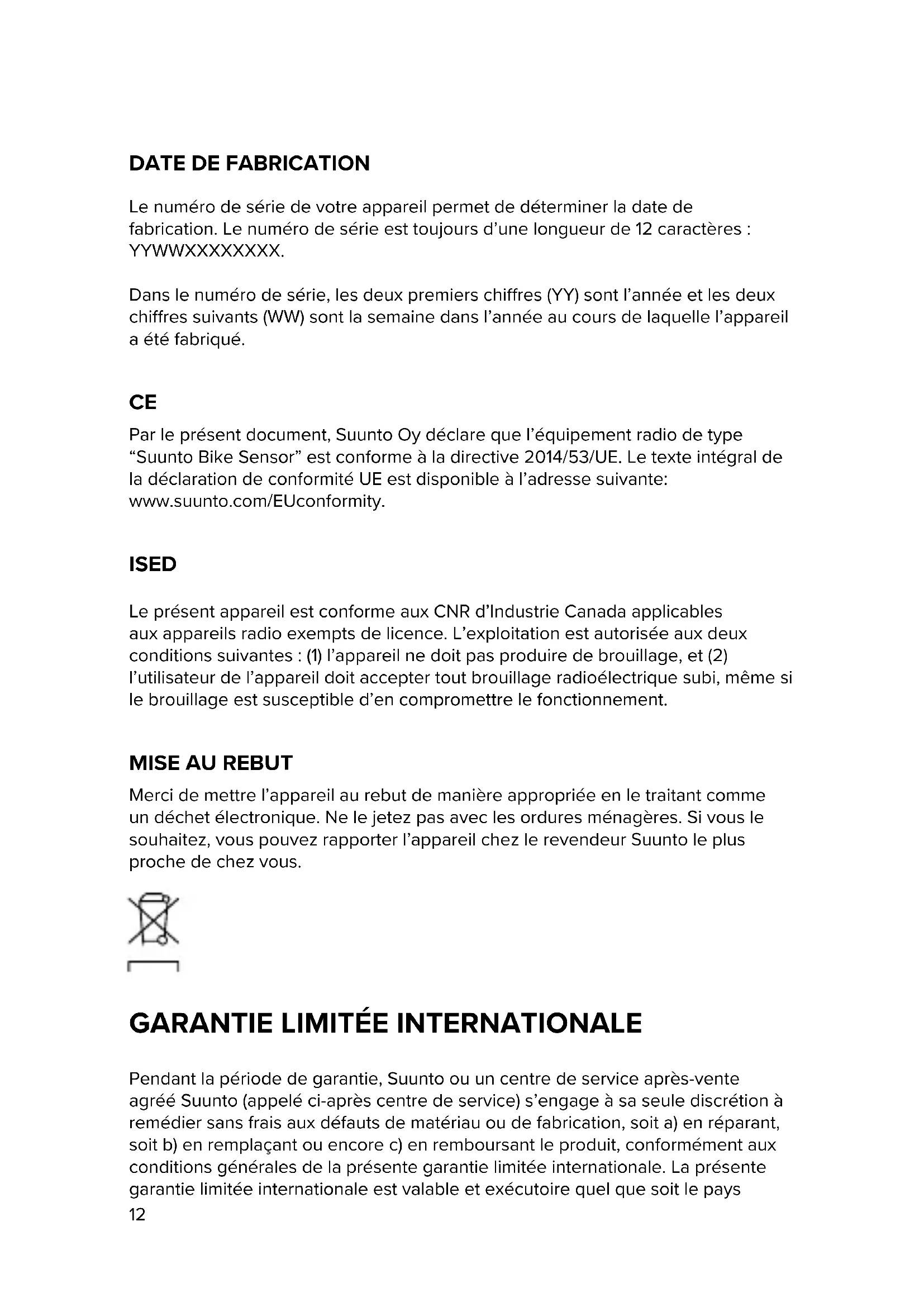 Par le présent document, Suunto Oy déclare que l’équipement radio de type “Suunto Bike Sensor” est conforme à la directive 2014/53/UE. Le texte intégral de la déclaration de conformité UE est disponible à l’adresse suivante: www.suunto.com/EUconformity. ISED Le présent appareil est conforme aux CNR d’Industrie Canada applicables aux appareils radio exempts de licence. L’exploitation est autorisée aux deux conditions suivantes : (1) l’appareil ne doit pas produire de brouillage, et (2) l’utilisateur de l’appareil doit accepter tout brouillage radioélectrique subi, même si le brouillage est susceptible d’en compromettre le fonctionnement.