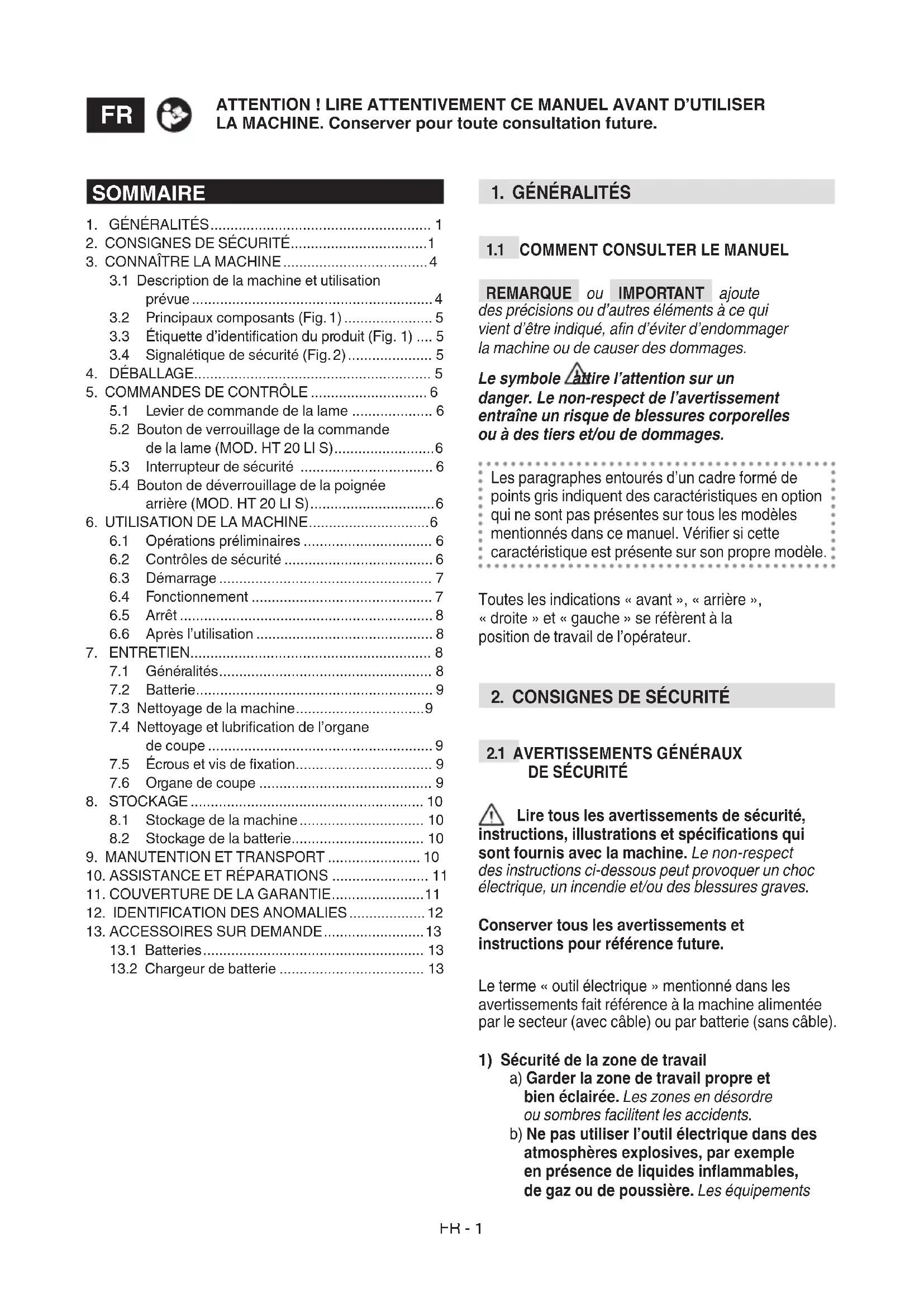 de la lame (MOD. HT 20 LI S) ......................... 6