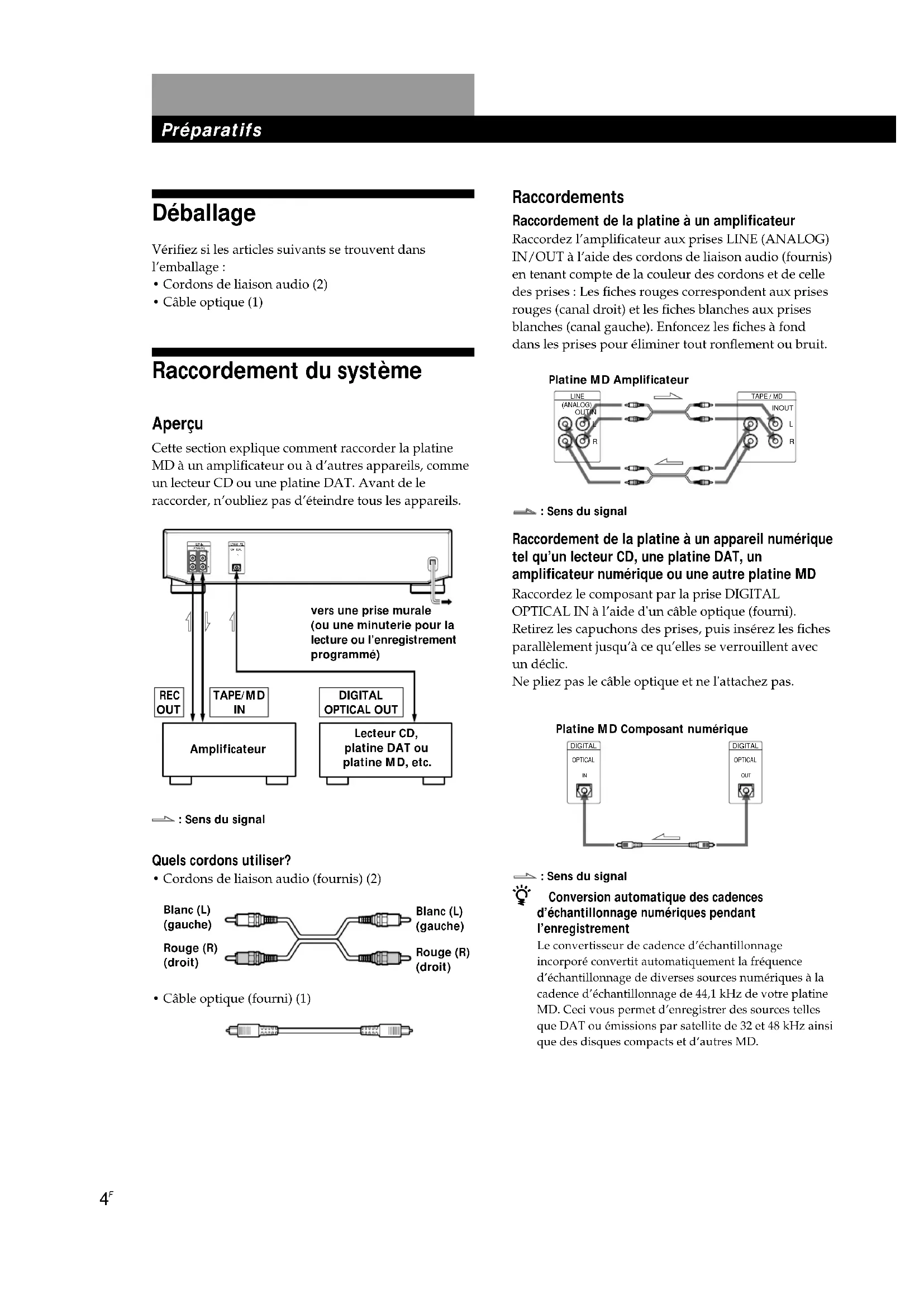 ç : Sens du signalLecteur CD,platine DAT ouplatine MD, etc.Blanc (L)(gauche)Rouge (R)(droit)Rouge (R)(droit)Blanc (L)(gauche)Platine MD Amplificateur