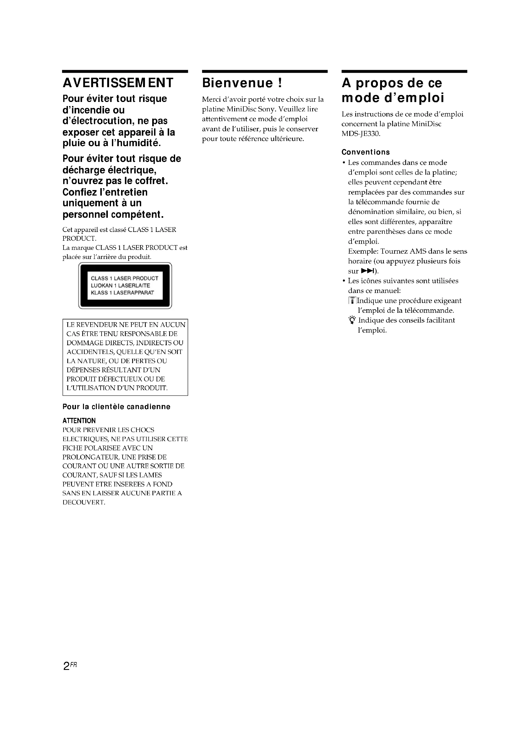 AVERTISSEMENT Pour éviter tout risque d’incendie ou d’électrocution, ne pas exposer cet appareil à la pluie ou à l’humidité. Pour éviter tout risque de décharge électrique, n’ouvrez pas le coffret. Confiez l’entretien uniquement à un personnel compétent. Cet appareil est classé CLASS 1 LASERPRODUCT.La marque CLASS 1 LASER PRODUCT estplacée sur l’arrière du produit.LE REVENDEUR NE PEUT EN AUCUNCAS ÊTRE TENU RESPONSABLE DEDOMMAGE DIRECTS, INDIRECTS OUACCIDENTELS, QUELLE QU’EN SOITLA NATURE, OU DE PERTES OUDÉPENSES RÉSULTANT D’UNPRODUIT DÉFECTUEUX OU DEL’UTILISATION D’UN PRODUIT. Pour la clientèle canadienne ATTENTION POUR PREVENIR LES CHOCSELECTRIQUES, NE PAS UTILISER CETTEFICHE POLARISEE AVEC UNPROLONGATEUR, UNE PRISE DECOURANT OU UNE AUTRE SORTIE DECOURANT, SAUF SI LES LAMESPEUVENT ETRE INSEREES A FONDSANS EN LAISSER AUCUNE PARTIE ADECOUVERT. Bienvenue ! Merci d’avoir porté votre choix sur la platine MiniDisc Sony. Veuillez lire attentivement ce mode d’emploi avant de l’utiliser, puis le conserver pour toute référence ultérieure. A propos de ce mode d’emploi Les instructions de ce mode d’emploi concernent la platine MiniDisc MDS-JE330. Conventions