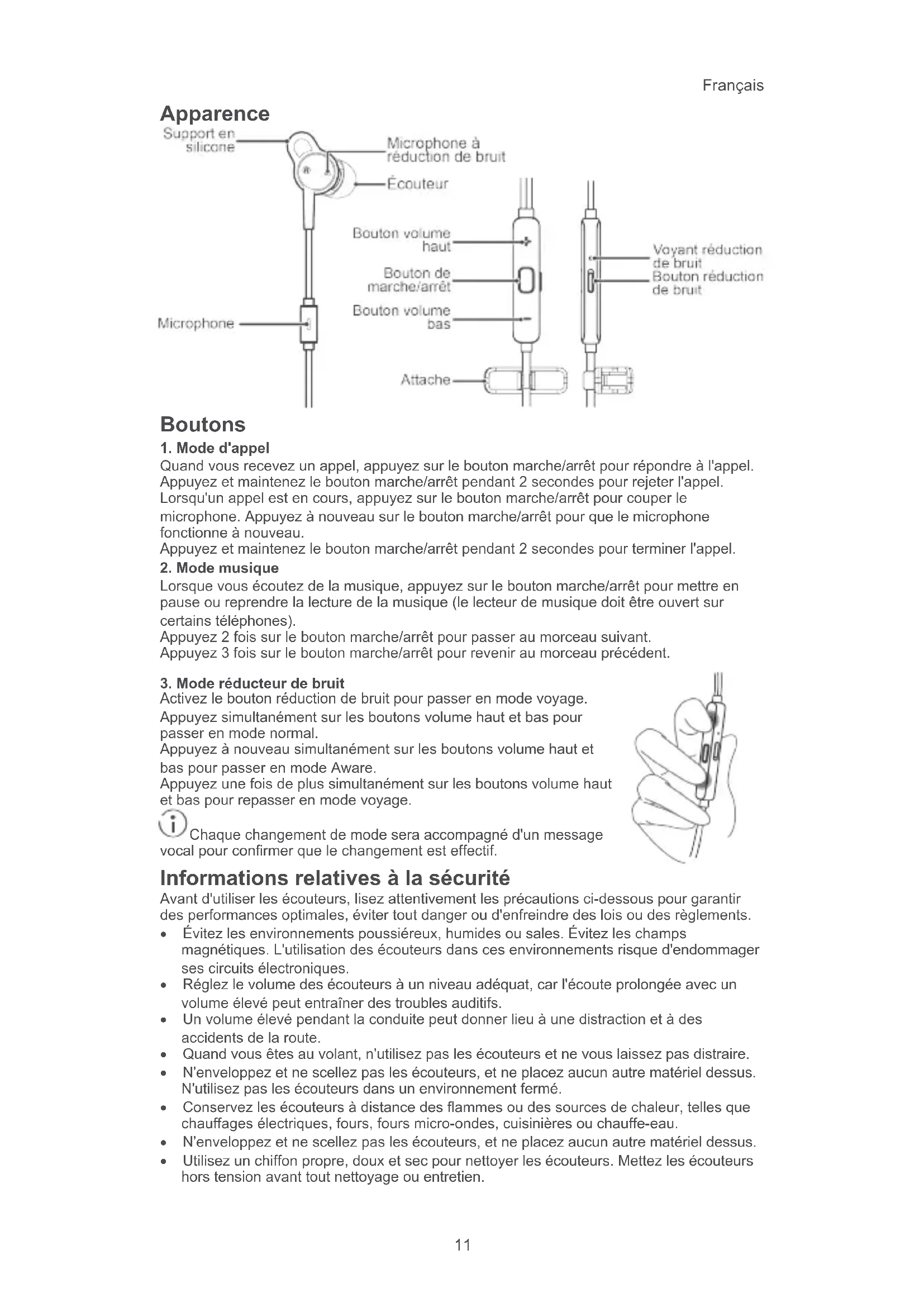 Activez le bouton réduction de bruit pour passer en mode voyage. Appuyez simultanément sur les boutons volume haut et bas pour passer en mode normal. Appuyez à nouveau simultanément sur les boutons volume haut et bas pour passer en mode Aware. Appuyez une fois de plus simultanément sur les boutons volume haut et bas pour repasser en mode voyage. Chaque changement de mode sera accompagné d'un message vocal pour confirmer que le changement est effectif. Informations relatives à la sécurité Avant d'utiliser les écouteurs, lisez attentivement les précautions ci-dessous pour garantir des performances optimales, éviter tout danger ou d'enfreindre des lois ou des règlements.