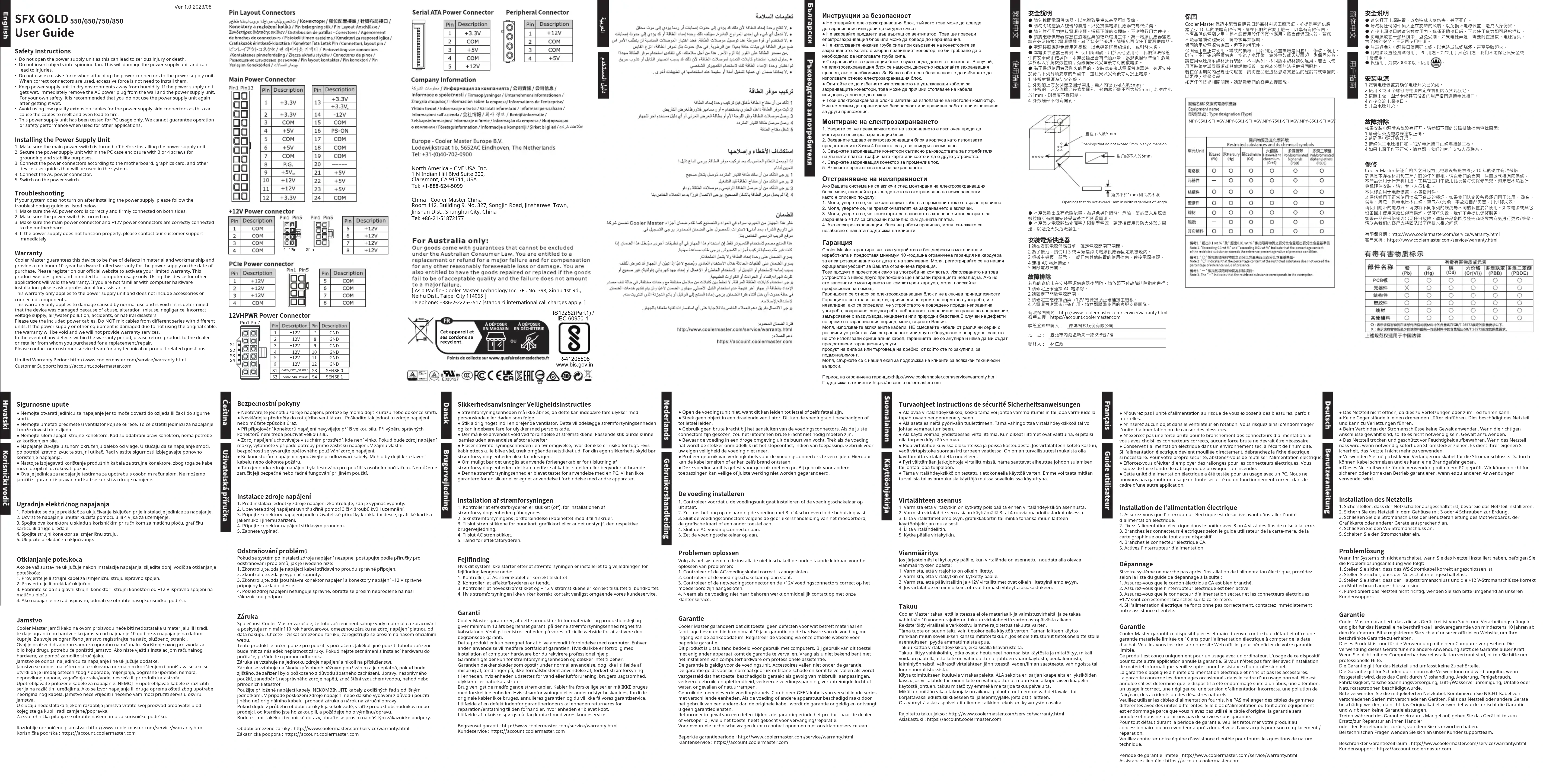 am Motherboard angeschlossen sind.4. Funktioniert das Netzteil nicht richtig, wenden Sie sich bitte umgehend an unseren Kundensupport. Cooler Master garantiert, dass dieses Gerät frei ist von Sach- und Verarbeitungsmängeln und gibt für das Netzteil eine beschränkte Hardwaregarantie von mindestens 10 Jahren ab dem Kaufdatum. Bitte registrieren Sie sich auf unserer offiziellen Website, um Ihre beschränkte Garantie zu erhalten. Dieses Produkt ist nur für die Verwendung mit einem Computer vorgesehen. Die Verwendung dieses Geräts für eine andere Anwendung setzt die Garantie außer Kraft. Wenn Sie nicht mit der Computerhardwareinstallation vertraut sind, bitten Sie bitte um professionelle Hilfe.Die Garantie gilt für das Netzteil und umfasst keine Zubehörteile. Die Garantie gilt für Schäden durch normale Verwendung und wird ungültig, wenn festgestellt wird, dass das Gerät durch Misshandlung, Änderung, Fehlgebrauch, Fahrlässigkeit, falsche Spannungsversorgung, Luft-/Wasserverunreinigung, Unfälle oder Naturkatastrophen beschädigt wurde.Bitte verwenden Sie die mitgelieferten Netzkabel. Kombinieren Sie NICHT Kabel von verschiedenen Serien mit verschiedenen Geräten. Falls das Netzteil oder andere Geräte beschädigt werden, da nicht das Originalkabel verwendet wurde, erlischt die Garantie und wir bieten keine Garantieleistungen. Treten während des Garantiezeitraums Mängel auf, geben Sie das Gerät bitte zum Ersatz/zur Reparatur an Ihren Händleroder den Einzelhändler zurück, von dem Sie es erworben haben.Bei technischen Fragen wenden Sie sich an unser Kundensupportteam. Beschränkter Garantiezeitraum : http://www.coolermaster.com/service/warranty.html Kundensupport : https://account.coolermaster.com