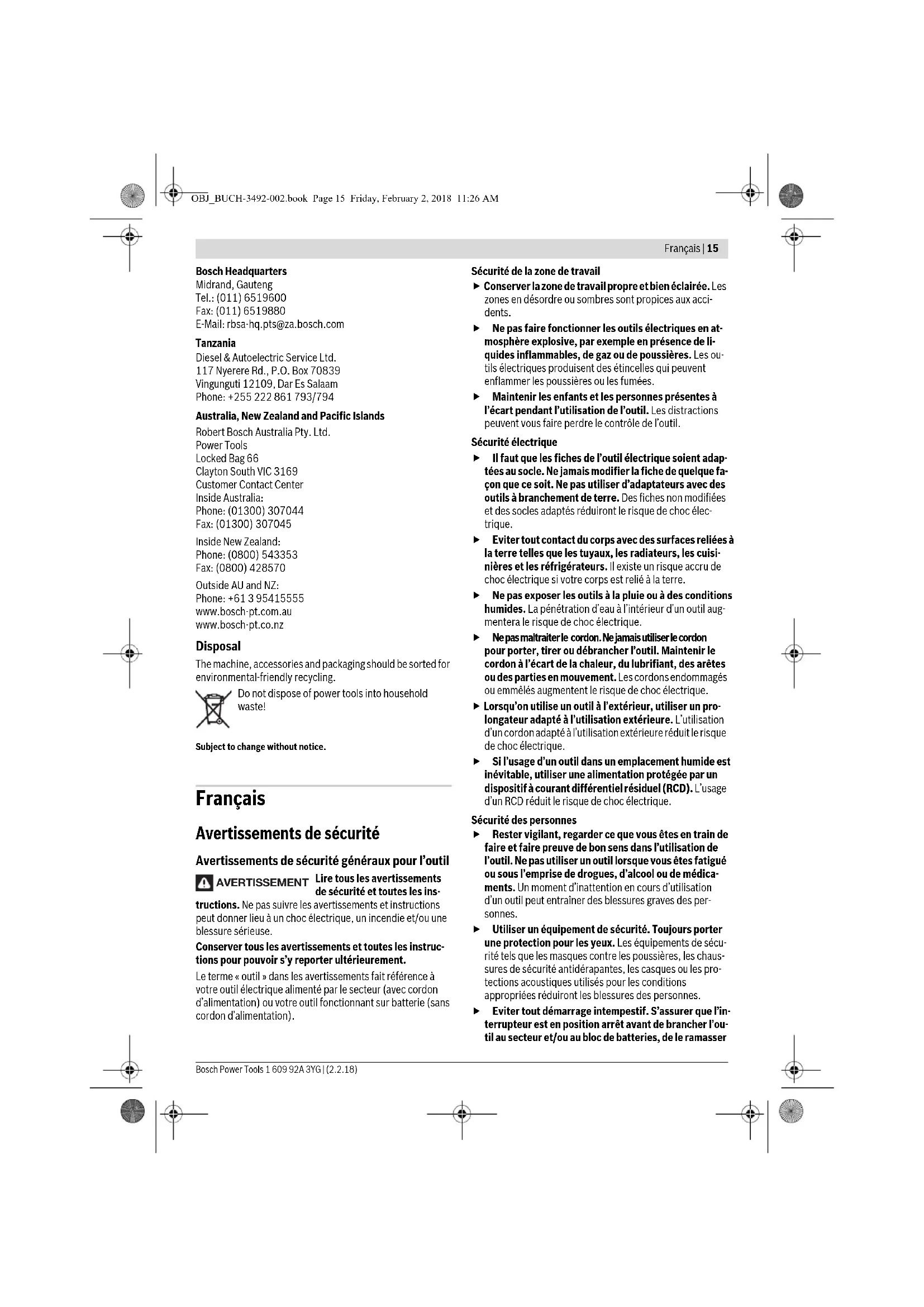 Floor Jalan RA Kartini II-S Kaveling 6 Pondok Pinang, Kebayoran Lama Jakarta Selatan 12310 Tel.: (21) 3005-5800 www.bosch-pt.co.id Malaysia Robert Bosch Sdn. Bhd.(220975-V) PT/SMY No. 8A, Jalan 13/6 46200 Petaling Jaya Selangor Tel.: (03) 79663194 Toll-Free: 1800 880188 Fax: (03) 79583838 E-Mail: kiathoe.chong@my.bosch.com www.bosch-pt.com.my Pakistan Robert Bosch Middle East FZE – Pakistan Liaison Office 2nd Floor Plaza # 10, CCA Block, DHA Phase 5 Lahore, 54810 Phone: +92(303)4444311 Email: Faisal.Khan@bosch.com Philippines Robert Bosch, Inc. 28th Floor Fort Legend Towers, 3rd Avenue corner 31st Street, Fort Bonifacio, Global City, 1634 Taguig City Tel.: (632) 8703871 Fax: (632) 8703870 www.bosch-pt.com.ph Singapore Powerwell Service Centre Ptd Ltd Bosch Authorised Service Centre (Power Tools) 4012 Ang Mo Kio Ave 10, #01-02 TECHplace Singapore 569628 Tel.: 6452 1770 Fax: 6452 1760 E-Mail: ask@powerwellsc.com www.powerwellsc.com www.bosch-pt.com.sg Thailand Robert Bosch Ltd. Liberty Square Building No. 287, 11 Floor Silom Road, Bangrak Bangkok 10500 Tel.: 02 6393111 Fax: 02 2384783 Robert Bosch Ltd., P. O. Box 2054 Bangkok 10501 www.bosch.co.th Bosch Service – Training Centre La Salle Tower Ground Floor Unit No.2 10/11 La Salle Moo 16 Srinakharin Road Bangkaew, Bang Plee Samutprakarn 10540 Tel.: 02 7587555 Fax: 02 7587525 Vietnam Branch of Bosch Vietnam Co., Ltd in HCMC Floor 10, 194 Golden Building 473 Dien Bien Phu Street Ward 25, Binh Thanh District, Ho Chi Minh City Tel.: (08) 6258 3690 Fax: (08) 6258 3692 Hotline: (08) 6250 8555 www.bosch-pt.com.vn Armenia, Azerbaijan, Georgia, Kyrgyzstan, Mongolia, Tajikistan, Turkmenistan, Uzbekistan TOO “Robert Bosch” Power Tools, After Sales Service Rayimbek Ave., 169/1 050050, Almaty, Kazakhstan Service Email: service.pt.ka@bosch.com Official Website: www.bosch.com, www.bosch-pt.com Bahrain Hatem Al Juffali Technical Equipment Establishment. Kingdom of Bahrain, Setra Highway, Al Aker Area Phone: +966126971777-311 Fax: +97317704257 Email: h.berjas@eajb.com.sa Egypt Unimar 20 Markaz kadmat El tagmoa EL Aoul – New Cairo Phone: +20 2224 76091-95 Phone: +20 2224 78072-73 Fax: +20 2224 78075 Email: adelzaki@unimaregypt.com Iran Robert Bosch Iran 3rd Floor, No 3, Maadiran Building Aftab St., Khodami St., Vanak Sq. Tehran 1994834571 Phone: +9821- 86092057 Iraq Sahba Technology Group Al Muthana airport road Baghdad Phone: +9647901906953 Phone Dubai: +97143973851 Email: bosch@sahbatechnology.com OBJ_BUCH-3492-002.book Page 13 Friday, February 2, 2018 11:26 AM14 | English 1 609 92A 3YG | (2.2.18) Bosch Power Tools Jordan Roots Arabia – Jordan Nasser Bin Jameel street, Building 37 Al Rabiah 11194 Amman Phone: +962 6 5545778 Email: bosch@rootsjordan.com Kuwait Al Qurain Automotive Trading Company Shuwaikh Industrial Area, Block 1, Plot 16, Street 3rd P.O. Box 164 – Safat 13002 Phone: 24810844 Fax: 24810879 E-mail: josephkr@aaalmutawa.com Lebanon Tehini Hana & Co. S.A.R.L. P.O. Box 90-449 Jdeideh Dora-Beirut Phone: +9611255211 Email: service-pt@tehini-hana.com Libya El Naser for Workshop Tools Swanee Road, Alfalah Area Tripoli Phone: +218 21 4811184 Oman Malatan Trading & Contracting LLC P.O. Box 131 Ruwi, 112 Sultanate of Oman Phone: +968 99886794 Email: malatanpowertools@malatan.net Qatar International Construction Solutions W L L P. O. Box 51, Doha Phone: +974 40065458 Fax: +974 4453 8585 Email: csd@icsdoha.com Saudi Arabia Juffali Technical Equipment Co. (JTECO) Kilo 14, Madinah Road, Al Bawadi District Jeddah 21431 Phone: +966 2 6672222 Ext. 1528 Fax: +966 2 6676308 Email: roland@eajb.com.sa Syria Dallal Establishment for Power Tools P.O. Box 1030 Aleppo Phone: +963212116083 Email: rita.dallal@hotmail.com United Arab Emirates Central Motors & Equipment LLC, P.O. Box 1984 Al-Wahda Street – Old Sana Building Sharjah Phone: +971 6 593 2777 Fax: +971 6 533 2269 Email: powertools@centralmotors.ae Yemen Abualrejal Trading Corporation Sana’a Zubiery St. Front to new Parliament Building Phone: +967-1-202010 Fax: +967-1-279029 Email: tech-tools@abualrejal.com Ethiopia Forever plc Kebele 2,754, BP 4806, Addis Ababa Phone: +251 111 560 600 Email: foreverplc@ethionet.et Ghana C.WOERMANN LTD. Nsawam Road/Avenor Junction, P.O. Box 1779 Accra Phone: +233 302 225 141 Kenya Robert Bosch East Africa Ltd Mpaka Road P.O. Box 856 00606 Nairobi Nigeria Robert Bosch Nigeria Ltd. 52–54 Isaac John Street P.O. Box GRA Ikeja – Lagos Republic of South Africa Customer service Hotline: (011) 6519600 Gauteng – BSC Service Centre 35 Roper Street, New Centre Johannesburg Tel.: (011) 4939375 Fax: (011) 4930126 E-Mail: bsctools@icon.co.za KZN – BSC Service Centre Unit E, Almar Centre 143 Crompton Street Pinetown Tel.: (031) 7012120 Fax: (031) 7012446 E-Mail: bsc.dur@za.bosch.com Western Cape – BSC Service Centre Democracy Way, Prosperity Park Milnerton Tel.: (021) 5512577 Fax: (021) 5513223 E-Mail: bsc@zsd.co.za OBJ_BUCH-3492-002.book Page 14 Friday, February 2, 2018 11:26 AMFrançais | 15 Bosch Power Tools 1 609 92A 3YG | (2.2.18) Bosch Headquarters Midrand, Gauteng Tel.: (011) 6519600 Fax: (011) 6519880 E-Mail: rbsa-hq.pts@za.bosch.com Tanzania Diesel & Autoelectric Service Ltd. 117 Nyerere Rd., P.O. Box 70839 Vingunguti 12109, Dar Es Salaam Phone: +255 222 861 793/794 Australia, New Zealand and Pacific Islands Robert Bosch Australia Pty. Ltd. Power Tools Locked Bag 66 Clayton South VIC 3169 Customer Contact Center Inside Australia: Phone: (01300) 307044 Fax: (01300) 307045 Inside New Zealand: Phone: (0800) 543353 Fax: (0800) 428570 Outside AU and NZ: Phone: +61 3 95415555 www.bosch-pt.com.au www.bosch-pt.co.nz Disposal The machine, accessories and packaging should be sorted for environmental-friendly recycling. Do not dispose of power tools into household waste! Subject to change without notice. Français Avertissements de sécurité Avertissements de sécurité généraux pour l’outil Lire tous les avertissements de sécurité et toutes les ins- tructio
