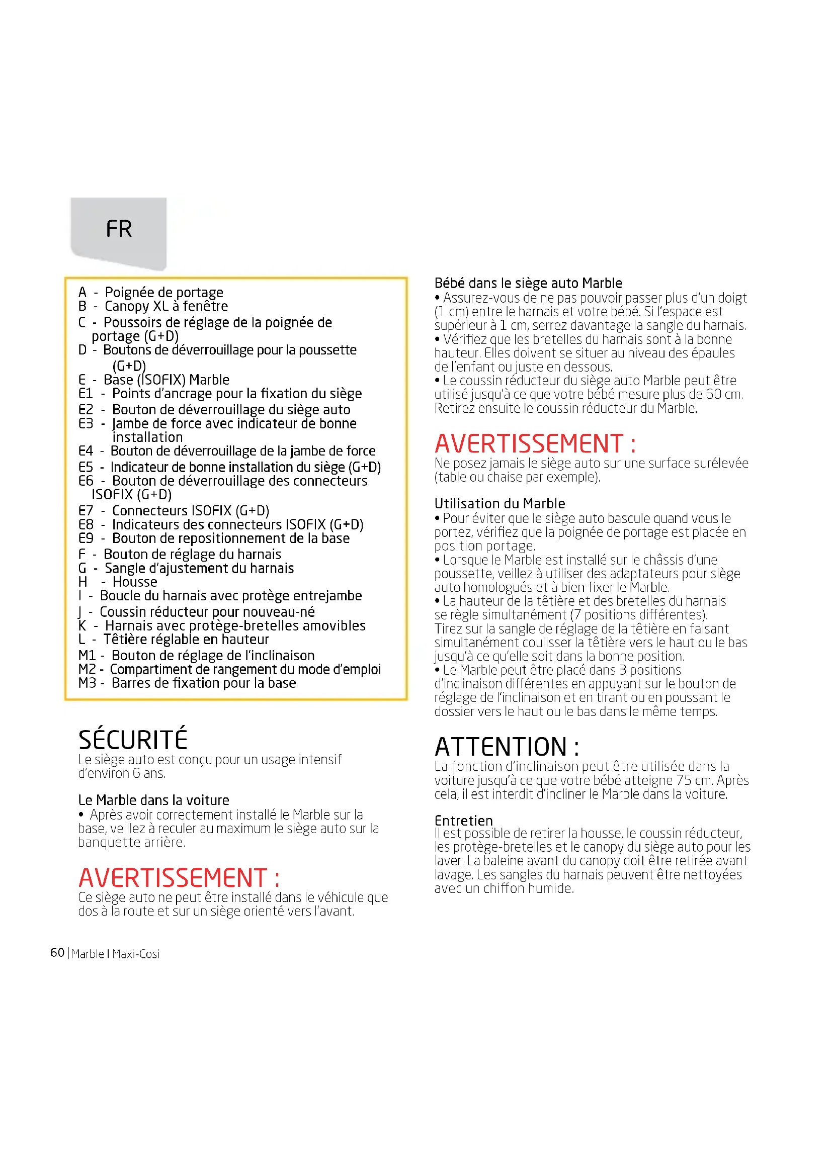 A - Poignée de portage B - Canopy XL à fenêtre C - Poussoirs de réglage de la poignée de portage (G+D) D - Boutons de déverrouillage pour la poussette (G+D) E - Base (ISOFIX) Marble E1 - Points d’ancrage pour la fixation du siège E2 - Bouton de déverrouillage du siège auto E3 - Jambe de force avec indicateur de bonne installation E4 - Bouton de déverrouillage de la jambe de force E5 - Indicateur de bonne installation du siège (G+D) E6 - Bouton de déverrouillage des connecteurs ISOFIX (G+D) E7 - Connecteurs ISOFIX (G+D) E8 - Indicateurs des connecteurs ISOFIX (G+D) E9 - Bouton de repositionnement de la base F - Bouton de réglage du harnais G - Sangle d’ajustement du harnais H - Housse I - Boucle du harnais avec protège entrejambe J - Coussin réducteur pour nouveau-né K - Harnais avec protège-bretelles amovibles L - Têtière réglable en hauteur M1 - Bouton de réglage de l’inclinaison M2 - Compartiment de rangement du mode d’emploi M3 - Barres de fixation pour la base SÉCURITÉ Le siège auto est conçu pour un usage intensif d’environ 6 ans. Le Marble dans la voiture