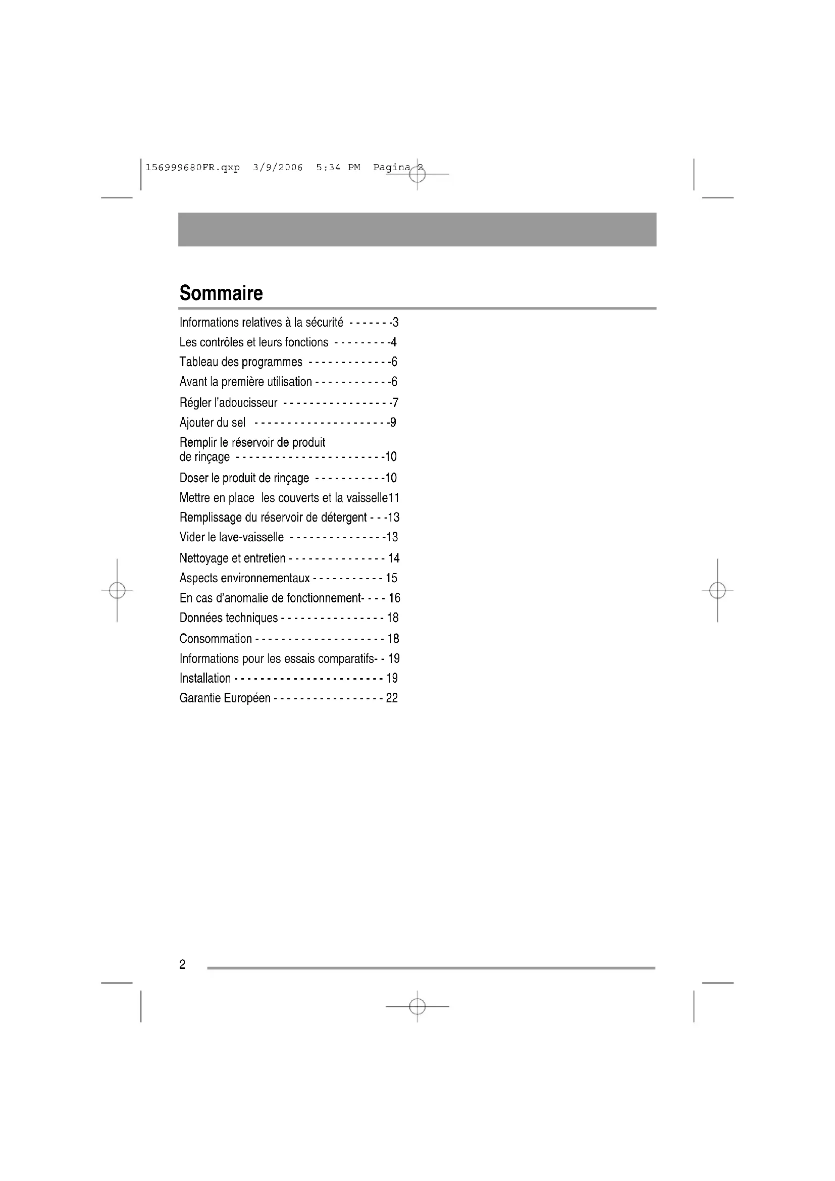 Manuel d’utilisation Lave-vaisselle ZDF 221 156999680FR.qxp 3/9/2006 5:34 PM Pagina 12 Sommaire Informations relatives à la sécurité - - - - - - -3 Les contrôles et leurs fonctions - - - - - - - - -4 Tableau des programmes - - - - - - - - - - - - -6 Avant la première utilisation - - - - - - - - - - - -6 Régler l’adoucisseur - - - - - - - - - - - - - - - - -7 Ajouter du sel - - - - - - - - - - - - - - - - - - - - -9 Remplir le réservoir de produit de rinçage - - - - - - - - - - - - - - - - - - - - - - -10 Doser le produit de rinçage - - - - - - - - - - -10 Mettre en place les couverts et la vaisselle11 Remplissage du réservoir de détergent - - -13 Vider le lave-vaisselle - - - - - - - - - - - - - - -13 Nettoyage et entretien - - - - - - - - - - - - - - - 14 Aspects environnementaux - - - - - - - - - - - 15 En cas d’anomalie de fonctionnement- - - - 16 Données techniques - - - - - - - - - - - - - - - - 18 Consommation - - - - - - - - - - - - - - - - - - - - 18 Informations pour les essais comparatifs- - 19 Installation - - - - - - - - - - - - - - - - - - - - - - - 19 Garantie Européen - - - - - - - - - - - - - - - - - 22 156999680FR.qxp 3/9/2006 5:34 PM Pagina 2Utilisation ● Ce lave-vaisselle est conçu pour laver la vaisselle et les ustensiles de cuisine pouvant être lavés en machine. ● N’utilisez pas de solvants dans votre lave- vaisselle. Ceux-ci pourraient provoquer une explosion. ● Les couteaux et autres objets pointus ou tranchants doivent être placés dans le panier à couverts avec la pointe vers le bas, ou en position horizontale dans le panier supérieur. ● N’utilisez que des produits (détergent, sel et produit de rinçage) conçus pour le lave-vaisselle. ● Evitez d’ouvrir la porte tandis que la machine fonctionne : une vapeur brûlante peut s’en échapper. ● Ne sortez pas la vaisselle du lave-vaisselle avant la fin du cycle de lavage. ● Après utilisation, débranchez l’appareil et fermez le robinet. ● Cet appareil ne peut être entretenu et réparé que par un technicien autorisé, exclusivement avec des pièces d’origine. Sécurité générale ● Les détergents pour lave-vaisselle peuvent occasionner des brûlures chimiques au niveau des yeux, de la bouche et de la gorge. Potentiellement dangereux ! Respectez les instructions de sécurité du fabricant de détergent pour lave-vaisselle. ● L’eau de votre lave-vaisselle n’est pas potable. Des résidus de détergent peuvent subsister dans votre lave-vaisselle. ● Assurez-vous que la porte du lave-vaisselle est toujours fermée lorsque vous n’êtes pas occupé à le remplir ou le vider. Vous éviterez ainsi que quelqu’un trébuche sur la porte ouverte et ne se blesse. ● Ne marchez pas et ne vous asseyez pas sur la porte ouverte. Sécurité des enfants ● Cette machine est conçue pour être utilisée par des adultes. Ne laissez pas les enfants utiliser le lave-vaisselle sans contrôle. ● Ne laissez pas les emballages à portée des enfants. Ils pourraient s’asphyxier. ● Conservez tous les détergents à un endroit sûr, hors de portée des enfants. ● Eloignez les enfants du lave-vaisselle lorsque la porte est ouverte. Installation ● Vérifiez que votre lave-vaisselle n’a subi aucun dommage en cours de transport. Ne branchez jamais une machine endommagée. Si votre lave- vaisselle est endommagé, contactez votre fournisseur. ● Retirez tous les emballages avant utilisation.● Les branchements électriques et hydrauliques de cette machine doivent être effectués par une personne qualifiée et compétente. ● Pour votre sécurité, ne modifiez pas les spécifications ou ne tentez pas de modifier ce produit en aucune façon.