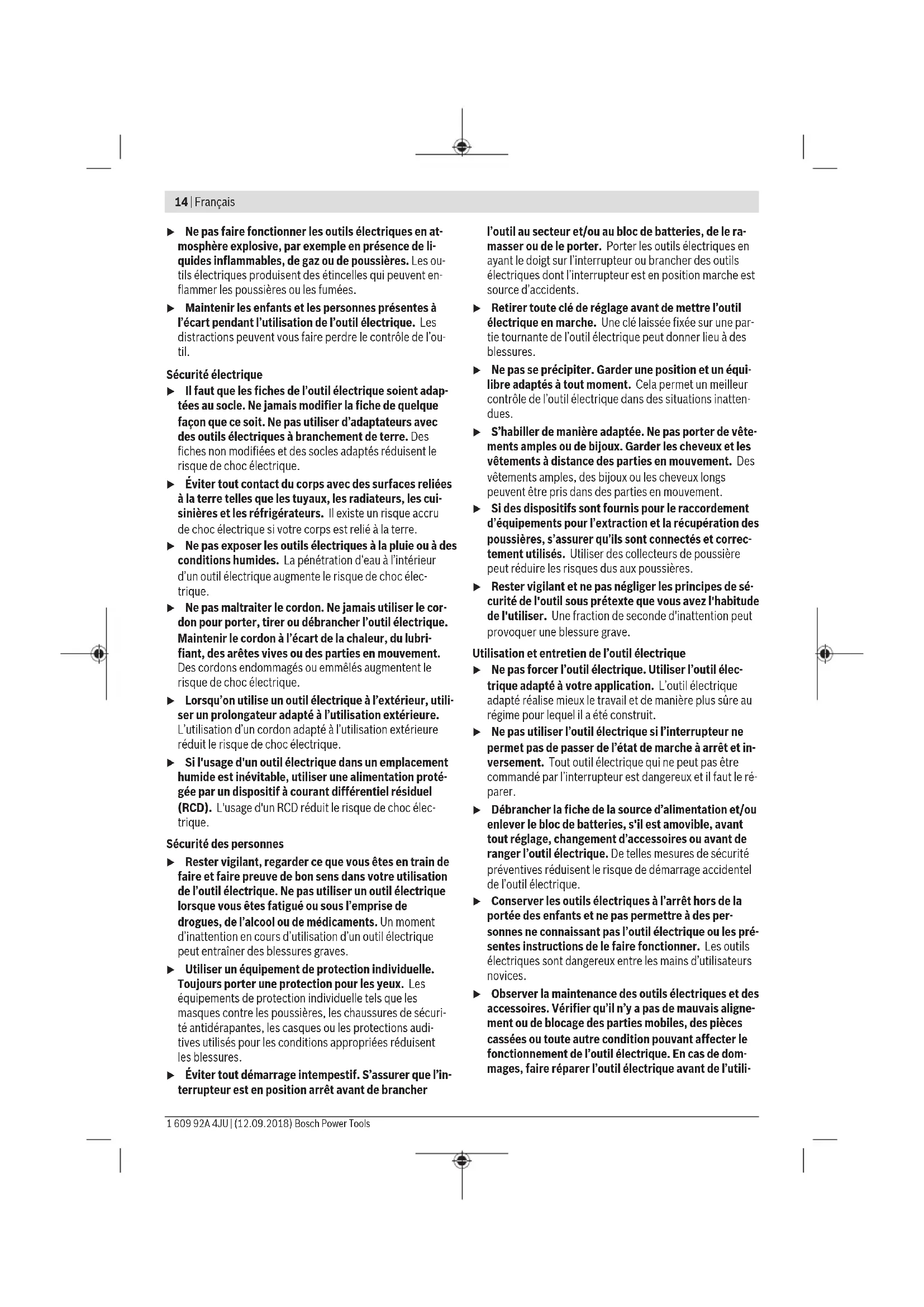 mm 184 Épaisseur de lame maxi mm 2,0 Alésage mm 15,9 Poids selon EPTA-Procedure 01:2014 kg 5,7 Indice de protection / II Ces indications sont valables pour une tension nominale [U] de 220V. Elles peuvent varier lorsque la tension diffère de cette valeur et sur certaines versions destinées à certains pays. Montage u N’utilisez que des lames de scie dont la vitesse de ro- tation maximale admissible est supérieure au régime à vide de votre outil électroportatif. Montage/changement de la lame de scie u Débranchez le câble d’alimentation de la prise avant d’effectuer des travaux quels qu’il soient sur l’outil électroportatif. u Portez toujours des gants de protection pour monter la lame de scie. Lors d’un contact avec la lame de scie, il y a un risque de blessures. u N’utilisez que des lames de scie conformes aux carac- téristiques techniques indiquées dans la présente no- tice d’utilisation et aux données techniques inscrites sur l’outil électroportatif. u N’utilisez jamais de roues abrasives comme acces- soire de travail. u La vitesse maximale admissible de l’accessoire doit être au moins égale à la vitesse maximale indiquée sur l’outil électroportatif. Les accessoires qui tournent plus vite que leur vitesse maximale admissible peuvent se rompre et voler en éclat. Démontage de la lame de scie (voir figure A) Pour changer l’outil, le mieux est de poser l’outil électropor- tatif sur la partie avant du carter moteur. – Appuyez sur la touche de blocage de broche (4) et main- tenez-la enfoncée. u N’actionnez la touche de blocage de broche (4)que lorsque la broche d’entraînement est à l’arrêt. L’outil électroportatif risque sinon d’être endommagé. – Dévissez avec la clé hexagonale mâle (17) la vis de ser- rage(18) dans le sens de rotation ➊. – Replacez le capot de protection à mouvement pendulaire (11) et tenez-le fermement. – Retirez la flasque de serrage (19) et la lame de scie (20) de la broche d'entraînement (22). Choix de la lame de scie Vous trouverez une vue d’ensemble des lames de scie re- commandées à la fin de cette notice d’utilisation. Mise en place d’une lame de scie (voir figure A) Pour changer de lame, le mieux est de poser l’outil électro- portatif sur la partie avant du carter moteur. – Nettoyez la lame de scie (20) et toutes les pièces de fixa- tion. – Rabattez vers l’arrière le capot de protection à mouve- ment pendulaire (11) et tenez-le fermement. – Placez la lame de scie (20) sur le flasque porte-lame (21). Le sens de coupe des dents (sens de la flèche sur la lame de scie) et la flèche indiquant le sens de rotation sur le capot de protection (11) doivent coïncider. Français | 17 Bosch Power Tools 1 609 92A 4JU | (12.09.2018)18 | Français 1 609 92A 4JU | (12.09.2018) Bosch Power Tools – Placez le flasque de serrage (19) et vissez la vis de ser- rage dans le sens de rotation ➋. Veillez à bien positionner le flasque porte-lame (21) et le flasque de serrage (19). – Appuyez sur le bouton de blocage de broche (4) et main- tenez-le enfoncée. – À l’aide de la clé mâle pour vis à six pans creux (17), ser- rez la vis de serrage dans le sens de rotation ➋. Le couple de serrage doit être de 6 à 9Nm, ce qui correspond à un serrage manuel plus ¼ de tour. Aspiration de poussières/de copeaux Les poussières de matériaux tels que peintures contenant du plomb, certains bois, minéraux ou métaux, peuvent être nui- sibles à la santé. Le contact avec les poussières ou leur inha- lation peut entraîner des réactions allergiques et/ou des ma- ladies respiratoires auprès de l’utilisateur ou des personnes se trouvant à proximité. Certaines poussières telles que les poussières de chêne ou de hêtre sont considérées comme cancérigènes, surtout en association avec des additifs pour le traitement du bois (chromate, lasure). Les matériaux contenant de l’amiante ne doivent être travaillés que par des personnes qualifiées. – Si possible, utilisez un dispositif d’aspiration des pous- sières approprié au matériau. – Veillez à bien aérer la zone de travail. – Il est recommandé de porter un masque respiratoire avec un niveau de filtration de classe P2. Respectez les règlements spécifiques aux matériaux à traiter en vigueur dans votre pays. u Évitez toute accumulation de poussières sur le lieu de travail. Les poussières peuvent facilement s’enflammer. Utilisation Modes de fonctionnement u Débranchez le câble d’alimentation de la prise avant d’effectuer des travaux quels qu’il soient sur l’outil électroportatif. Réglage de la profondeur de coupe (voir figure B) u Adaptez la profondeur de coupe à l'épaisseur de la pièce. Il convient que moins de la totalité d’une dent par- mi toutes les dents de la lame soit visible sous la pièce à travailler. Desserrez le levier de serrage (23). Pour réduire la profon- deur de coupe, éloignez la scie de la plaque de base (12), pour l'augmenter, rapprochez la scie de la plaque (12). Ré- gler la mesure souhaitée sur la graduation de la profondeur de coupe. Resserrez le levier de serrage (23). Si, après avoir desserré le levier de serrage (23), la profon- deur de coupe ne peut pas être entièrement réglée, retirez le levier de serrage (23) de la scie et poussez-le vers le bas. Relâchez le levier de serrage (23). Répétez cette opération jusqu’à ce que la profondeur souhaitée de coupe puisse être réglée. La force de serrage du levier de serrage (23) peut être ré- ajustée. Desserrez à cet effet le levier de serrage (23) et ser- rez-le à nouveau d’au moins 30° dans le sens antihoraire. Si, après avoir serré le levier de serrage (23) la profondeur de coupe ne peut pas être convenablement réglée, retirez le levier de serrage (23) de la scie et poussez-le vers le haut. Relâchez le levier de serrage (23). Répétez cette opération jusqu’à ce que la prof