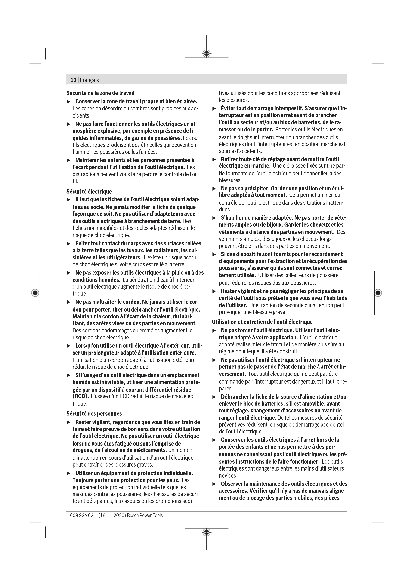 The 0° cut mark (9) indicates the position of the saw blade when making a right-angled cut. The 45° cut mark (8) in- dicates the position of the saw blade when making a 45° cut. For a precise cut, place the circular saw against the work- piece as shown in the figure. We recommend making a test cut. Start-up u Pay attention to the mains voltage. The voltage of the power source must match the voltage specified on the rating plate of the power tool. Power tools marked with 230V can also be operated with 220V. u Products that are only sold in AUS and NZ: Use a resid- ual current device (RCD) with a nominal residual current of 30 mA or less. Switching on/off u Make sure that you are able to press the On/Off switch without releasing the handle. To start the power tool, first press the lock-off switch (2), then press and hold the on/off switch (1). To switch off the power tool, release the on/off switch (1). Note: For safety reasons, the on/off switch (1) cannot be locked; it must remain pressed during the entire operation. Practical advice u Pull the plug out of the socket before carrying out any work on the power tool. The width of cut varies depending on the saw blade used. 1 609 92A 62L | (18.11.2020) Bosch Power ToolsFrançais | 11 Protect saw blades against shock and impact. Guide the power tool evenly, pushing it gently in the cutting direction. Applying too much pressure to the power tool when moving it in the cutting direction significantly reduces the service life of the application tools and can damage the power tool. The sawing performance and the quality of the cut essen- tially depend on the condition and the tooth shape of the saw blade. This is why you should only use sharp saw blades that are suitable for the material being machined. Sawing wood Choosing the right saw blade depends on the wood type, wood quality and whether cuts with or against the grain are required. Making cuts in spruce with the grain produces long, spiral- shaped chips. Beech and oak dust is especially detrimental to health. Therefore, work only with dust extraction. Sawing with a parallel guide (see figure C) The parallel guide (10) allows you to make precise cuts along the edge of a workpiece and cut strips with the same dimensions. Loosen the wing bolt (7) and slide the scale of the parallel guide (10) through the guide in the base plate (12). Adjust the desired cutting width as a scale value at the correspond- ing (9) or (8) cut mark, see the section "Cut marks". Retighten the wing bolt (7). Sawing with an auxiliary guide (see figure D) For working on large workpieces or for cutting straight edges, you can securely fasten a board or rail to the work- piece as an auxiliary guide. The circular saw can be guided along the path of this auxiliary guide with the base plate. Maintenance and Service Maintenance and Cleaning u Pull the plug out of the socket before carrying out any work on the power tool. u To ensure safe and efficient operation, always keep the power tool and the ventilation slots clean. In order to avoid safety hazards, if the power supply cord needs to be replaced, this must be done by Bosch or by an after-sales service centre that is authorised to repair Bosch power tools. The retracting blade guard must always be able to move freely and retract automatically. It is therefore important to keep the area around the retracting blade guard clean at all times. Remove dust and chips with a paintbrush. Non-coated saw blades can be protected against corrosion using a thin layer of acid-free oil. Remove the oil again before sawing as failure to do so will stain the wood. Resin or glue residue on the saw blade has a detrimental ef- fect on the quality of the cut. You should therefore clean saw blades straight after use. After-Sales Service and Application Service Our after-sales service responds to your questions concern- ing maintenance and repair of your product as well as spare parts. You can find explosion drawings and information on spare parts at: www.bosch-pt.com The Bosch product use advice team will be happy to help you with any questions about our products and their accessor- ies. In all correspondence and spare parts orders, please always include the 10‑digit article number given on the nameplate of the product. Malaysia Robert Bosch Sdn. Bhd.(220975-V) PT/SMY No. 8A, Jalan 13/6 46200 Petaling Jaya Selangor Tel.: (03) 79663194 Toll-Free: 1800 880188 Fax: (03) 79583838 E-Mail: kiathoe.chong@my.bosch.com www.bosch-pt.com.my You can find further service addresses at: www.bosch-pt.com/serviceaddresses Disposal The power tool, accessories and packaging should be re- cycled in an environmentally friendly manner. Do not dispose of power tools along with household waste. Français Consignes de sécurité Avertissements de sécurité généraux pour l’outil électrique AVERTISSE- MENT Lire tous les avertissements de sé- curité, les instructions, les illustra- tions et les spécifications fournis avec cet outil électrique. Ne pas suivre les instructions énumérées ci-dessous peut provoquer un choc électrique, un incendie et/ou une blessure sérieuse. Conserver tous les avertissements et toutes les instruc- tions pour pouvoir s'y reporter ultérieurement. Le terme "outil électrique" dans les avertissements fait réfé- rence à votre outil électrique alimenté par le secteur (avec cordon d’alimentation) ou votre outil électrique fonctionnant sur batterie (sans cordon d’alimentation). Bosch Power Tools 1 609 92A 62L | (18.11.2020)12 | Français Sécurité de la zone de travail u Conserver la zone de travail propre et bien éclairée. Les zones en désordre ou sombres sont propices aux ac- cidents. u Ne pas faire fonctionner les outils électriques en at- mosphère explosive, par exemple en présence de li- quides inflammables, de gaz ou de poussières. Les ou- tils électriques produisent des étincelles qui peuvent en- flammer les poussières ou les fumées. u Maintenir les enfants