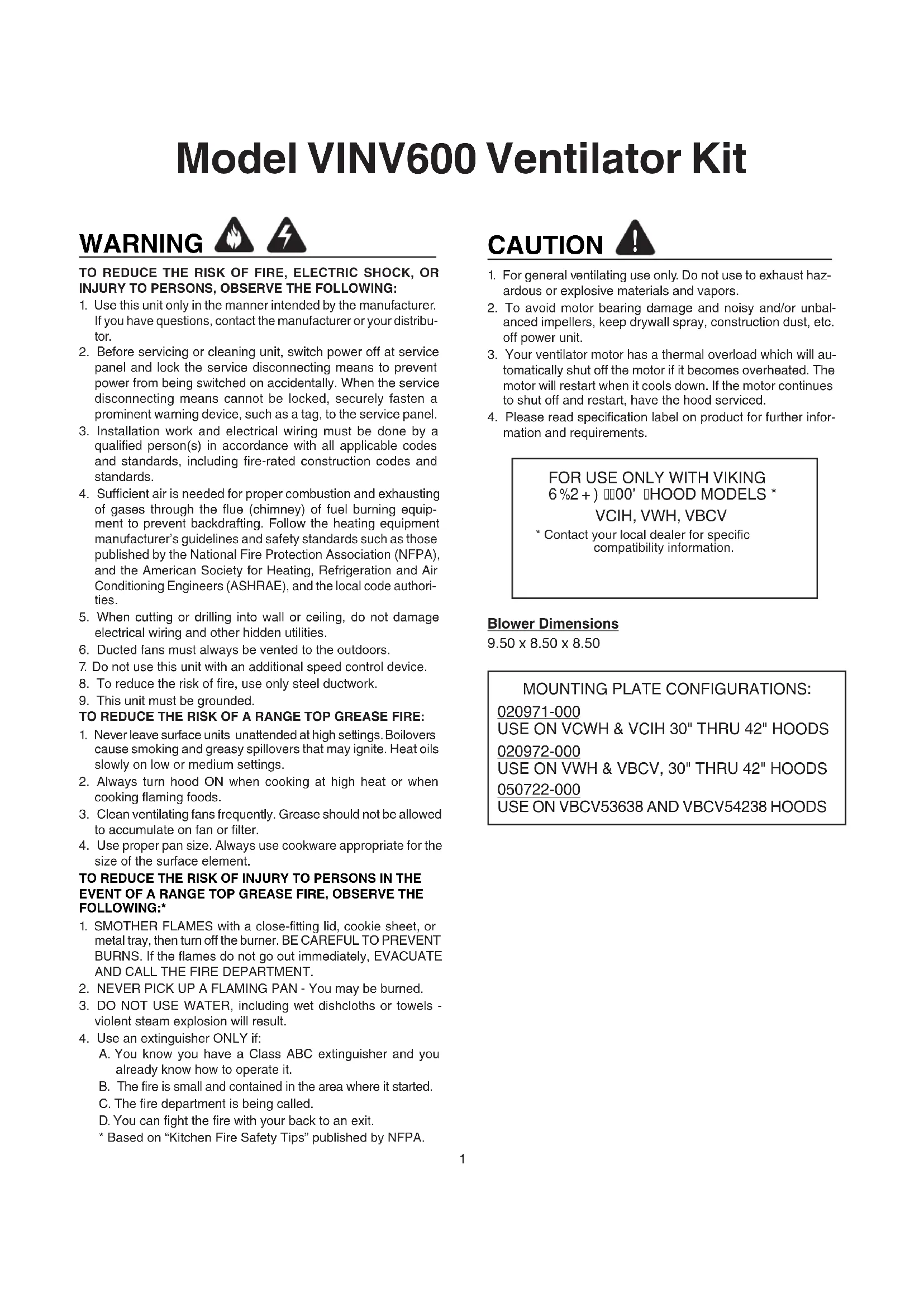 Contactez votre concessionnaire localpour des renseignements précis en matière de compatibilité. Dimensions de ventilateur 24,1 cm (9.50") x 21,6 cm (8.50") x 21,6 cm (8.50") 4. Utilisez un extincteur SEULEMENT si:A. Il s’agit d’un extincteur de classe ABC et que vous savez comment vous en servir.B. Il s’agit d’un petit feu qui ne se propage pas ailleurs que sur la cuisinière. C. Vous avez appelé votre poste local de lutte contre les incendies. D. Vous pouvez combattre le feu tout en ayant accès à une sortie.* Basé sur “Kitchen Fire Safety Tips” édité par NFPA. CONFIGURATIONS DE LA PLAQUE DE MONTAGE : 020971-000