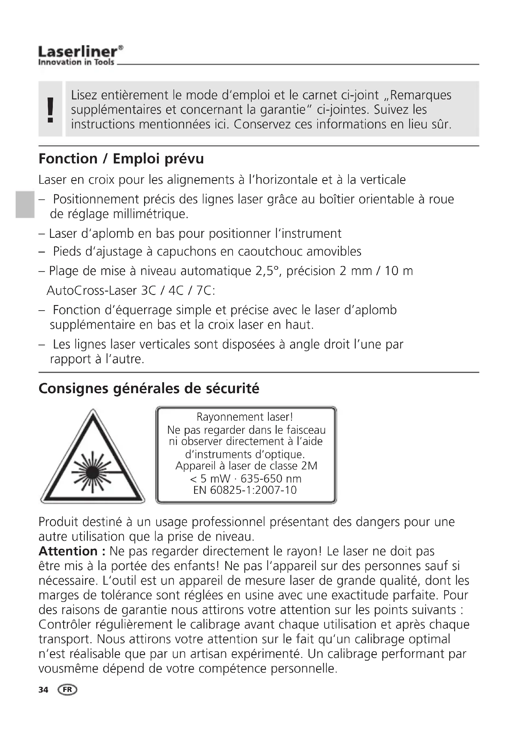 Manual_ACL-2C,3C,4C,7C_Rev.0512_DE-SE.indd 33 31.05.12 14:4734 Fonction / Emploi prévu Laser en croix pour les alignements à l‘horizontale et à la verticale – Positionnement précis des lignes laser grâce au boîtier orientable à roue de réglage millimétrique. – Laser d‘aplomb en bas pour positionner l‘instrument – Pieds d‘ajustage à capuchons en caoutchouc amovibles – Plage de mise à niveau automatique 2,5°, précision 2 mm / 10 m AutoCross-Laser 3C / 4C / 7C: – Fonction d’équerrage simple et précise avec le laser d’aplomb supplémentaire en bas et la croix laser en haut. – Les lignes laser verticales sont disposées à angle droit l’une par rapport à l’autre. Consignes générales de sécurité Produit destiné à un usage professionnel présentant des dangers pour une autre utilisation que la prise de niveau. Attention : Ne pas regarder directement le rayon! Le laser ne doit pas être mis à la portée des enfants! Ne pas l‘appareil sur des personnes sauf si nécessaire. L‘outil est un appareil de mesure laser de grande qualité, dont les marges de tolérance sont réglées en usine avec une exactitude parfaite. Pour des raisons de garantie nous attirons votre attention sur les points suivants : Contrôler régulièrement le calibrage avant chaque utilisation et après chaque transport. Nous attirons votre attention sur le fait qu‘un calibrage optimal n‘est réalisable que par un artisan expérimenté. Un calibrage performant par vousmême dépend de votre compétence personnelle. Rayonnement laser! Ne pas regarder dans le faisceau ni observer directement à l’aide d’instruments d’optique. Appareil à laser de classe 2M < 5 mW · 635-650 nm EN 60825-1:2007-10 Lisez entièrement le mode d‘emploi et le carnet ci-joint „Remarques supplémentaires et concernant la garantie“ ci-jointes. Suivez les instructions mentionnées ici. Conservez ces informations en lieu sûr.