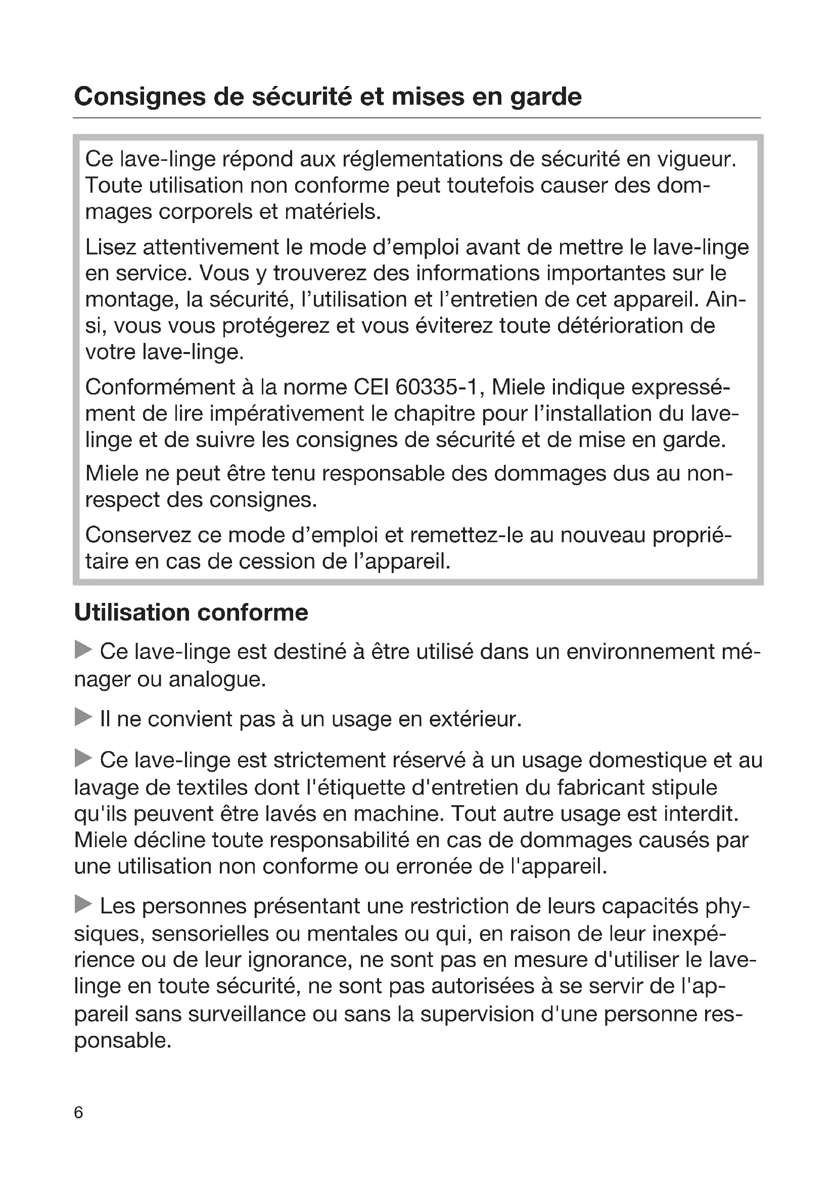 Ce lave-linge répond aux réglementations de sécurité en vigueur. Toute utilisation non conforme peut toutefois causer des dom- mages corporels et matériels. Lisez attentivement le mode d’emploi avant de mettre le lave-linge en service. Vous y trouverez des informations importantes sur le montage, la sécurité, l’utilisation et l’entretien de cet appareil. Ain- si, vous vous protégerez et vous éviterez toute détérioration de votre lave-linge. Conformément à la norme CEI60335-1, Miele indique expressé- ment de lire impérativement le chapitre pour l’installation du lave- linge et de suivre les consignes de sécurité et de mise en garde. Miele ne peut être tenu responsable des dommages dus au non- respect des consignes. Conservez ce mode d’emploi et remettez-le au nouveau proprié- taire en cas de cession de l’appareil. Utilisation conforme Ce lave-linge est destiné à être utilisé dans un environnement mé- nager ou analogue. Il ne convient pas à un usage en extérieur. Ce lave-linge est strictement réservé à un usage domestique et au lavage de textiles dont l'étiquette d'entretien du fabricant stipule qu'ils peuvent être lavés en machine. Tout autre usage est interdit. Miele décline toute responsabilité en cas de dommages causés par une utilisation non conforme ou erronée de l'appareil. Les personnes présentant une restriction de leurs capacités phy- siques, sensorielles ou mentales ou qui, en raison de leur inexpé- rience ou de leur ignorance, ne sont pas en mesure d'utiliser le lave- linge en toute sécurité, ne sont pas autorisées à se servir de l'ap- pareil sans surveillance ou sans la supervision d'une personne res- ponsable.Consignes de sécurité et mises en garde