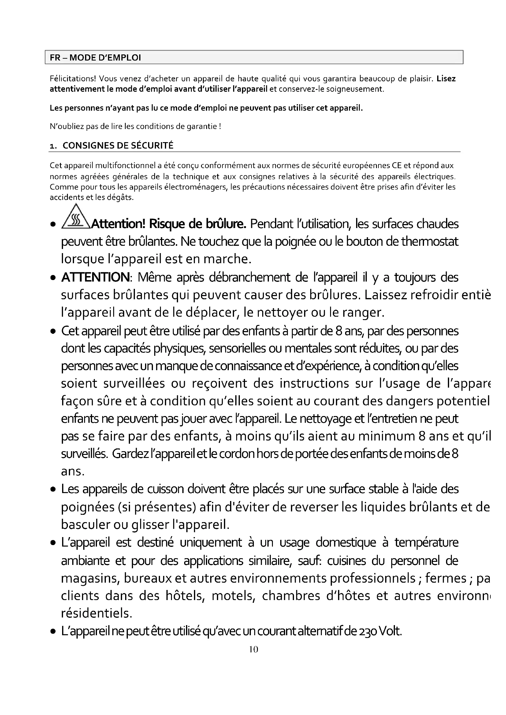 Cet appareil multifonctionnel a été conçu conformément aux normes de sécurité européennes CE et répond aux normes agréées générales de la technique et aux consignes relatives à la sécurité des appareils électriques. Comme pour tous les appareils électroménagers, les précautions nécessaires doivent être prises afin d’éviter les accidents et les dégâts.