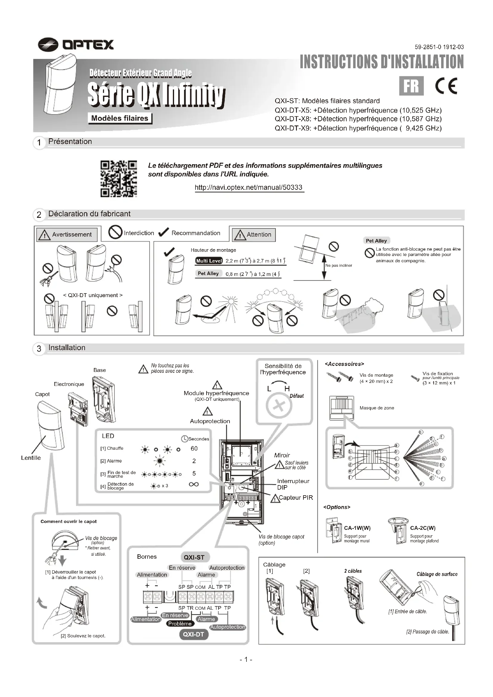 Série QX Infinity Détecteur Extérieur Grand Angle Détecteur Extérieur Grand Angle Série QX Infinity QXI-ST: Modèles filaires standardQXI-DT-X5: +Détection hyperfréquence (10,525 GHz)QXI-DT-X8: +Détection hyperfréquence (10,587 GHz)QXI-DT-X9: +Détection hyperfréquence ( 9,425 GHz)Modèles filaires PrésentationLe téléchargement PDF et des informations supplémentaires multilingues sont disponibles dans l'URL indiquée.http://navi.optex.net/manual/50333 Déclaration du fabricant AvertissementInterdiction Recommandation< QXI-DT uniquement > Multi Level Pet Alley