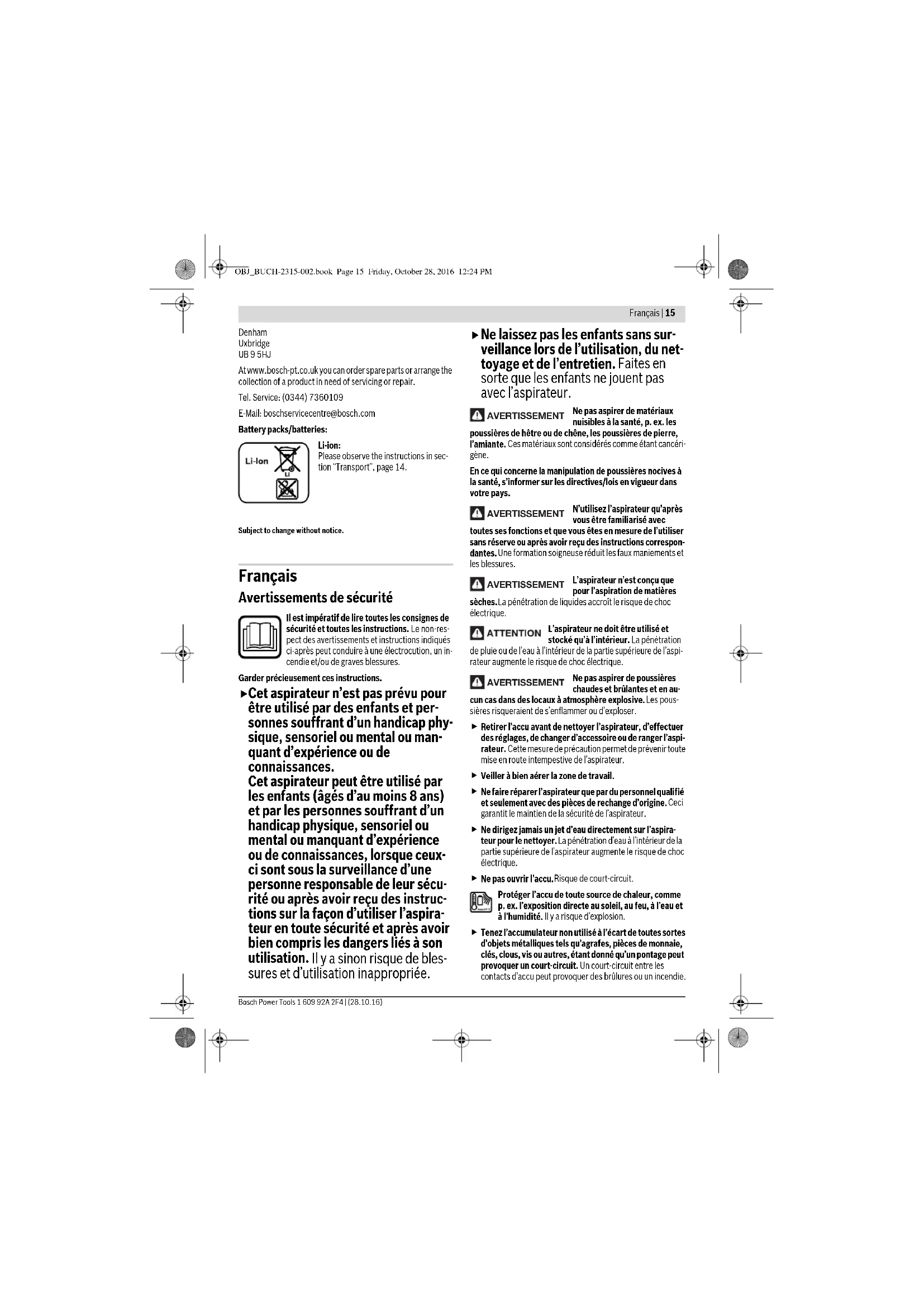 permettent de conserver une capacité d’aspiration optimale. Au cas où la capacité d’aspiration ne serait plus atteinte, envoyez l’aspirateur au service après-vente. Service Après-Vente et Assistance Notre Service Après-Vente répond à vos questions concernant la réparation et l’entretien de votre produit et les pièces de re- change. Vous trouverez des vues éclatées ainsi que des informa- tions concernant les pièces de rechange également sous : www.bosch-pt.com Les conseillers techniques et assistants Bosch sont à votre dis- position pour répondre à vos questions concernant nos produits et leurs accessoires. Pour toute demande de renseignement ou commande de pièces de rechange, précisez-nous impérativement le numéro d’article à dix chiffres indiqué sur la plaque signalétique du produit. France Passez votre commande de pièces détachées directement en ligne sur notre site www.bosch-pt.fr. Vous êtes un utilisateur, contactez : Le Service Clientèle Bosch Outillage Electroportatif Tel. : 0811 360122 (coût d’une communication locale) Fax : (01) 49454767 E-Mail : contact.outillage-electroportatif@fr.bosch.com Vous êtes un revendeur, contactez : Robert Bosch (France) S.A.S. Service Après-Vente Electroportatif OBJ_BUCH-2315-002.book Page 18 Friday, October 28, 2016 12:24 PMEspañol | 19 Bosch Power Tools 1 609 92A 2F4 | (28.10.16) 126, rue de Stalingrad 93705 DRANCY Cédex Tel. : (01) 43119006 Fax : (01) 43119033 E-Mail : sav.outillage-electroportatif@fr.bosch.com Belgique, Luxembourg Tel. : +32 2 588 0589 Fax : +32 2 588 0595 E-Mail : outillage.gereedschap@be.bosch.com Suisse Passez votre commande de pièces détachées directement en ligne sur notre site www.bosch-pt.com/ch/fr. Tel. : (044) 8471512 Fax : (044) 8471552 E-Mail : Aftersales.Service@de.bosch.com Transport Les batteries Lithium-ion sont soumises aux règlements de transport des matières dangereuses. L’utilisateur peut transpor- ter les batteries par voie routière sans mesures supplémen- taires. Lors d’une expédition par tiers (par ex. : transport aérien ou en- treprise de transport), les mesures à prendre spécifiques à l’em- ballage et au marquage doivent être observées. Dans un tel cas, lors de la préparation de l’envoi, il est impératif de faire appel à un expert en transport des matières dangereuses. N’expédiez les accus que si le carter n’est pas endommagé. Re- couvrez les contacts non protégés et emballez l’accu de manière à ce qu’il ne puisse pas se déplacer dans l’emballage. Veuillez également respecter les règlementations supplémen- taires éventuellement en vigueur. Élimination des déchets Prière de rapporter l’aspirateur, les accus et les embal- lages dans un Centre de recyclage respectueux de l’en- vironnement. Ne jetez pas l’aspirateur ou les accus/piles avec les ordures ménagères ! Seulement pour les pays de l’Union Européenne : Conformément à la directive européenne 2012/19/CE, les équipements électriques hors d’usage, et conformément à la directive européenne 2006/66/CE, les accus/piles usagés ou défectueux doivent être collectés séparément et être recyclés en respectant l’environnement. Les batteries/piles dont on ne peut plus se servir peuvent être déposées directement auprès de : Suisse Batrec AG 3752 Wimmis BE Batteries/piles : Lithium ion : Respectez les indications données dans le chapitre « Transport », page 19. Sous réserve de modifications. Español Instrucciones de seguridad Lea íntegramente estas advertencias de peli- gro e instrucciones. En caso de no atenerse a las advertencias de peligro e instrucciones siguien- tes, ello puede ocasionar una descarga eléctrica, un incendio y/o lesión grave. Guarde estas instrucciones en un lugar seguro.