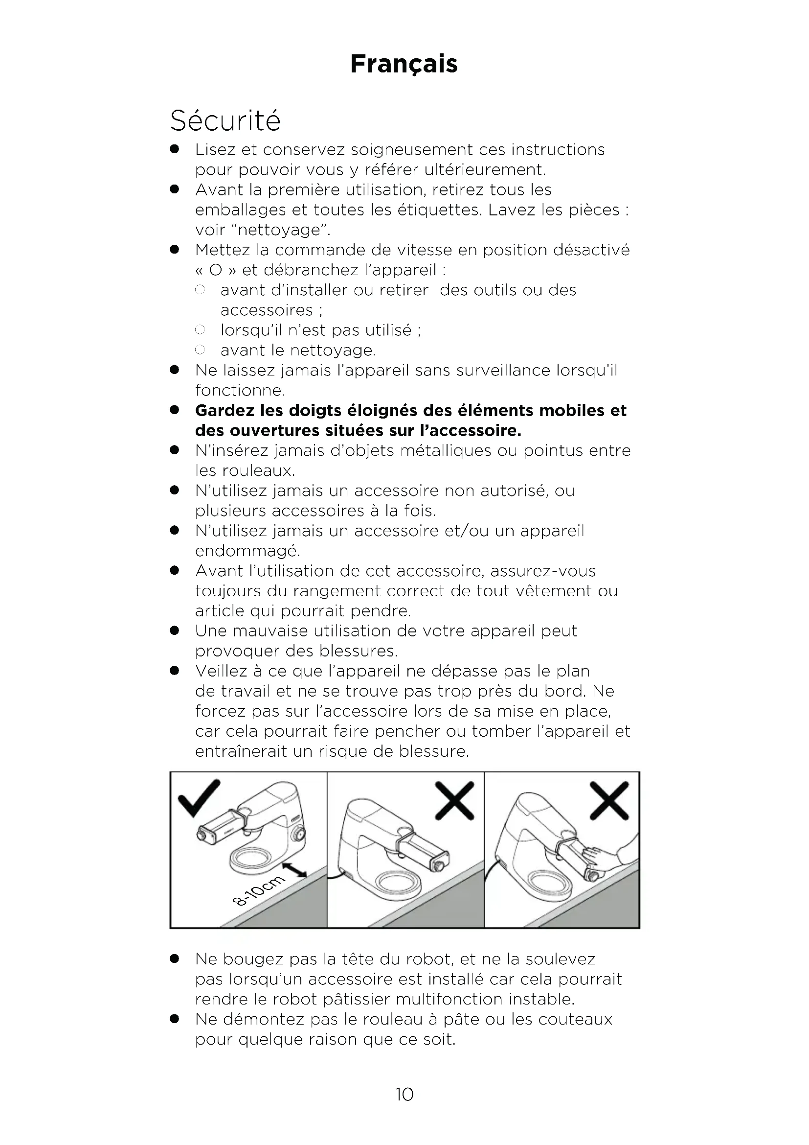 Veillez à ce que l’appareil ne dépasse pas le plan de travail et ne se trouve pas trop près du bord. Ne forcez pas sur l’accessoire lors de sa mise en place, car cela pourrait faire pencher ou tomber l’appareil et entraînerait un risque de blessure. 8-10cm