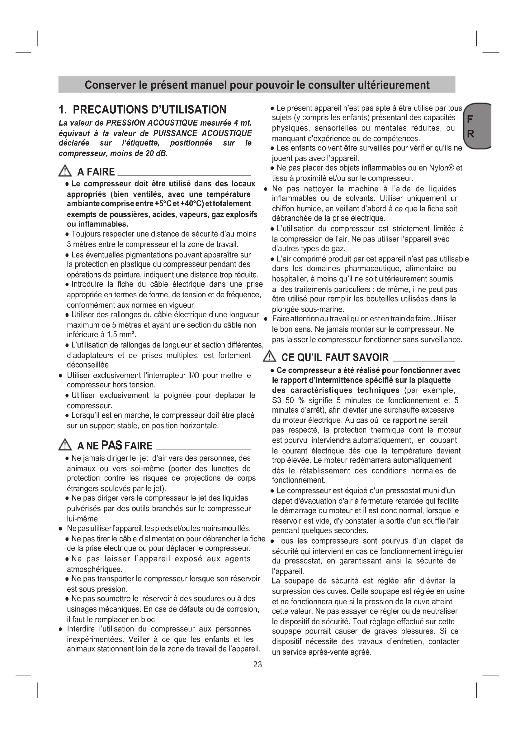 ● Ce compresseur a été réalisé pour fonctionner avec le rapport d’intermittence spécié sur la plaquette des caractéristiques techniques (par exemple, S3 50 % signie 5 minutes de fonctionnement et 5 minutes d’arrêt), an d’éviter une surchauffe excessive du moteur électrique. Au cas où ce rapport ne serait pas respecté, la protection thermique dont le moteur est pourvu interviendra automatiquement, en coupant le courant électrique dès que la température devient trop élevée. Le moteur redémarrera automatiquement dès le rétablissement des conditions normales de fonctionnement. ● Le compresseur est équipé d'un pressostat muni d'un clapet d'évacuation d'air à fermeture retardée qui facilite le démarrage du moteur et il est donc normal, lorsque le réservoir est vide, d'y constater la sortie d'un soufe l'air pendant quelques secondes. ● Tous les compresseurs sont pourvus d’un clapet de sécurité qui intervient en cas de fonctionnement irrégulier du pressostat, en garantissant ainsi la sécurité de l’appareil. La soupape de sécurité est réglée an d’éviter la surpression des cuves. Cette soupape est réglée en usine et ne fonctionnera que si la pression de la cuve atteint cette valeur. Ne pas essayer de régler ou de neutraliser le dispositif de sécurité. Tout réglage effectué sur cette soupape pourrait causer de graves blessures. Si ce dispositif nécessite des travaux d’entretien, contacter un service après-vente agréé. Conserver le présent manuel pour pouvoir le consulter ultérieurementF
