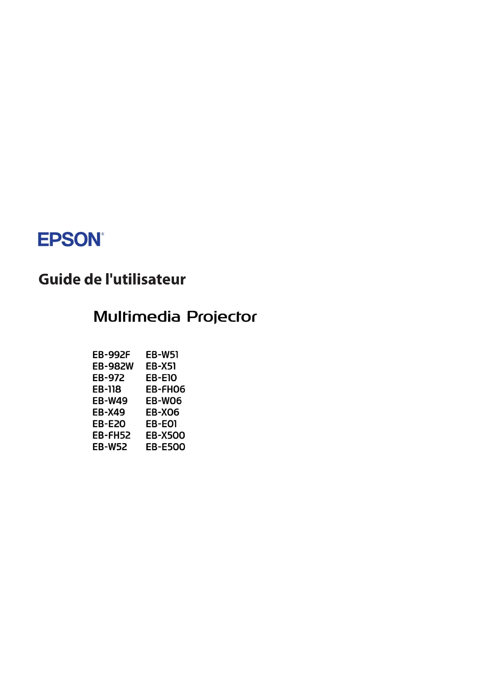 ockage -10 à +60°C (Humidité de 10 à 90 %, sans condensation) Poids EB‑972: Env iron 3,1 kg EB‑118: Environ 2,8 kg EB‑X49/EB‑E20: Environ 2,7 kg EB‑X51/EB‑X06/EB‑X500: Environ 2,5 kg EB‑E10/EB‑E01/EB‑E500: Environ 2,4 kg