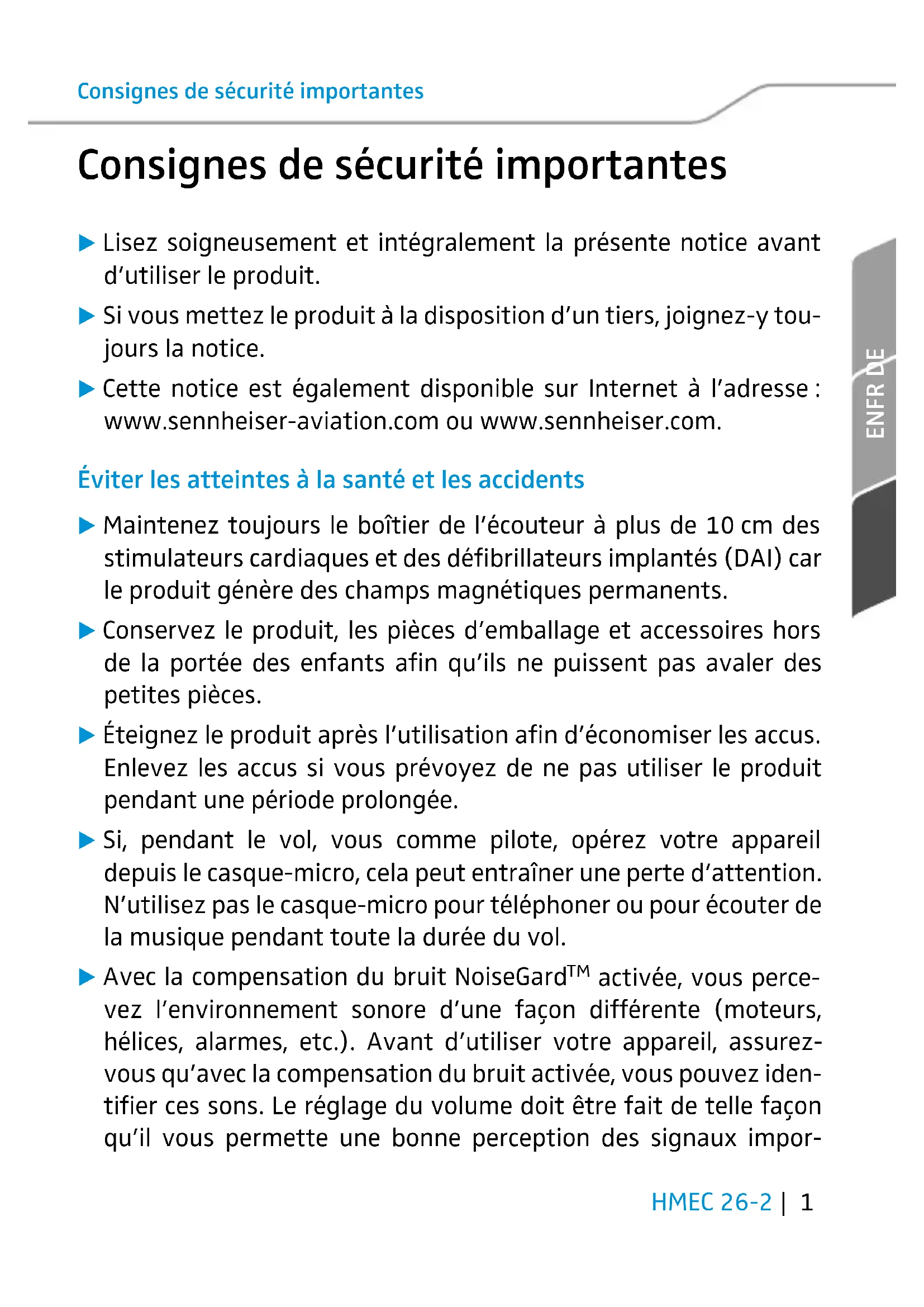 are registered trademarks of Sennheiser electronic GmbH & Co. KG. Other product and company names mentioned in this instruction manual may be the trademarks or registered trademarks of their respective owners. Europe EMC EN 55103-1/-2 ChinaENFR DE Consignes de sécurité importantes HMEC 26-2 |1 Consignes de sécurité importantes 왘 Lisez soigneusement et intégralement la présente notice avant d’utiliser le produit. 왘 Si vous mettez le produit à la disposition d’un tiers, joignez-y tou- jours la notice. 왘 Cette notice est également disponible sur Internet à l’adresse : www.sennheiser-aviation.com ou www.sennheiser.com. Éviter les atteintes à la santé et les accidents 왘 Maintenez toujours le boîtier de l’écouteur à plus de 10 cm des stimulateurs cardiaques et des défibrillateurs implantés (DAI) car le produit génère des champs magnétiques permanents. 왘 Conservez le produit, les pièces d’emballage et accessoires hors de la portée des enfants afin qu’ils ne puissent pas avaler des petites pièces. 왘 Éteignez le produit après l’utilisation afin d’économiser les accus. Enlevez les accus si vous prévoyez de ne pas utiliser le produit pendant une période prolongée. 왘 Si, pendant le vol, vous comme pilote, opérez votre appareil depuis le casque-micro, cela peut entraîner une perte d’attention. N’utilisez pas le casque-micro pour téléphoner ou pour écouter de la musique pendant toute la durée du vol. 왘 Avec la compensation du bruit NoiseGard