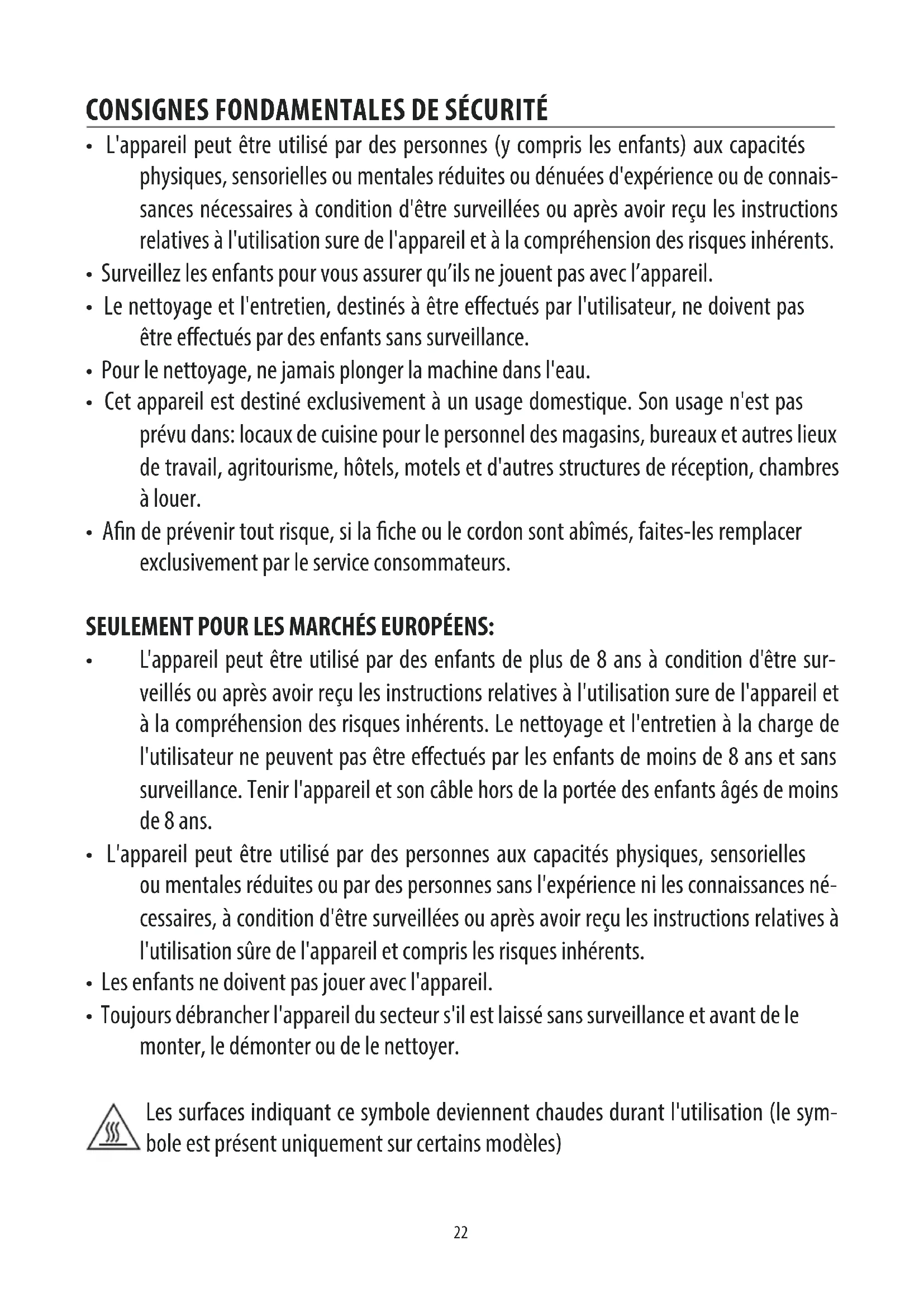 - Toujours débrancher l'appareil du secteur s'il est laissé sans surveillance et avant de le monter, le démonter ou de le nettoyer. Les surfaces indiquant ce symbole deviennent chaudes durant l'utilisation (le sym- bole est présent uniquement sur certains modèles)23