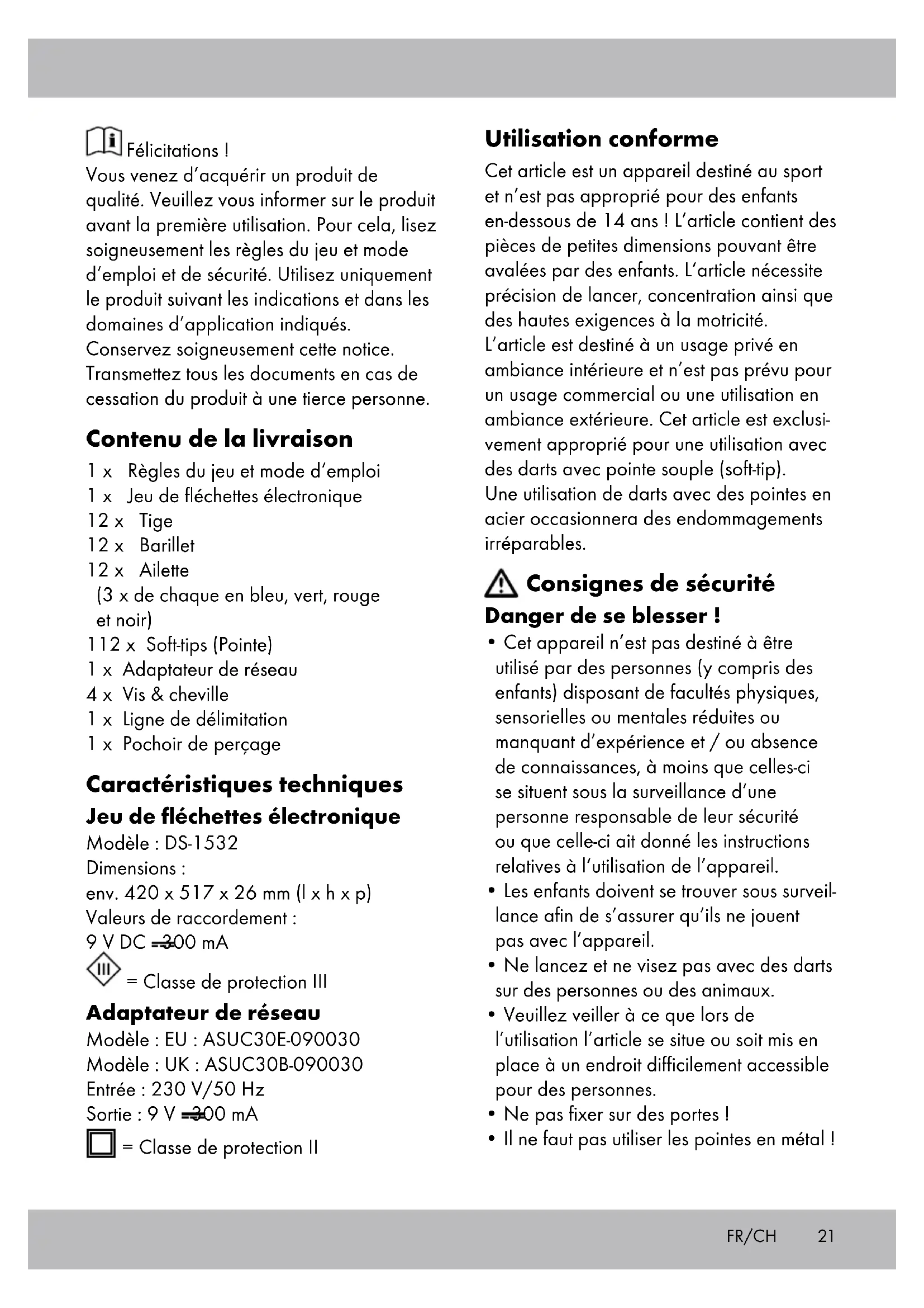 - Utilisez l’adaptateur uniquement en relation avec le Dartboard DS-1532.