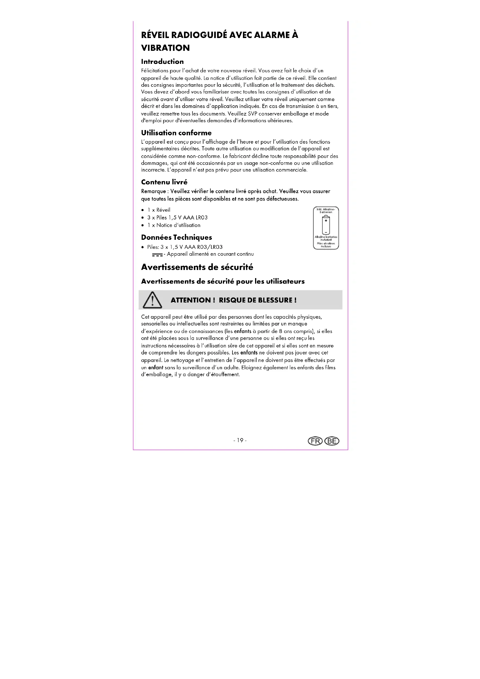 VIBRATION Introduction Félicitations pour l’achat de votre nouveau réveil. Vous avez fait le choix d’un appareil de haute qualité. La notice d’utilisation fait partie de ce réveil. Elle contient des consignes importantes pour la sécurité, l’utilisation et le traitement des déchets. Vous devez d’abord vous familiariser avec toutes les consignes d’utilisation et de sécurité avant d’utiliser votre réveil. Veuillez utiliser votre réveil uniquement comme décrit et dans les domaines d’application indiqués. En cas de transmission à un tiers, veuillez remettre tous les documents. Veuillez SVP conserver emballage et mode d'emploi pour d'éventuelles demandes d'informations ultérieures. Utilisation conforme L’appareil est conçu pour l’affichage de l’heure et pour l’utilisation des fonctions supplémentaires décrites. Toute autre utilisation ou modification de l’appareil est considérée comme non-conforme. Le fabricant décline toute responsabilité pour des dommages, qui ont été occasionnés par un usage non-conforme ou une utilisation incorrecte. L’appareil n’est pas prévu pour une utilisation commerciale. Contenu livré Remarque : Veuillez vérifier le contenu livré après achat. Veuillez vous assurer que toutes les pièces sont disponibles et ne sont pas défectueuses. 1 x Réveil 3 x Piles 1,5 V AAA LR03 1 x Notice d‘utilisation Données Techniques Piles: 3 x 1,5 V AAA R03/LR03 - Appareil alimenté en courant continu Avertissements de sécurité Avertissements de sécurité pour les utilisateurs