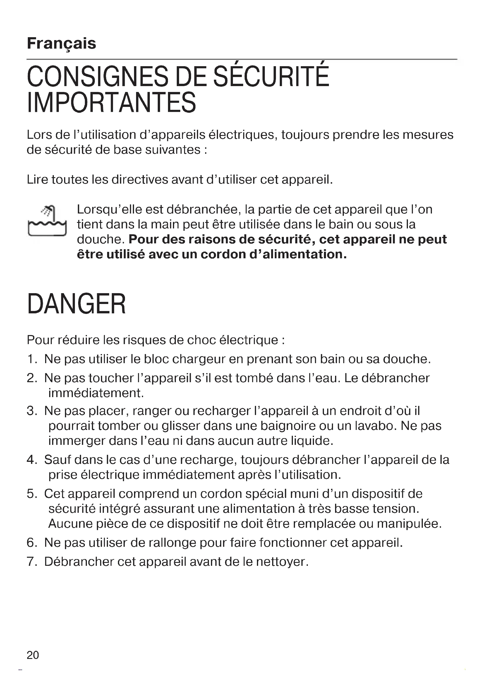 IMPORTANTES Lors de l’utilisation d’appareils électriques, toujours prendre les mesures de sécurité de base suivantes : Lire toutes les directives avant d’utiliser cet appareil. Lorsqu’elle est débranchée, la partie de cet appareil que l’on tient dans la main peut être utilisée dans le bain ou sous la douche. Pour des raisons de sécurité, cet appareil ne peut être utilisé avec un cordon d’alimentation. DANGER Pour réduire les risques de choc électrique :