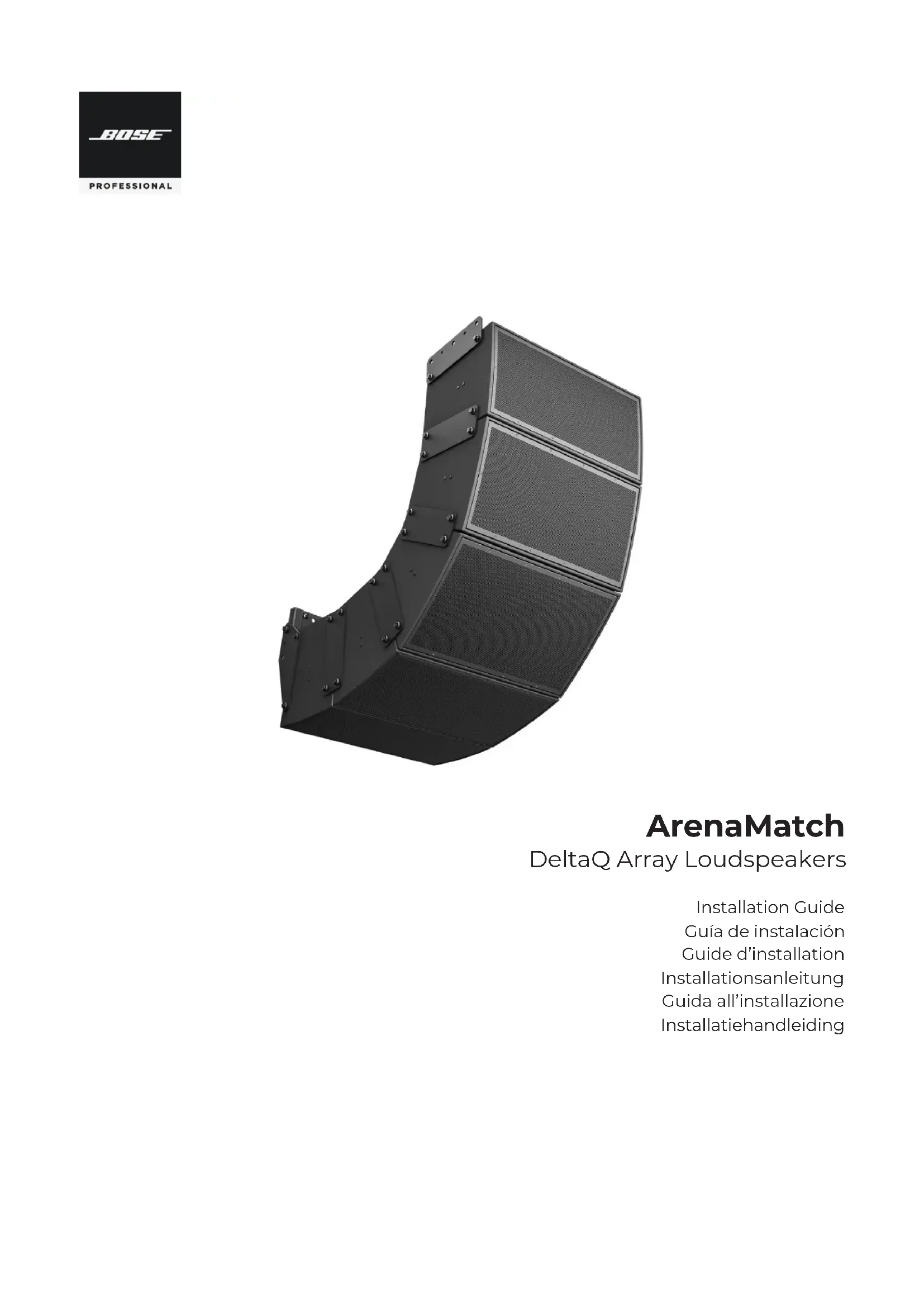 - Las inserciones roscadas M6 y M10 están fabricadas con acero inoxidable. La exposición al cloro puede provocar corrosión en las inserciones roscadas M6 y M10, el cual puede no detectarse por medio de una inspección anual y generar un peligroso riesgo de caída. Por lo tanto, no suspenda los altavoces ArenaMatch con inserciones de acero inoxidable M6 y M10 en entornos donde haya presencia de cloro, como piscinas techadas, parques acuáticos techados, jacuzzis, saunas y salas de vapor.BoseProfessional.com ArenaMatch DeltaQ Array Loudspeaker • Guide d’installation4 • Français Instructions importantes relatives à la sécurité Merci de lire et de conserver le manuel d’instruction et de respecter les consignes de sécurité. Ce produit doit être installé par un technicien professionnel ! Ce document est destiné à fournir aux techniciens professionnels les directives de montage et de sécurité relatives à ce produit dédié à une installation xe. Veuillez lire ce document, ainsi que l’ensemble des avertissements de sécurité avant de procéder à l’installation. Ne tentez pas de réparer ce produit vous-même. Conez toutes les opérations de maintenance à des centres de service, installateurs, techniciens, revendeurs ou distributeurs agréés. Pour contacter Bose Professional ou pour trouver un revendeur ou un distributeur près de chez vous, rendez-vous à l’adresse BoseProfessional.com. Informations réglementaires Ce produit est conforme à toutes les directives de la Communauté Européenne qui s’y appliquent. L’attestation complète de conformité est disponible à l’adresse BoseProfessional.com. Ce produit est conforme à toutes les réglementations de 2016 en matière de compatibilité électromagnétique et à toutes les autres réglementations britanniques applicables. L’attestation complète de conformité est disponible à l’adresse BoseProfessional.com Ce symbole signie que le produit ne doit pas être jeté avec les déchets ménagers, mais doit être déposé dans un centre de collecte approprié pour recyclage. La mise au rebut adéquate et le recyclage permettent de protéger les ressources naturelles, la santé humaine et l’environnement. Pour plus d’informations sur l’élimination et le recyclage de ce produit, contactez votre mairie, votre service d’enlèvement des ordures ou le magasin où vous avez acheté ce produit. Date de fabrication : Le huitième chiffre du numéro de série indique l’année de fabrication ; par exemple, « 7 » correspond à 2007 ou à 2017. Importateur pour l’UE : Transom Post Netherlands B.V., Keizersgracht 391A, 1016 EJ, Amsterdam | Importateur pour le Royaume-Uni : Transom Post Netherlands UK, Squires House 205a High Street, West Wickham, BR4 0PH | Importateur pour le Japon : Transom Post International Japan KK Co., Ltd. PMO Tamachi IV Shiba5-29-19, Minato-ku, Tokyo | Importateur pour l’Australie : Transom Post Australia Pty. Ltd., Level 14, 60 Margaret Street, Sydney, NSW 2000 | Importateur pour la Chine : Transom Post (Shanghai) Audio Co. Ltd Room 2209, Building 1, 175 Longyao Road, Xuhui District, Shanghai | Importateur pour le Mexique : POST INTL MEXICO, S. DE R.L. DE C.V. Insurgentes Sur No. 1079, 1st oor, Colonia Noche Buena, Benito Juárez, C.P. 03270, Mexico City | Importateur pour les Émirats arabes unis : 102 A, Sama Tower Sheikh Zayed Road, Dubai UAE Bose est une marque commerciale de Bose Corporation. ArenaMatch, DeltaQ, PowerMatch et ControlSpace sont des marques déposées de Transom Post OpCo LLC. Bose Professional, 117 South St, Hopkinton, MA 01748 USA ©2024 Transom Post OpCo LLC. Toute reproduction, modication, distribution ou autre utilisation, même partielle, de ce document est interdite sans autorisation écrite préalable. Informations relatives à la garantie Cet appareil est couvert par une garantie limitée. Pour en savoir plus sur la garantie, consultez la page BoseProfessional.com/ Warranty.