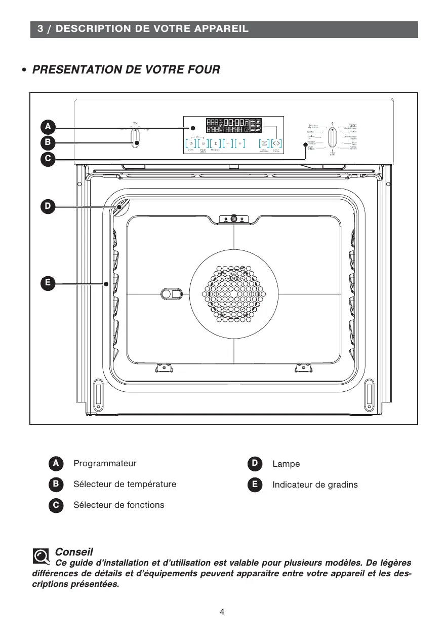 Ce guide d'installation et d'utilisation est valable pour plusieurs modèles. De légères différences de détails et dépêpements peuvent apparaître entre votre apparéil et les descriptions générées.