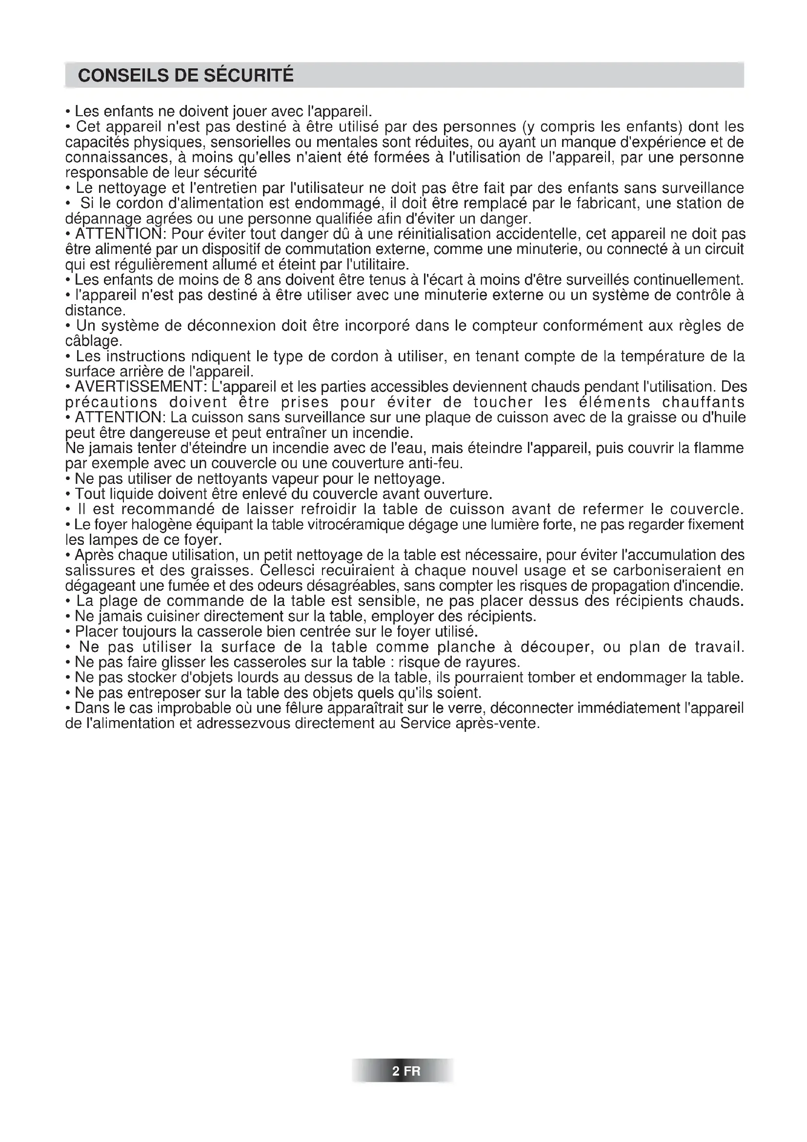 - ARRET GENERAL Le fonctionnement des foyers et de la minuterie peut être stoppé à tout moment par une pression sur la touche Marche-Arrêt.ASSISTANCE TECHNIQUE Avant d’appeler le Service d’Assistance Technique Si la table de cuisson ne fonctionne pas, nous vous conseillons de: — vérifier que la fiche soit bien introduite dans la prise de courant; Si la cause du dysfonctionnement n’est pas trouvée: — éteindre l’appareil ne pas y toucher et appeler le Service d’Assistance Technique. Veillez à ce que le coupon de garantie fourni avec le produit soit correctement rempli, avec la date d’achat de la table de cuisson. NOTA : - Eviter d'employer une éponge trop humide. - Ne jamais utiliser un outil en acier tel que couteau ou tournevis. - L'utilisation du grattoir avec lame de rasoir ne peut endommager la surface si un angle de 30°est respectée. - Ne pas laisser le racloir avec lame de rasoir à la portée des enfants. - Ne pas utiliser de produits abrasifs ou de poudres récurantes.