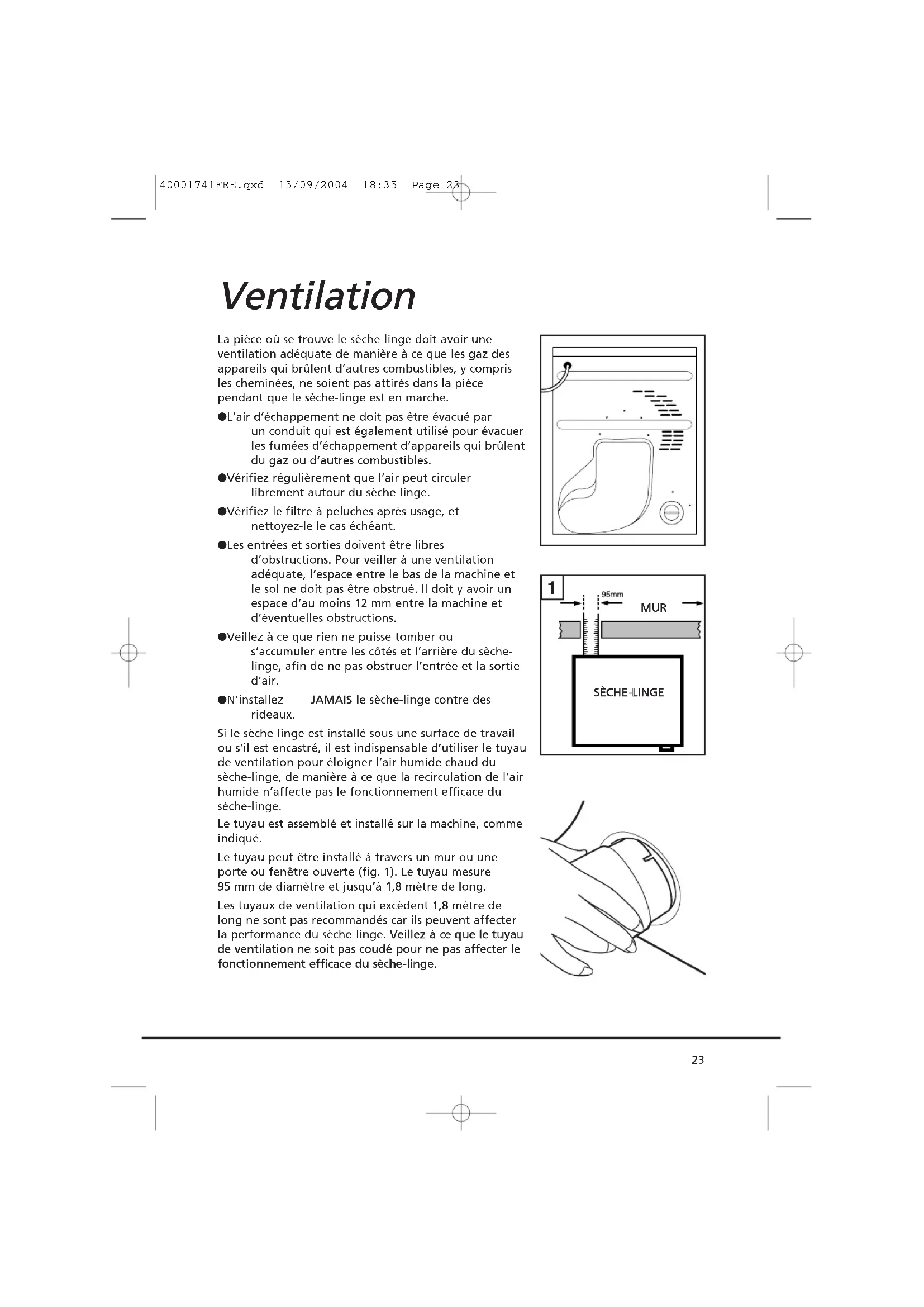 IInnssttaallllaattiioonn UUnn aappppeell ddee sseerrvviiccee ppeeuutt vvoouuss êêttrree ffaaccttuurréé ssii llaa ddééffaaiillllaannccee ddee vvoottrree aappppaarreeiill eesstt ccaauussééee ppaarr uunnee iinnssttaallllaattiioonn iinnccoorrrreeccttee.. SSii llee ccoorrddoonn éélleeccttrriiqquuee ddee cceett aappppaarreeiill eesstt eennddoommmmaaggéé,, iill ddooiitt êêttrree rreemmppllaaccéé ppaarr uunn ccoorrddoonn ssppéécciiaall qquuii eesstt UUNNIIQQUUEEMMEENNTT ddiissppoonniibbllee aauupprrèèss dduu sseerrvviiccee ddeess ppiièècceess ddee rreecchhaannggee.. IIll ddooiitt êêttrree iinnssttaalllléé ppaarr uunnee ppeerrssoonnnnee ccoommppéétteennttee.. NNee bbrraanncchheezz ppaass ll’’aappppaarreeiill eett nnee mmeetttteezz ppaass eenn mmaarrcchhee ll’’iinntteerrrruupptteeuurr ddee sseecctteeuurr ttaanntt qquuee ll’’iinnssttaallllaattiioonn nn’’eesstt ppaass tteerrmmiinnééee.. PPaarr mmeessuurree ddee ssééccuurriittéé,, vveeiilllleezz àà iinnssttaalllleerr ccee ssèècchhee--lliinnggee ccoorrrreecctteemmeenntt.. EEnn ccaass ddee ddoouuttee ccoonncceerrnnaanntt ssoonn iinnssttaallllaattiioonn,, vveeuuiilllleezz ddeemmaannddeerr ccoonnsseeiill àà GGIIAASS SSeerrvviiccee.. 40001741FRE.qxd 15/09/2004 18:35 Page 22La pièce où se trouve le sèche-linge doit avoir une ventilation adéquate de manière à ce que les gaz des appareils qui brûlent d’autres combustibles, y compris les cheminées, ne soient pas attirés dans la pièce pendant que le sèche-linge est en marche. ● L’air d’échappement ne doit pas être évacué par un conduit qui est également utilisé pour évacuer les fumées d’échappement d’appareils qui brûlent du gaz ou d’autres combustibles. ● Vérifiez régulièrement que l’air peut circuler librement autour du sèche-linge. ● Vérifiez le filtre à peluches après usage, et nettoyez-le le cas échéant. ● Les entrées et sorties doivent être libres d’obstructions. Pour veiller à une ventilation adéquate, l’espace entre le bas de la machine et le sol ne doit pas être obstrué. Il doit y avoir un espace d’au moins 12 mm entre la machine et d’éventuelles obstructions. ● Veillez à ce que rien ne puisse tomber ou s’accumuler entre les côtés et l’arrière du sèche- linge, afin de ne pas obstruer l’entrée et la sortie d’air. ● N’installez JJAAMMAAIISS le sèche-linge contre des rideaux. Si le sèche-linge est installé sous une surface de travail ou s’il est encastré, il est indispensable d’utiliser le tuyau de ventilation pour éloigner l’air humide chaud du sèche-linge, de manière à ce que la recirculation de l’air humide n’affecte pas le fonctionnement efficace du sèche-linge. Le tuyau est assemblé et installé sur la machine, comme indiqué. Le tuyau peut être installé à travers un mur ou une porte ou fenêtre ouverte (fig. 1). Le tuyau mesure 95 mm de diamètre et jusqu’à 1,8 mètre de long. Les tuyaux de ventilation qui excèdent 1,8 mètre de long ne sont pas recommandés car ils peuvent affecter la performance du sèche-linge. VVeeiilllleezz àà ccee qquuee llee ttuuyyaauu ddee vveennttiillaattiioonn nnee ssooiitt ppaass ccoouuddéé ppoouurr nnee ppaass aaffffeecctteerr llee ffoonnccttiioonnnneemmeenntt eeffffiiccaaccee dduu ssèècchhee--lliinnggee..