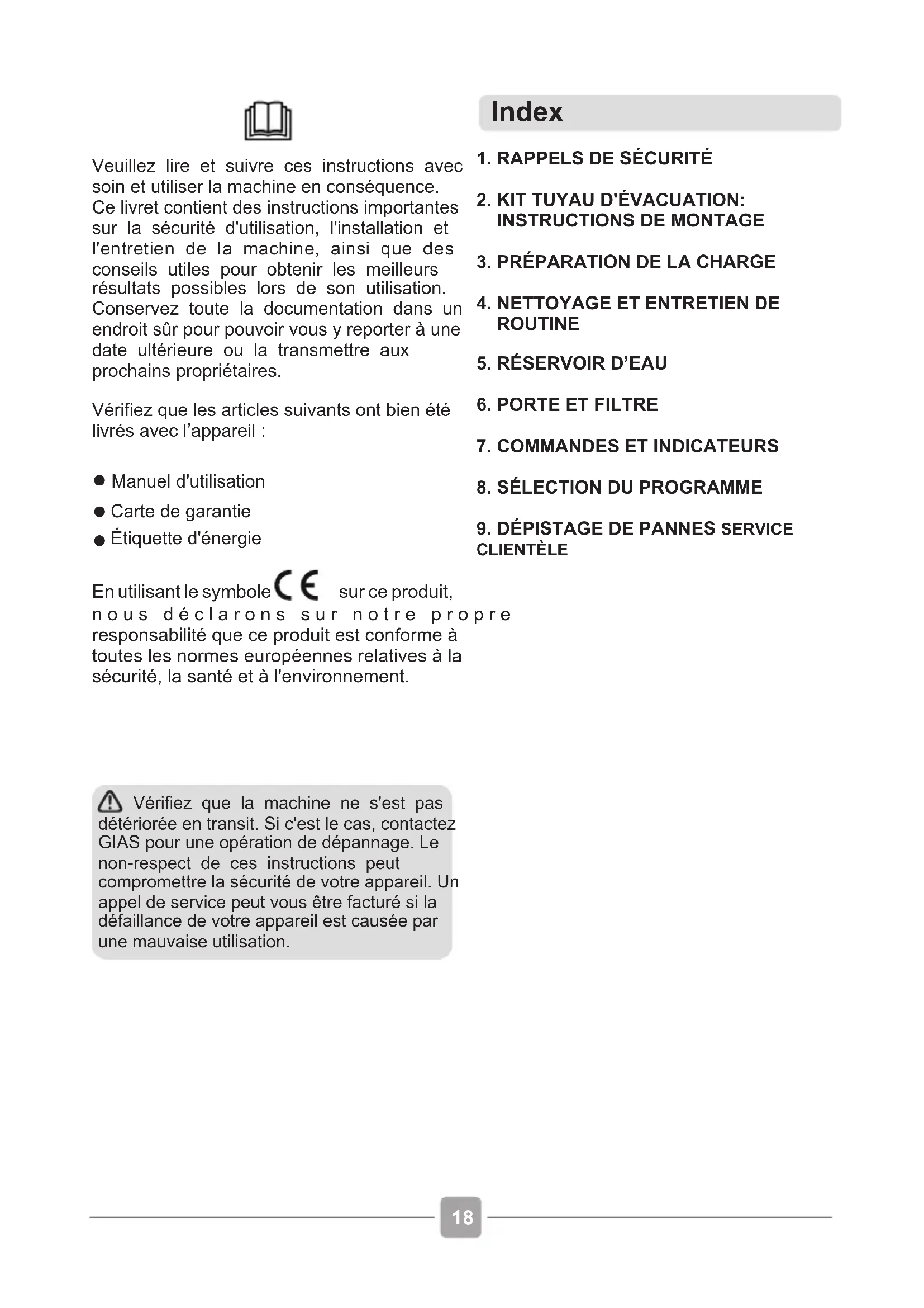 Carte de garantie Étiquette d'énergie En utlsant le symbole sur ce produt, n o u s d é c l a r o n s s u r n o t r e p r o p r e responsablté que ce produt est conforme à toutes les normes européennes relatves à la sécurté, la santé et à l'envronnement.Vérifiez que la machine ne s'est pas détériorée en transit. Si c'est le cas, contactez GIAS pour une opération de dépannage. Le non-respect de ces instructions peut compromettre la sécurité de votre appareil. Un appel de service peut vous être facturé si la défaillance de votre appareil est causée par une mauvaise utilisation.1.