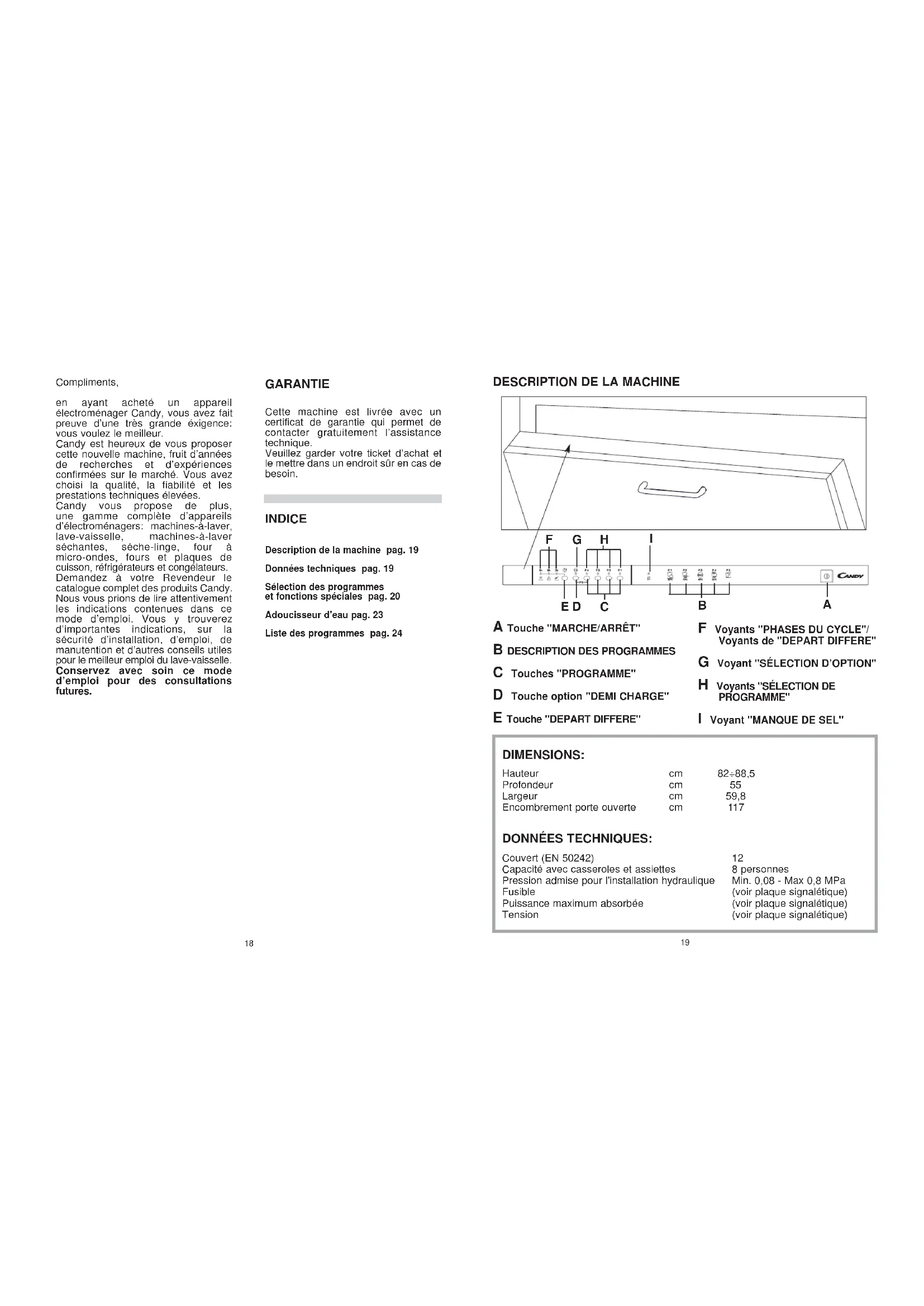 Compliments, en ayant acheté un appareil électroménager Candy, vous avez fait preuve d’une très grande éxigence: vous voulez le meilleur. Candy est heureux de vous proposer cette nouvelle machine, fruit d’années de recherches et d’expériences confirmées sur le marché. Vous avez choisi la qualité, la fiabilité et les prestations techniques élevées. Candy vous propose de plus, une gamme complète d’appareils d’électroménagers: machines-à-laver, lave-vaisselle, machines-à-laver séchantes, séche-linge, four à micro-ondes, fours et plaques de cuisson, réfrigérateurs et congélateurs. Demandez à votre Revendeur le catalogue complet des produits Candy. Nous vous prions de lire attentivement les indications contenues dans ce mode d’emploi. Vous y trouverez d’importantes indications, sur la sécurité d’installation, d’emploi, de manutention et d’autres conseils utiles pour le meilleur emploi du lave-vaisselle. Conservez avec soin ce mode d’emploi pour des consultations futures. GARANTIE Cette machine est livrée avec un certificat de garantie qui permet de contacter gratuitement l’assistance technique. Veuillez garder votre ticket d’achat et le mettre dans un endroit sûr en cas de besoin. INDICE Description de la machine pag. 19 Données techniques pag. 19 Sélection des programmes et fonctions spéciales pag. 20 Adoucisseur d’eau pag. 23 Liste des programmes pag. 2421 ATTENTION! Avant de démarrer un nouveau programme, veuillez contrôler la présence de lessive dans le compartiment. Si nécessaire, remplir le compartiment. En cas de coupure de courant pendant un programme de lavage, une mémoire spéciale restaure le programme sélectionné et, lorsque le courant est rétabli, reprend le cycle là où il s'est arrêté. Déroulement du programme Pendant le déroulement du programme, le voyant du cycle reste fixement éclairé et les 3 voyants de visualisation "PHASES DU CYCLE" (correspondants à "LAVAGE" , "RINÇAGE" et "SÉCHAGE" ) s’éclairent séparément et en séquence pour indiquer la phase en cours. Fin du programme La fin du programme est signalée par un signal acoustique (s’il est activé) de 5 secondes, répété 3 fois toutes les 30 secondes. Les voyants de visualisation "PHASES DU CYCLE" s'éteint et celui correspondant au programme “conseillé” commence à clignoter. Vous pouvez alors sortir la vaisselle propre et éteindre le lave-vaisselle en appuyant sur la touche "MARCHE/ARRÊT" ou effectuer un nouveau chargement pour un nouveau cycle de lavage. Touche option Touche "DEMI CHARGE" En réponse à vos attentes quotidiennes en matière de lavage, ce lave-vaisselle est équipé, en plus des programmes habituels, d’une fonction "DEMI CHARGE". Cette fonction permet aux utilisateurs de laver un nombre réduit de vaisselle pouvant se trouver indifféremment dans le panier supérieur et/ou le panier inférieur de l’appareil. Quand cette fonction est activée, le lave-vaisselle consomme automatiquement moins d'eau et d'énergie et il réduit la durée du cycle de lavage. Dans ce mode "DEMI CHARGE", il convient de réduire la quantité de détergent utilisé. Touche "DEPART DIFFERE" Cette touche permet de retarder le démarrage du cycle de lavage de 3, 6 ou 9 heures. Pour configurer le départ différé, procédez de la manière suivante: ■ Appuyez sur la touche "DEPART DIFFERE" (à chaque pression correspond respectivement la configuration retardée de 3, 6 ou 9 heures et le voyant correspondant au retard choisi s’éclaire fixement). ■ Pour démarrer le décompte, appuyez sur la touche du programme choisi (le voyant correspondant s'éclaire fixement, tandis que celui de la durée configurée cesse d’être éclairé fixement et commence à clignoter). Si vous configurez un départ différé de 9 heures, le décompte du temps est signalé par les voyants 6h et 3h qui s’éclairent et indiquent le temps restant. Au terme des 3 dernières heures (à la fin du décompte) le voyant 3h cesse de clignoter et s’éclaire fixement pour signaler que la phase de lavage et le programme se déclencheront automatiquement. Si le décompte n’est pas achevé et que le programme n’est donc pas encore parti, vous pouvez modifier ou annuler le départ différé, choisir un autre programme ou sélectionner/désélectionner la touche option, en procédant de la manière suivante: ■ Appuyez pendant au moins 5 secondes sur la touche du programme choisi. Les voyants des programmes (sauf celui du programme "RAPIDE") clignotent. ■ Le programme choisi s'annule et le voyant correspondant au programme "conseillé" commence à clignoter.